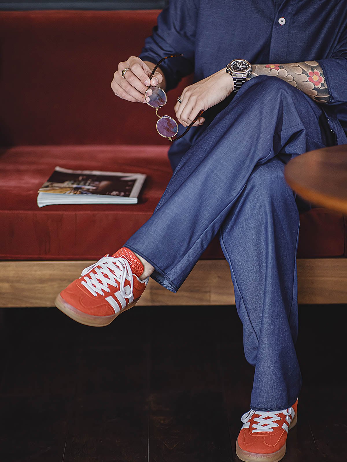 こちらのパンツは、伝統的な「ピートスーツ」にインスピレーションを受けた現代的なアプローチを取り入れています。綺麗なドレープが特徴のTR生地を使用し、立ち姿が綺麗で、座った際にもシワになりにくいのが特徴です。
