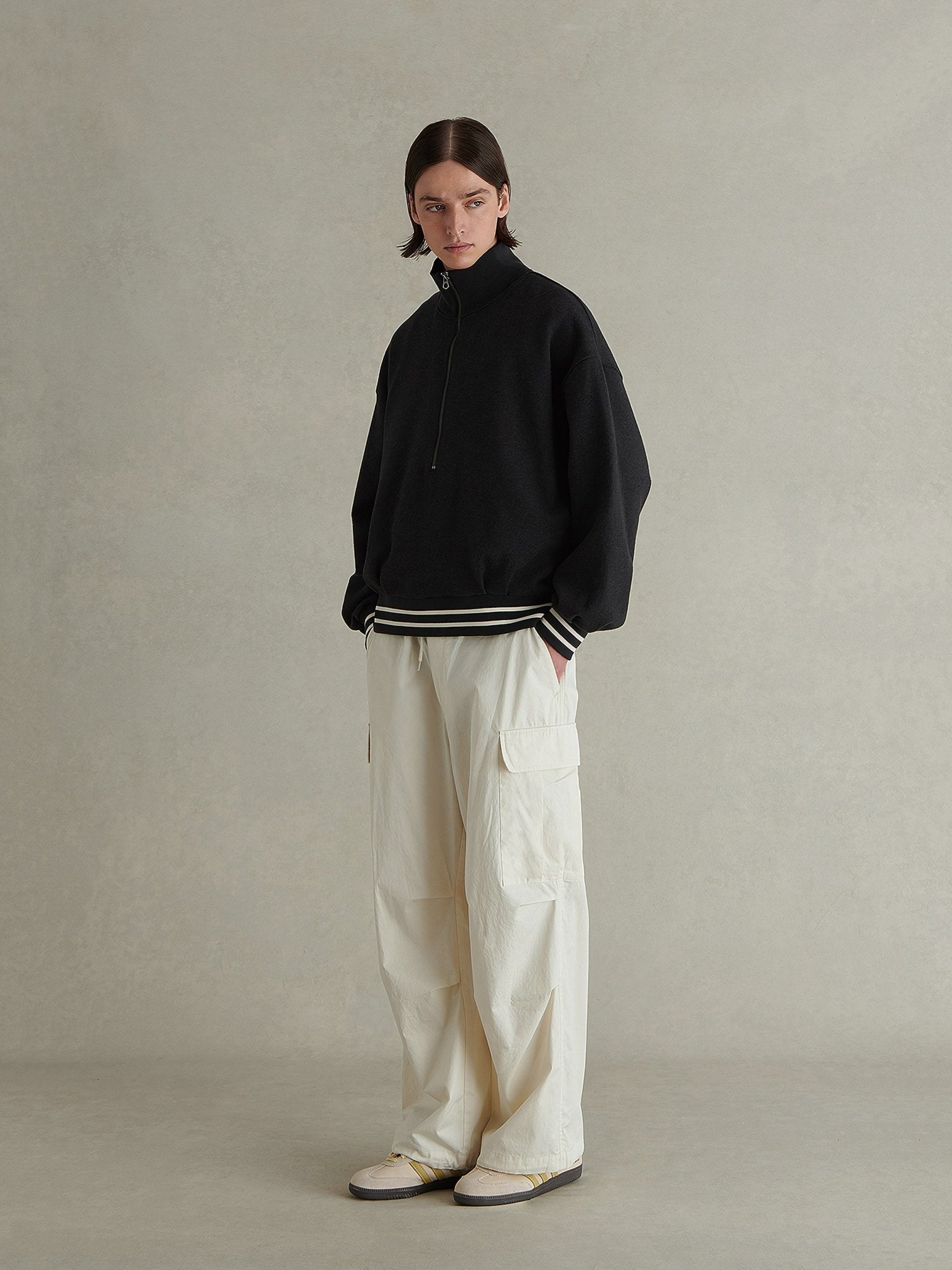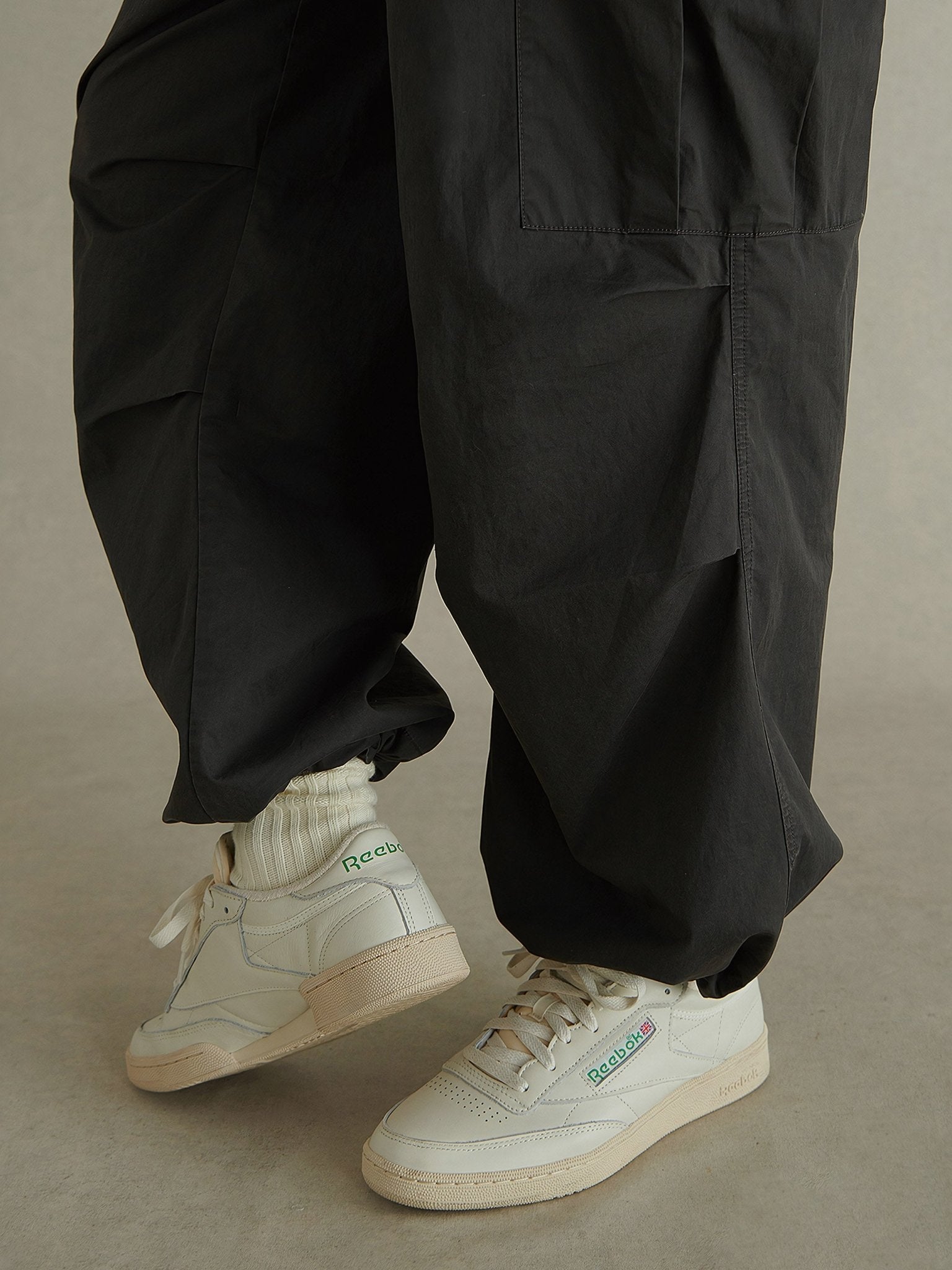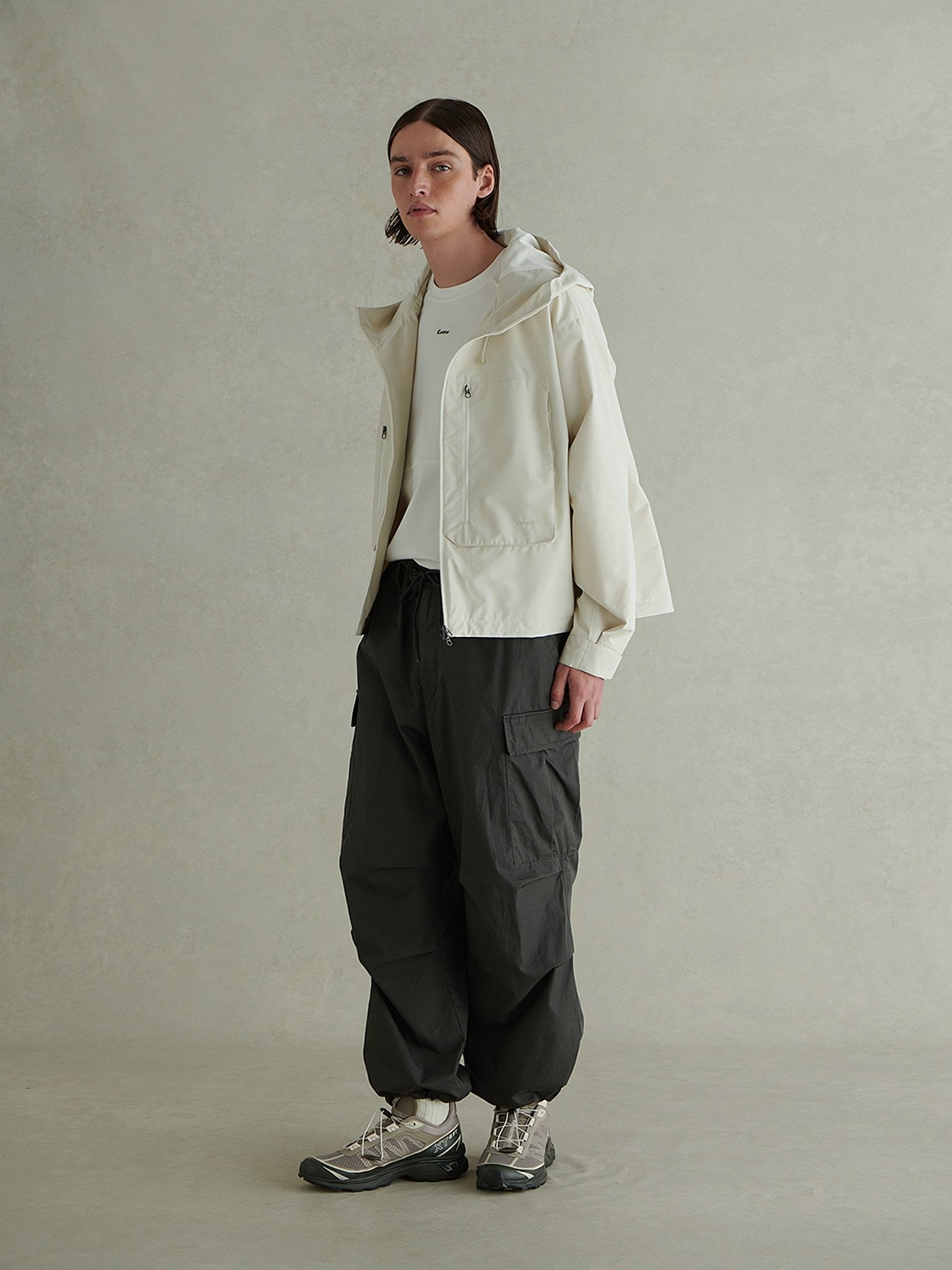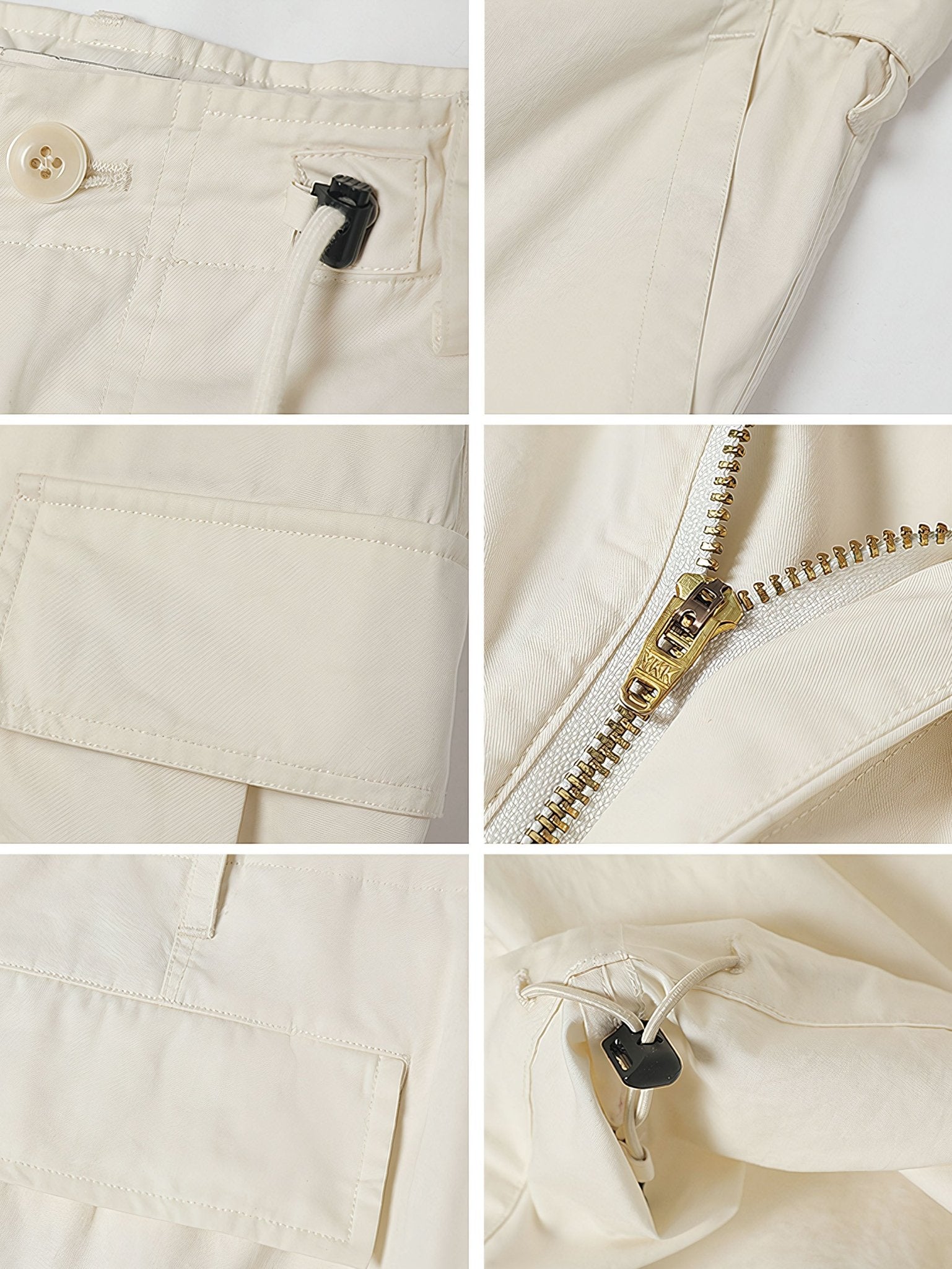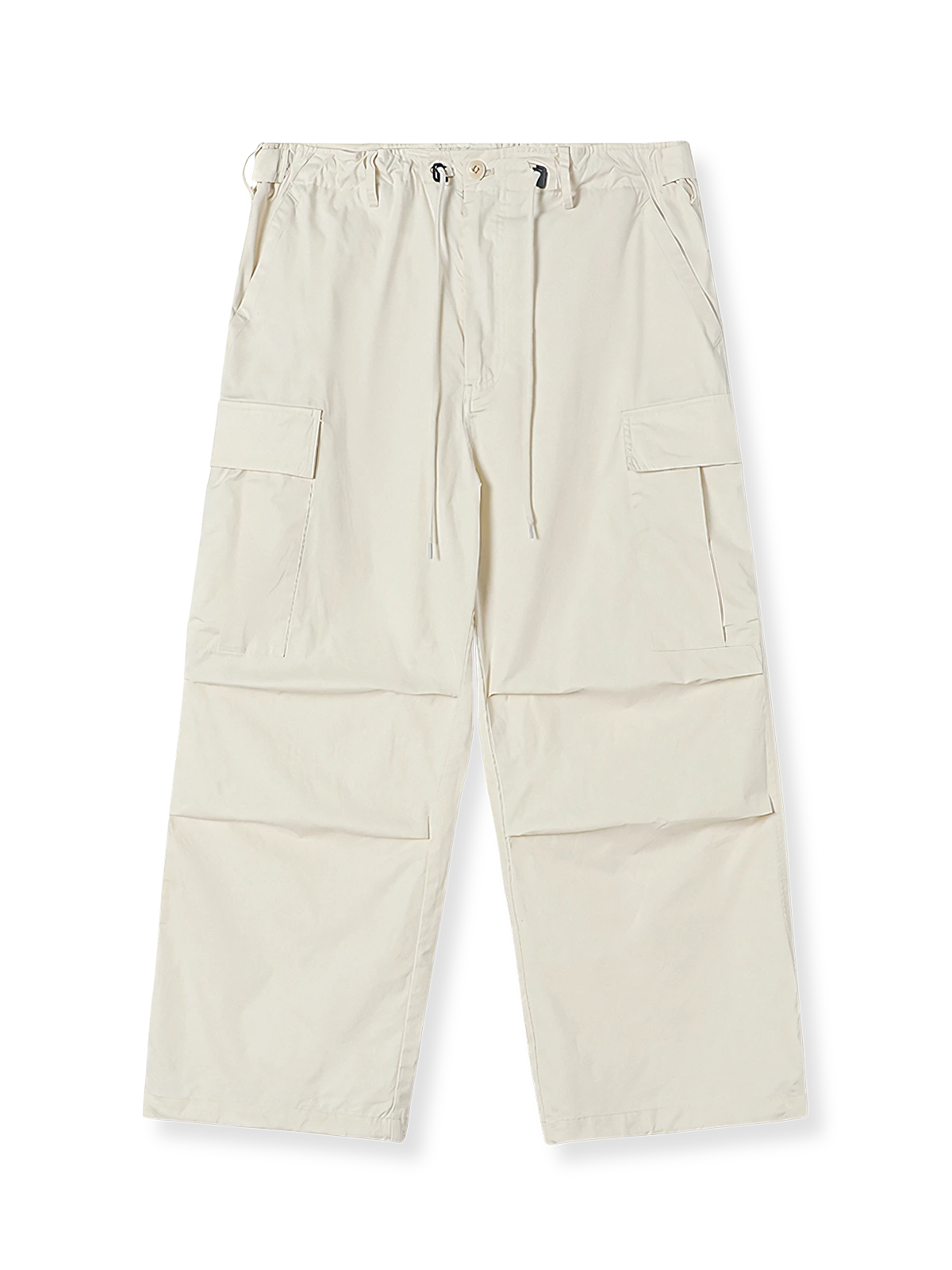 ウエストと裾にはインポートのバックルを備えたドローコードを追加し、動きやすさを備えた大型の工字型ポケットが両膝に配置されています。