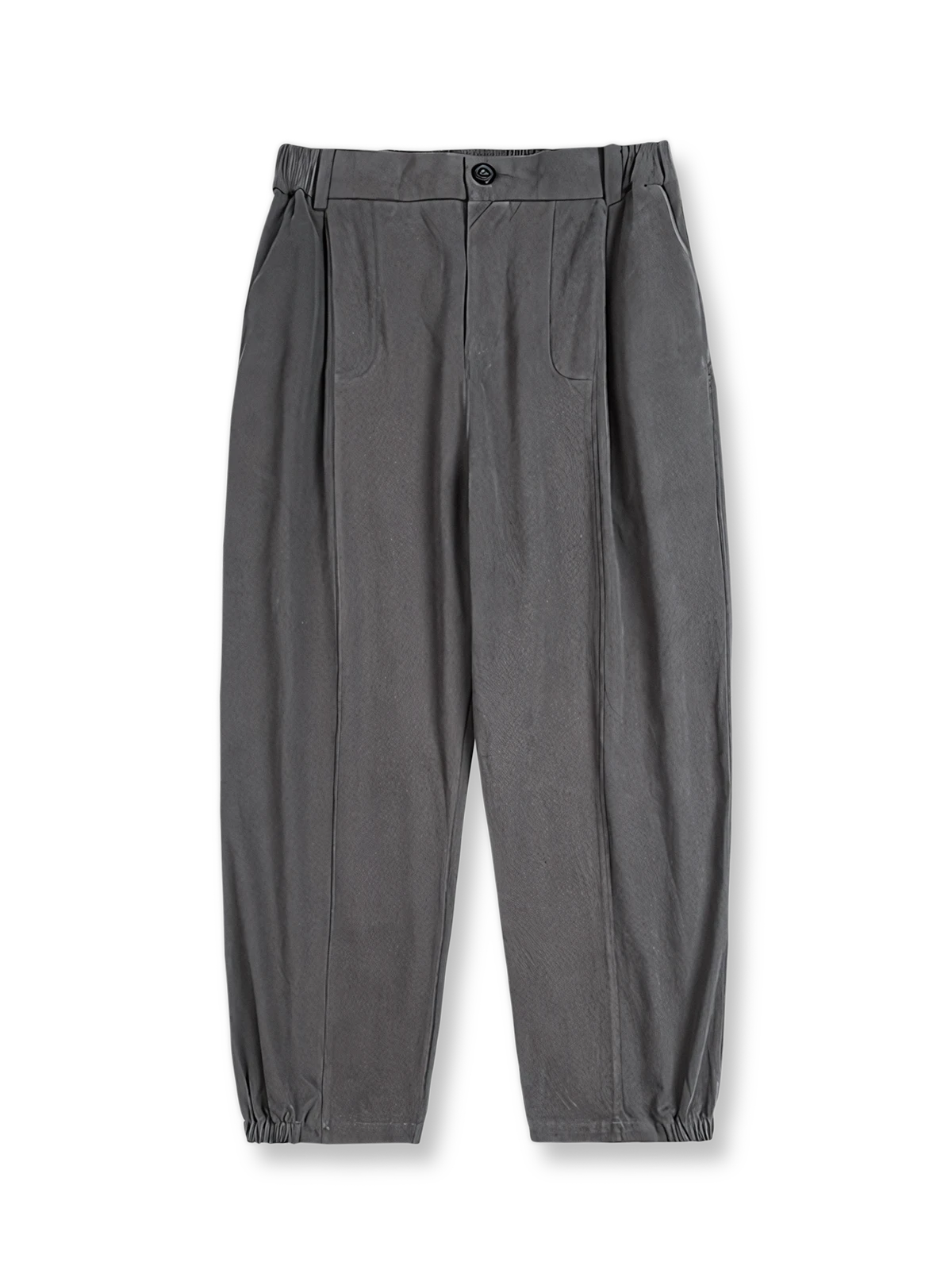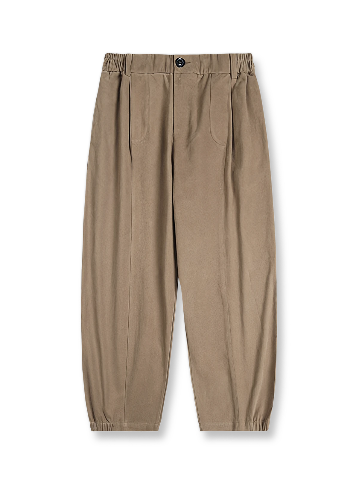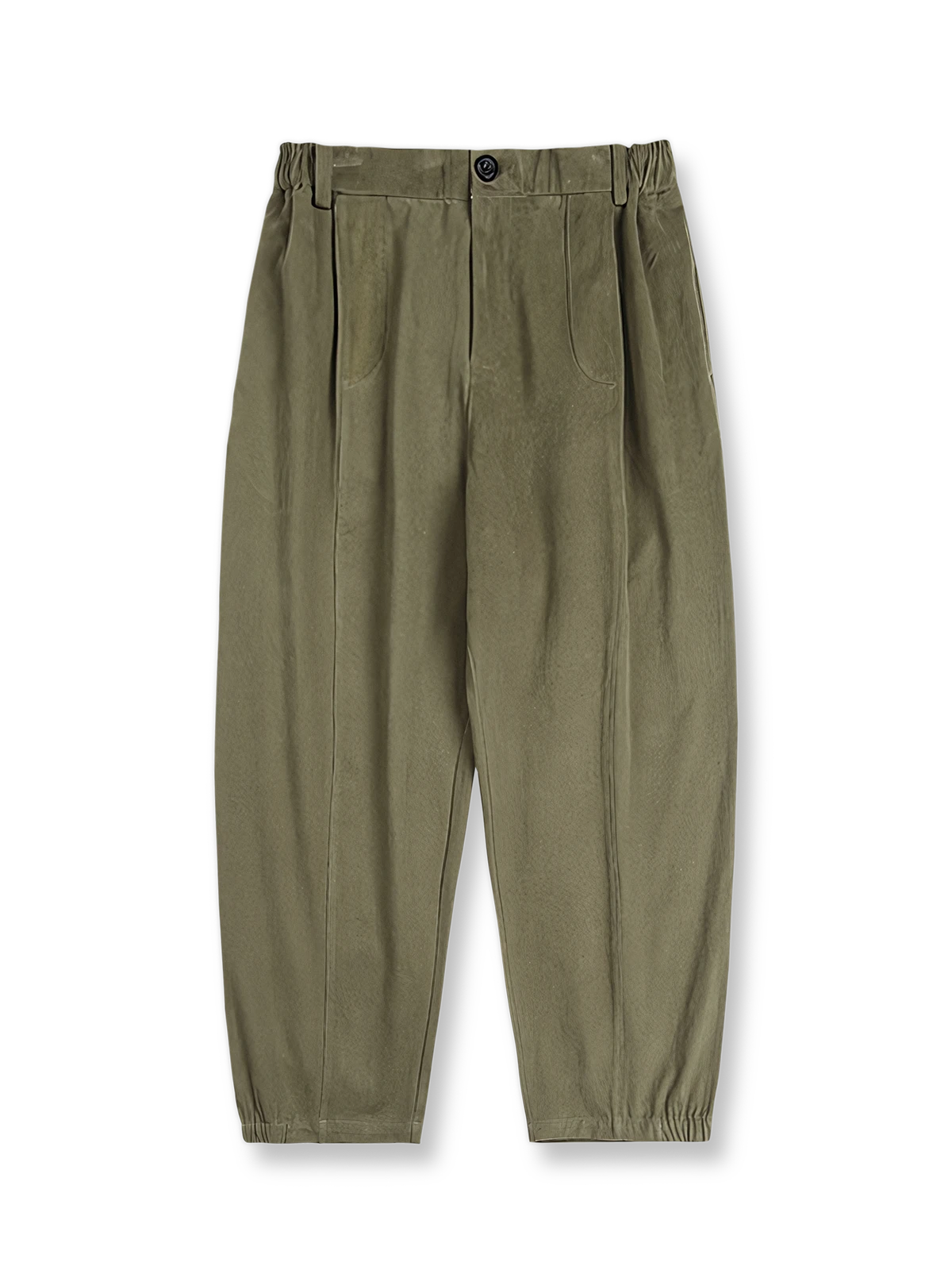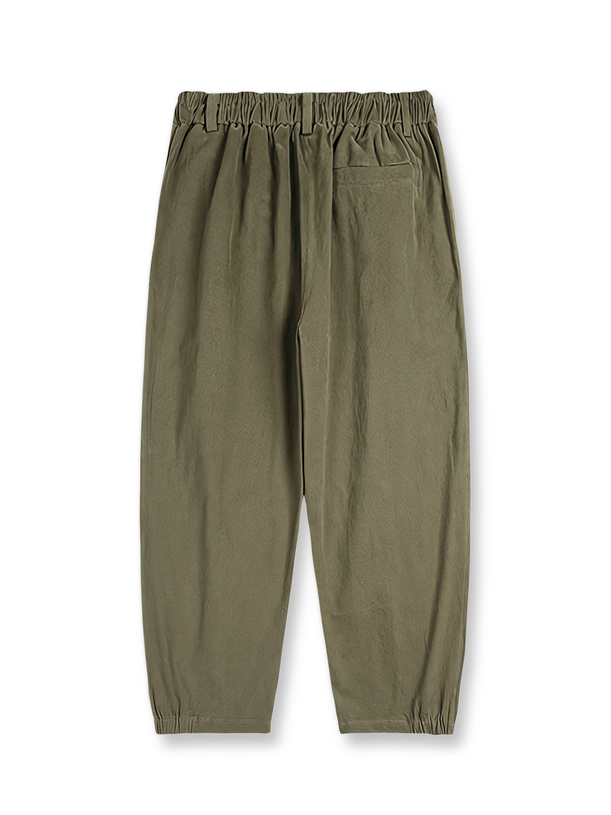 ウエストと裾口にはゴムを使用し、弾力性を持たせています。ウエストと足首を快適に包み込み、多くの体型に適しています。サイドのポケットは実用的で、バックポケットはディテール感をプラス。