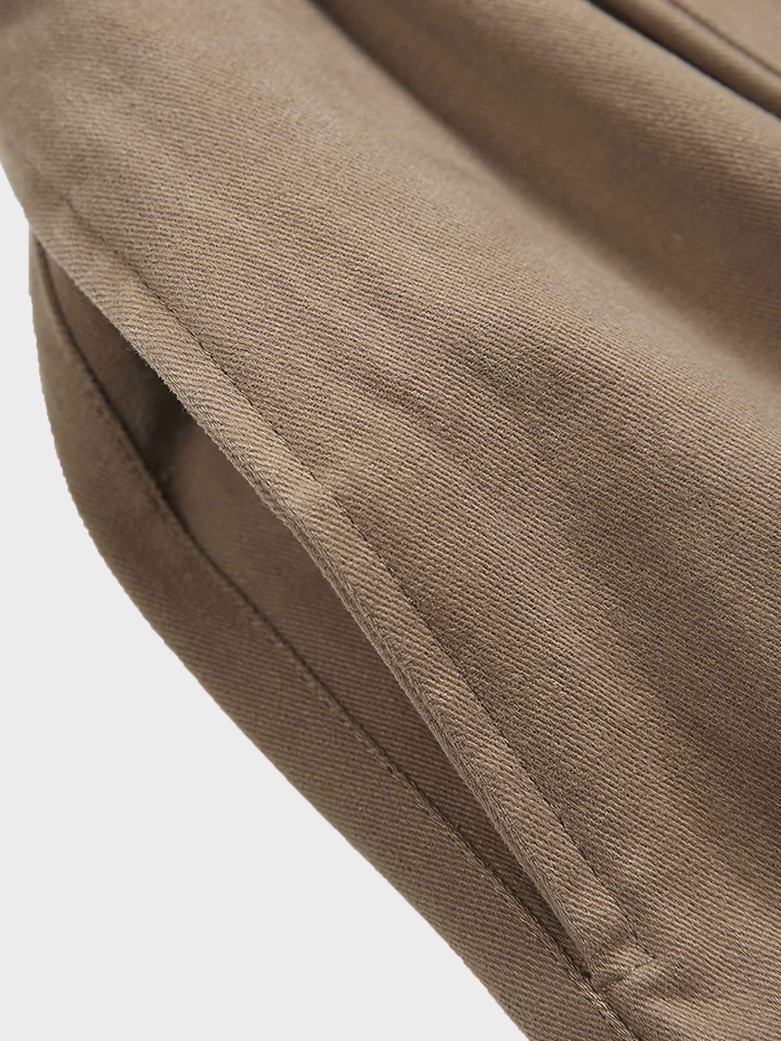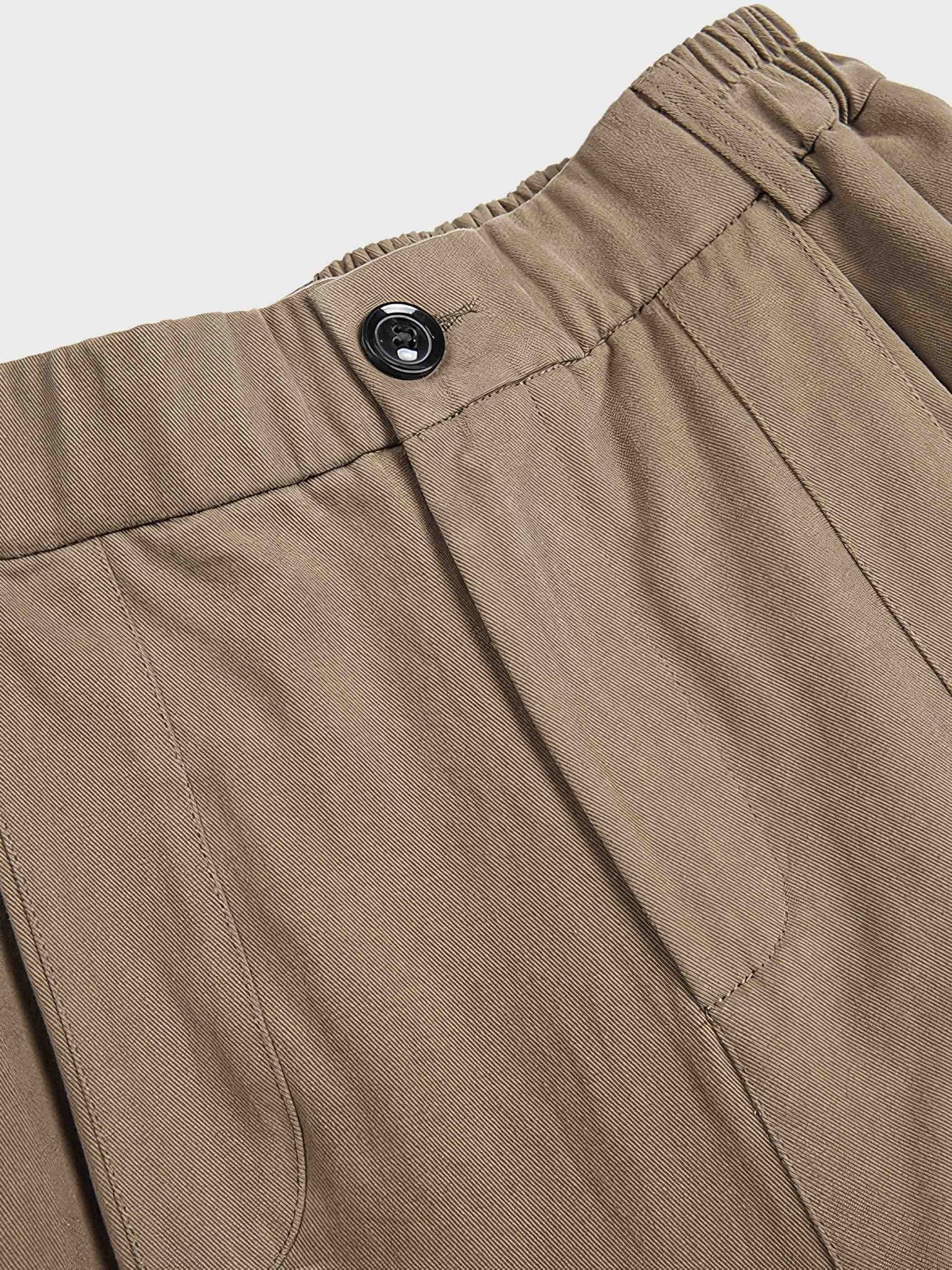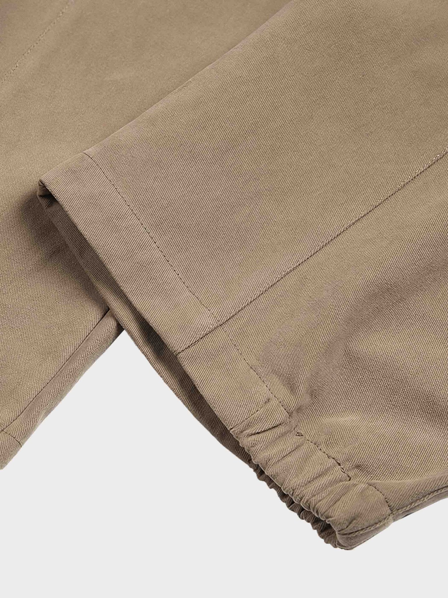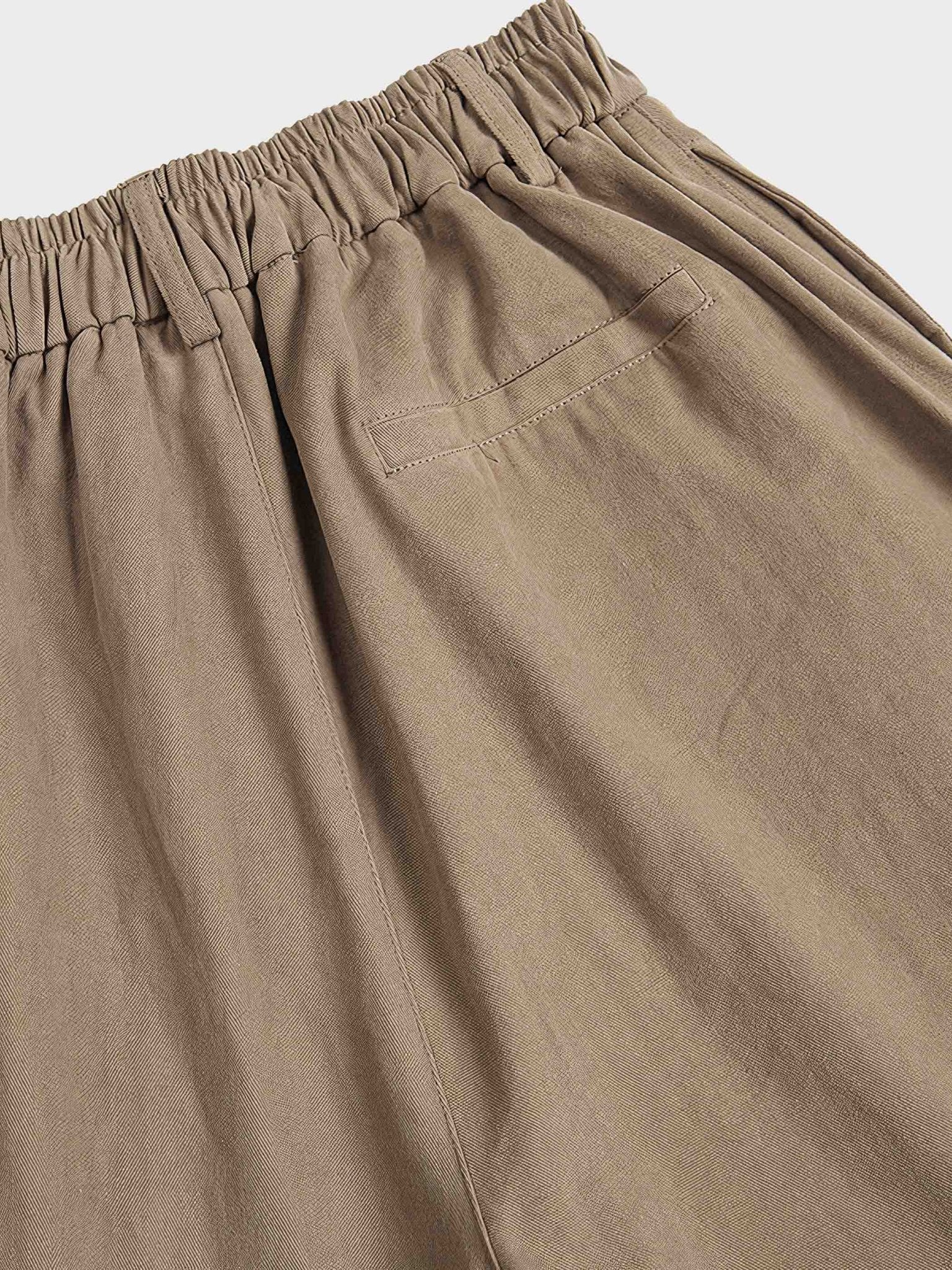 ウエストと裾口にはゴムを使用し、弾力性を持たせています。ウエストと足首を快適に包み込み、多くの体型に適しています。サイドのポケットは実用的で、バックポケットはディテール感をプラス。