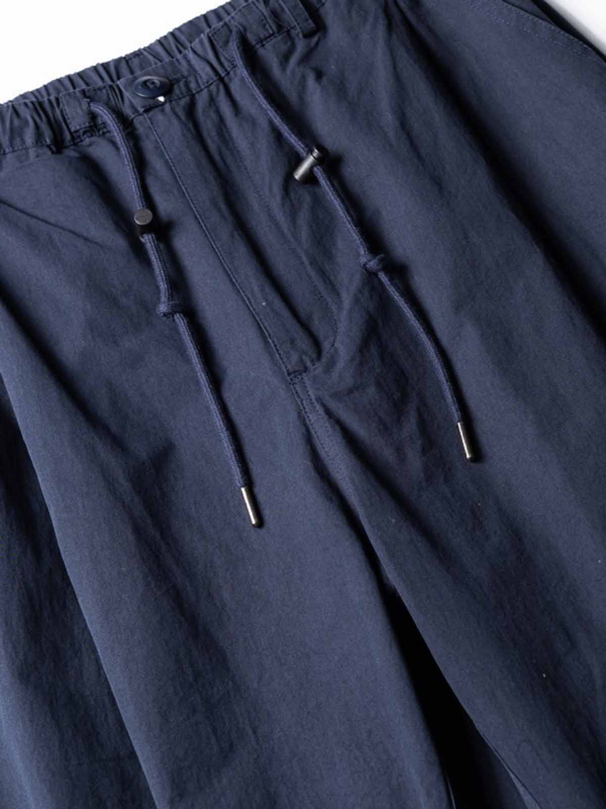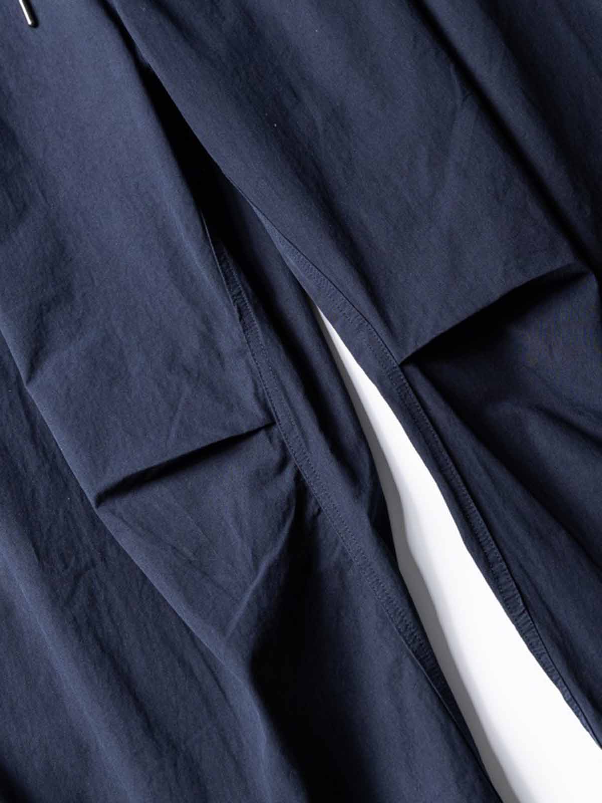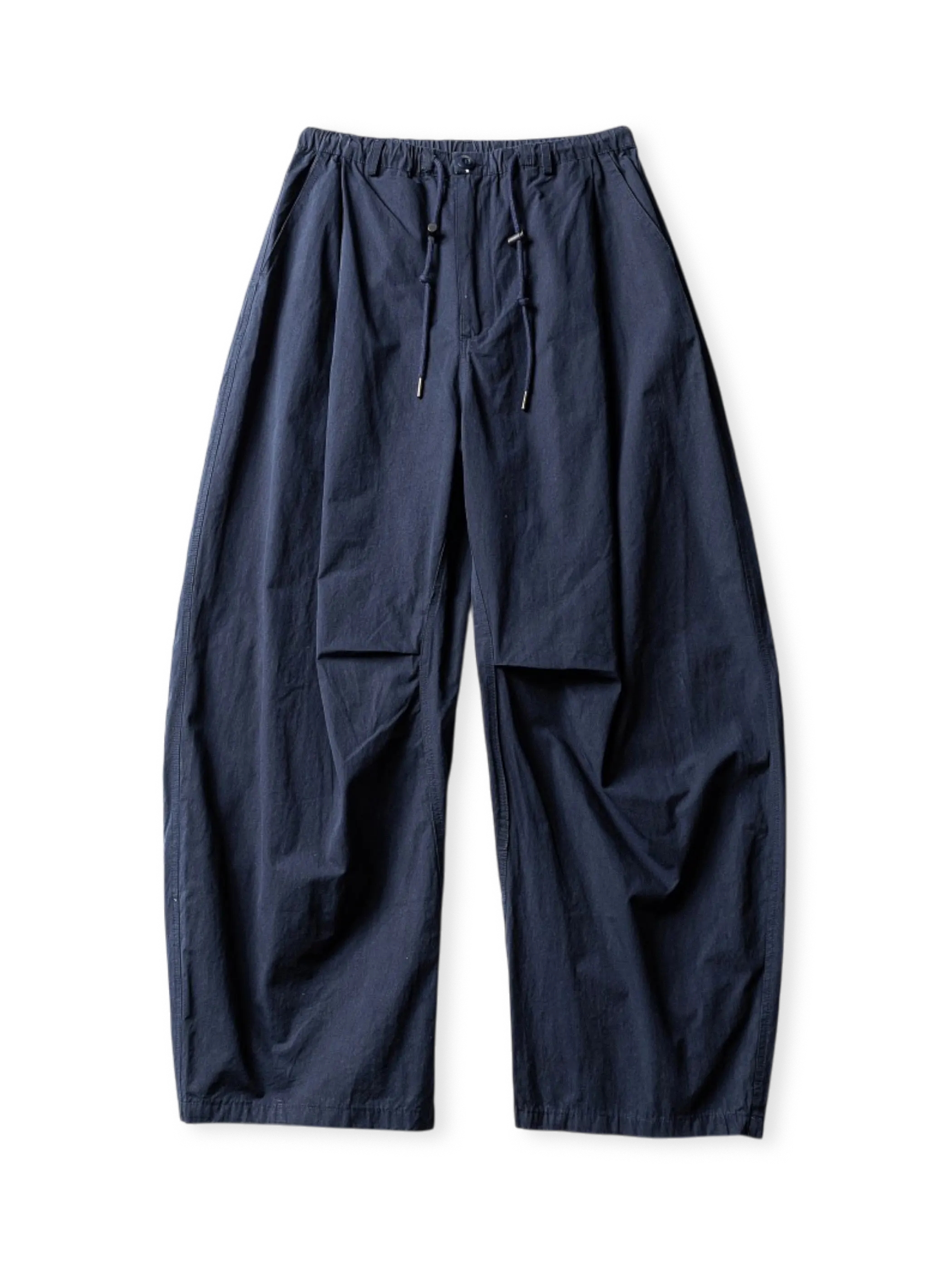 軽量で肌理感豊かなナイロン生地と立体プリーツデザインを融合し、カジュアルかつファッショナブルなルーズフィットパンツを実現。