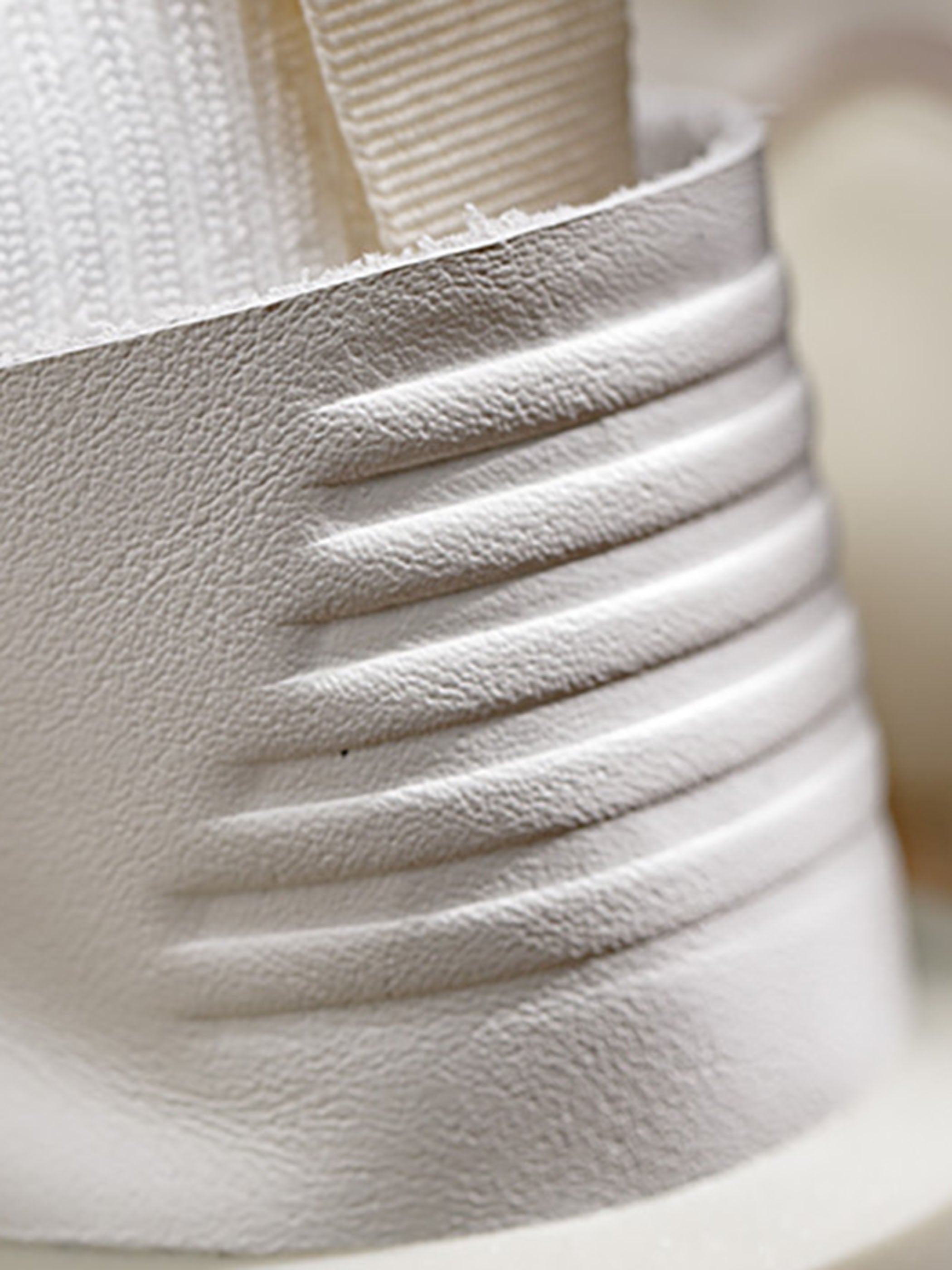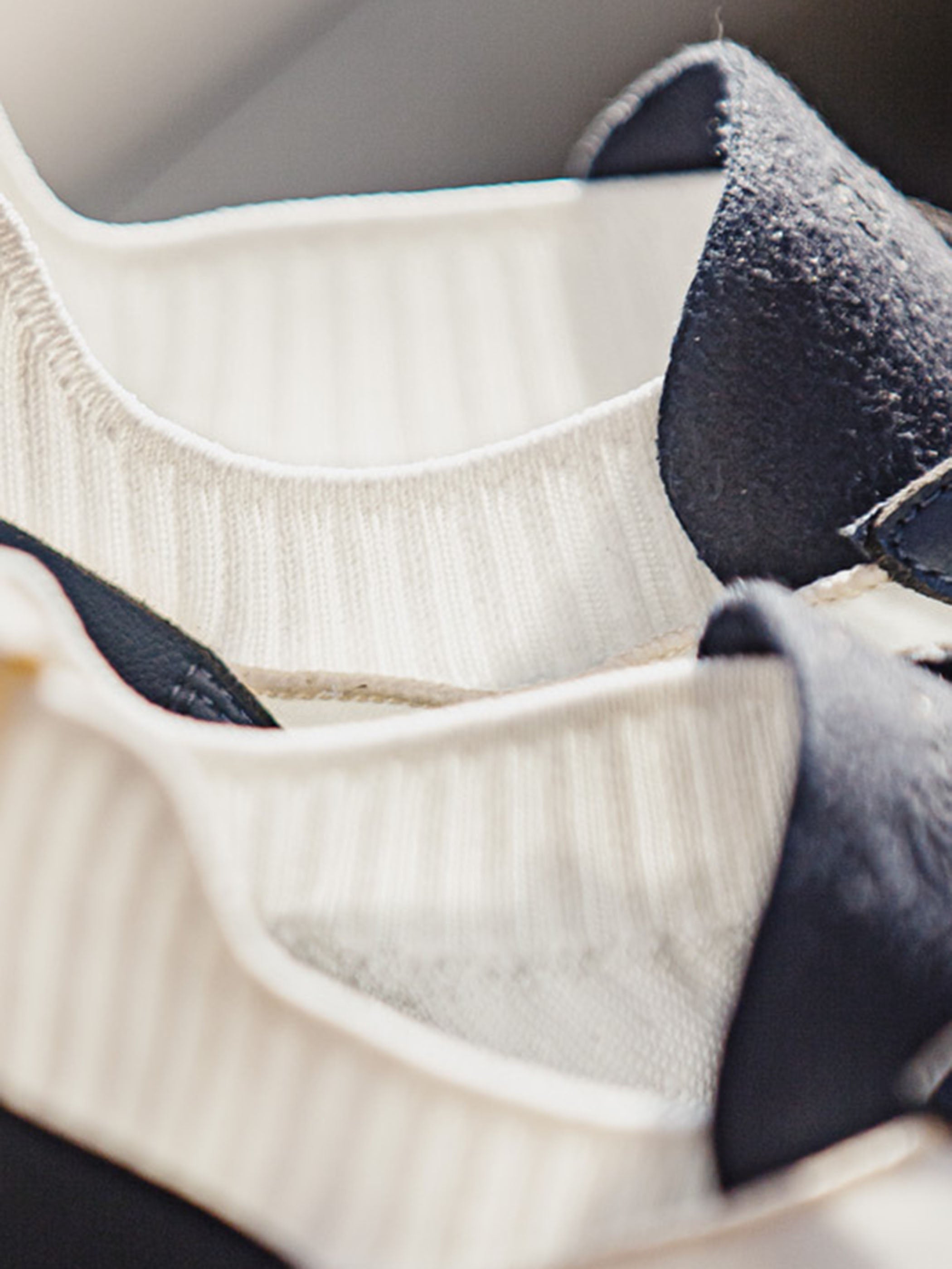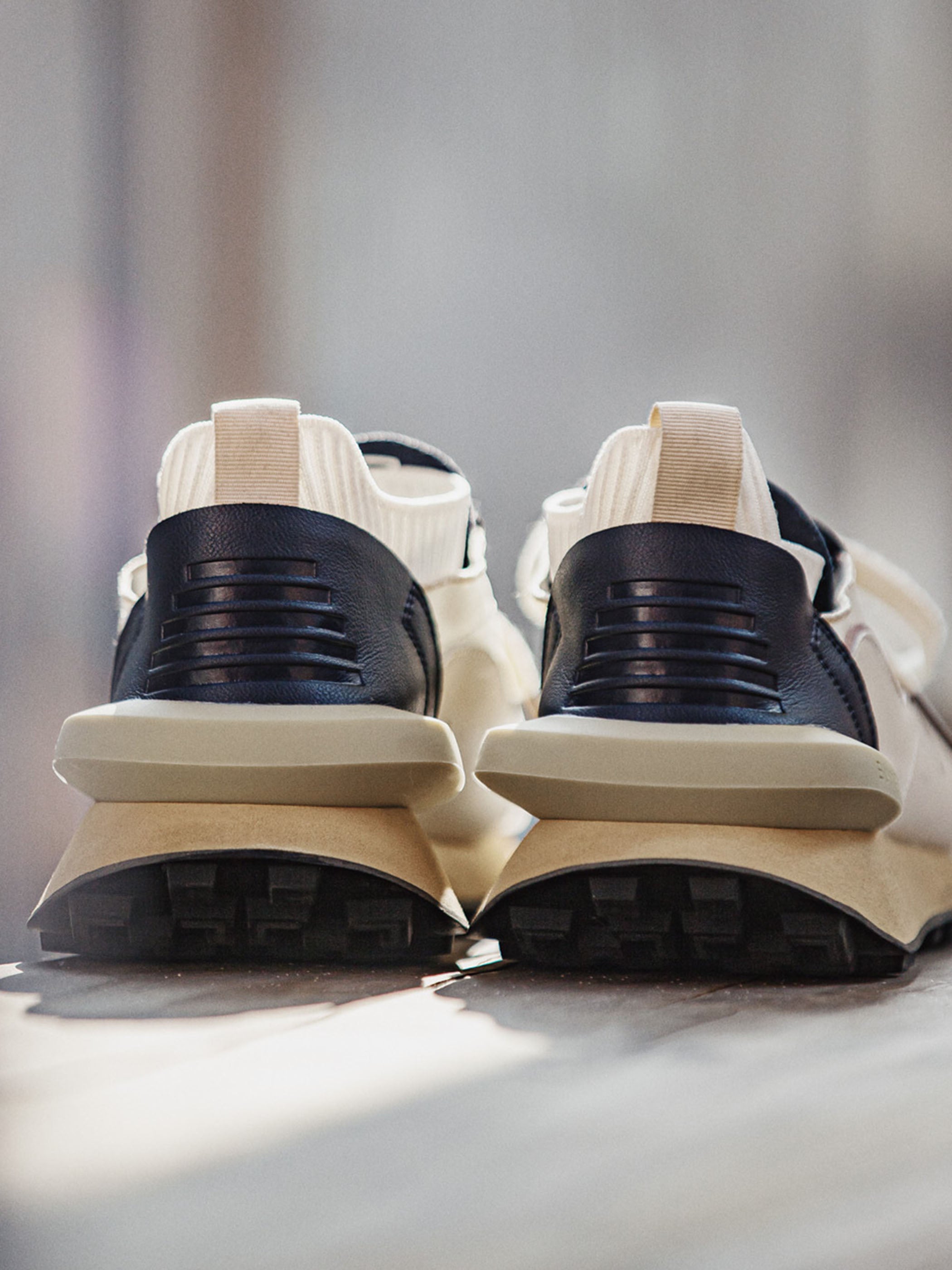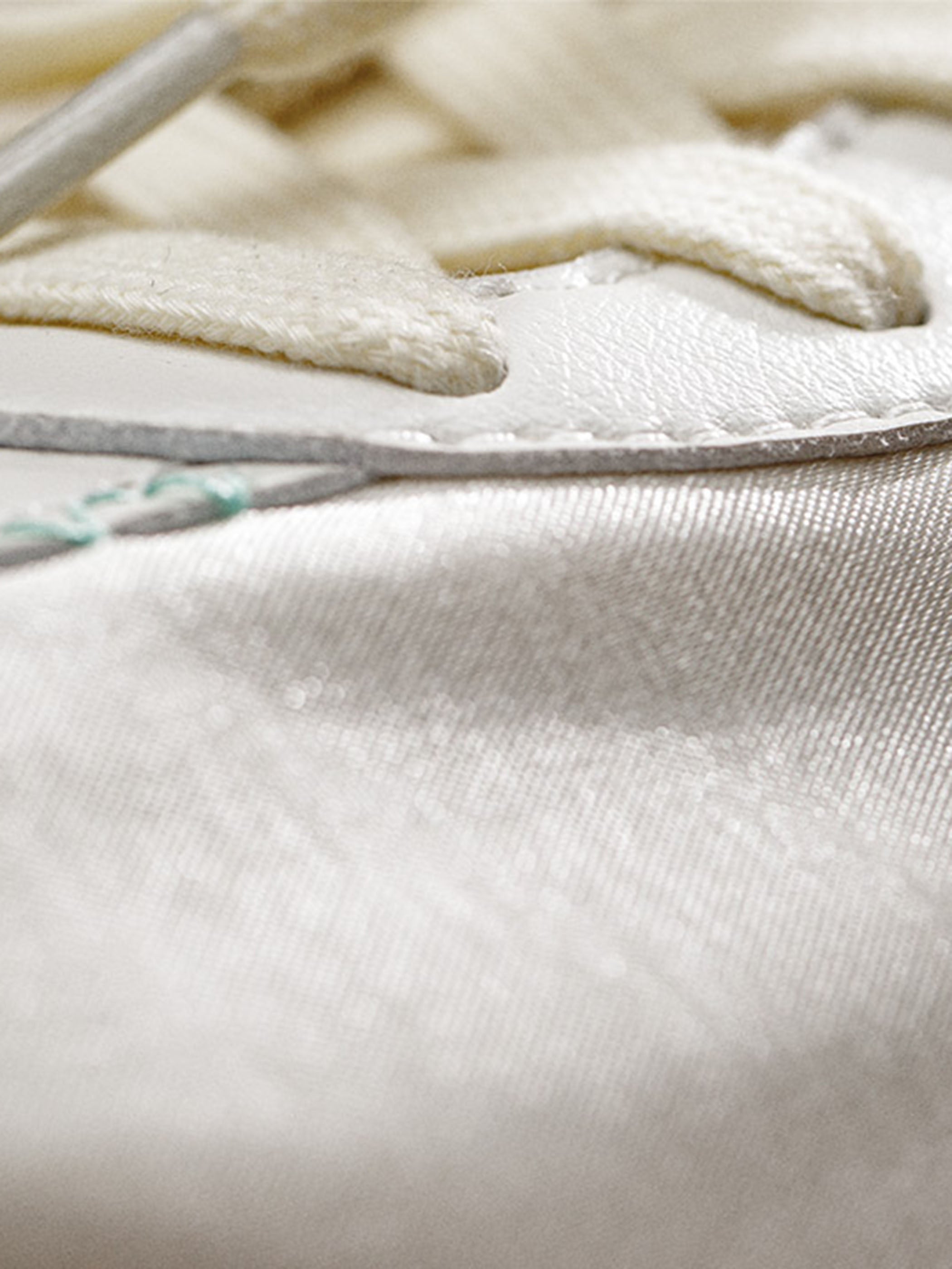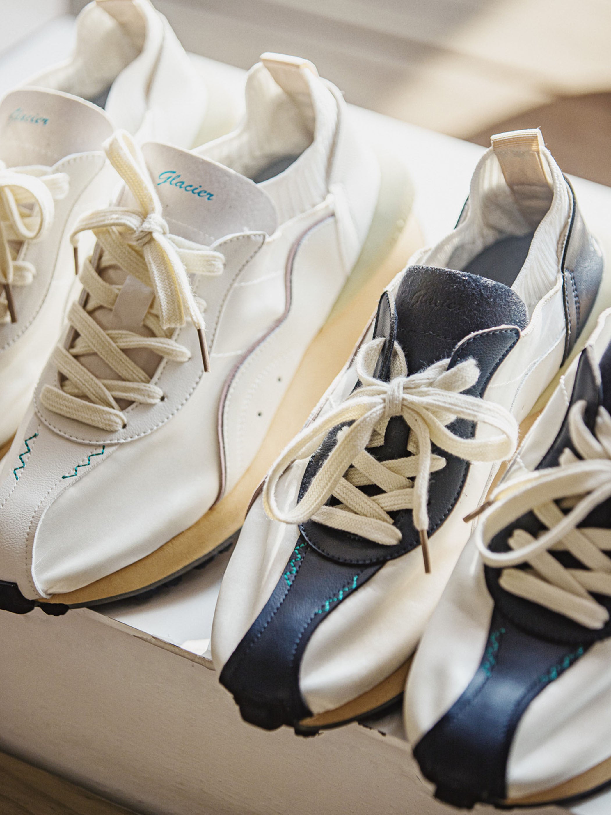 アッパーにはシルク調サテン素材を使用し、微光沢の上品な風合いと滑らかな肌触りを実現。ヴィンテージランニングシューズのクラシックなシルエットをベースに、フライニット技術を組み合わせ、足にしなやかにフィットする設計。