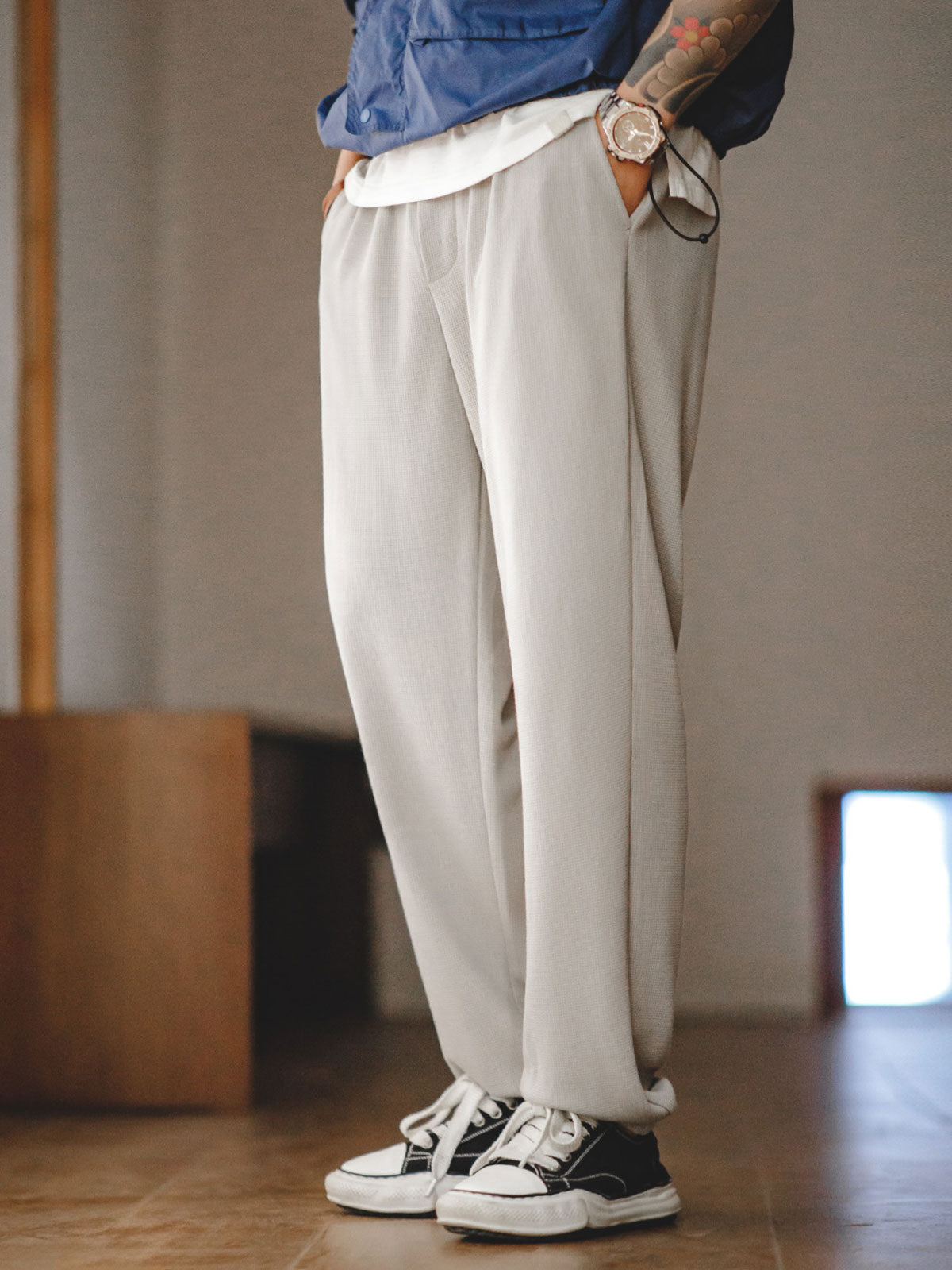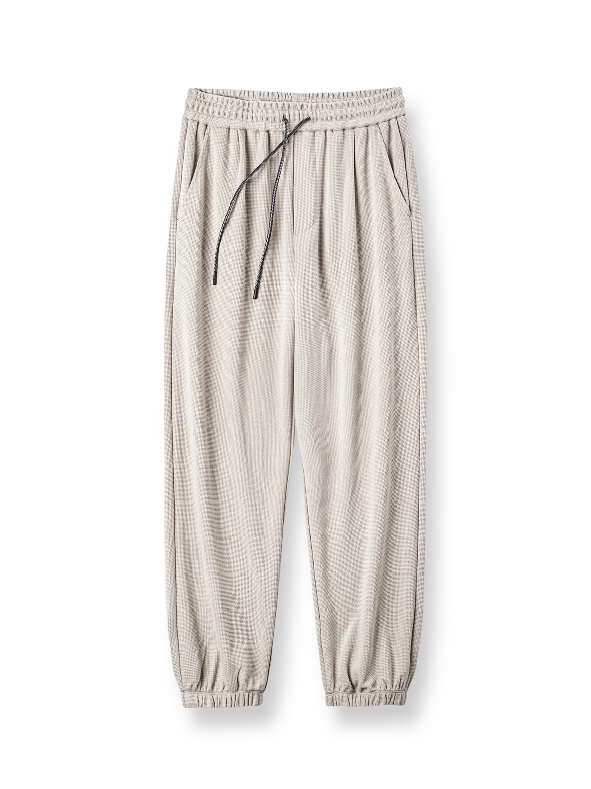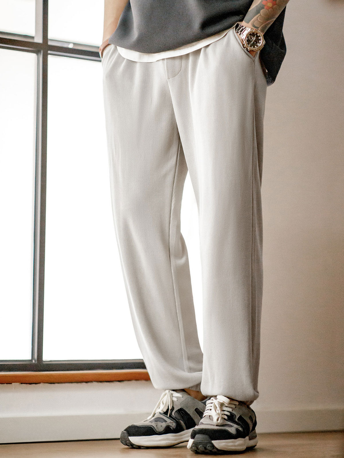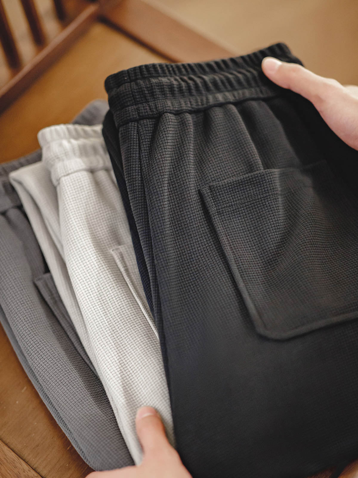 モダールとコットンを混紡したワッフル柄生地を使用し、優れた柔らかさと透湿性を提供し、スポーツ活動や日常着用に適しています。ワッフル柄のディテールは視覚的な層を増やすだけでなく、デザイン的にも特徴を持たせています。