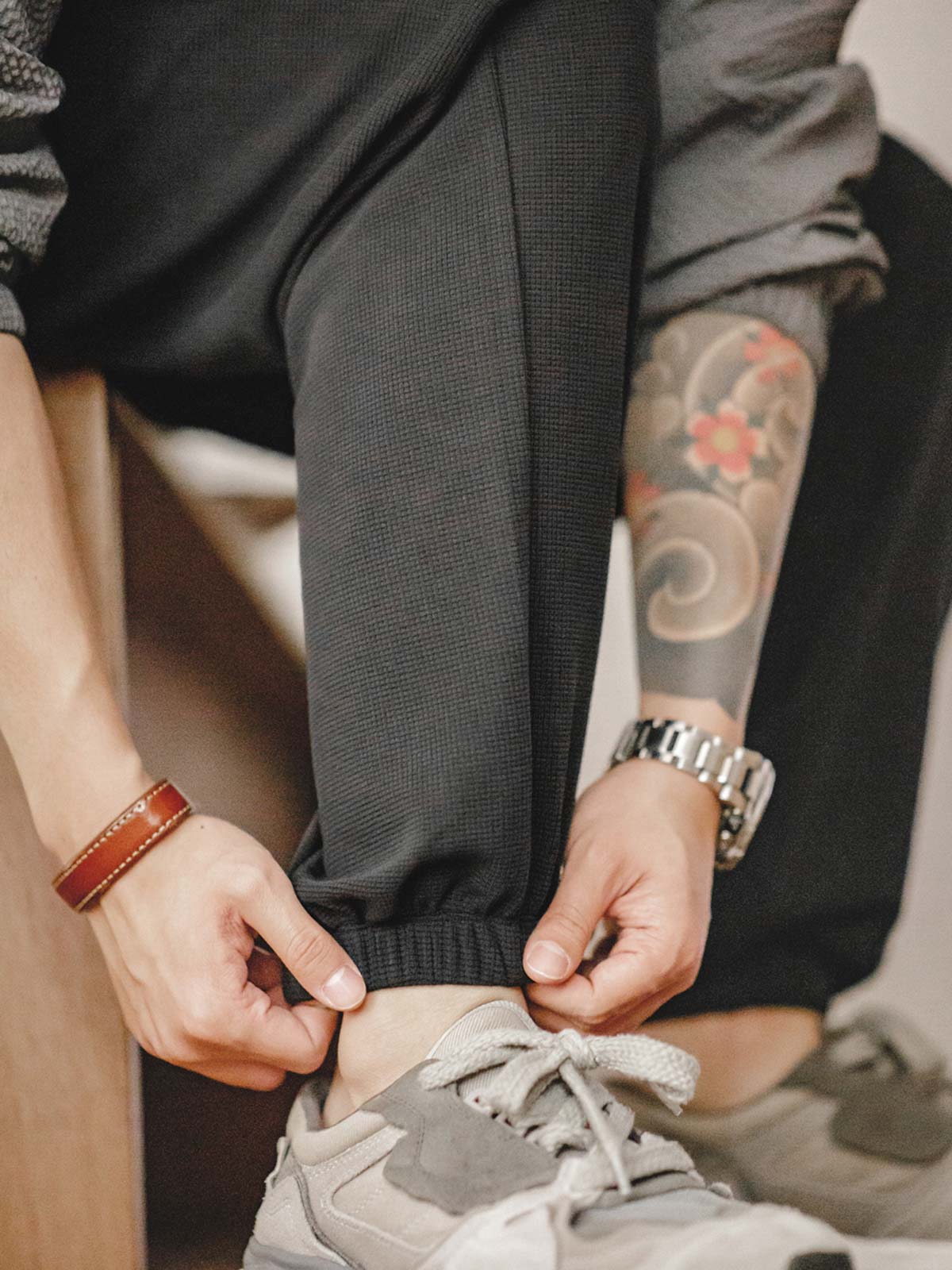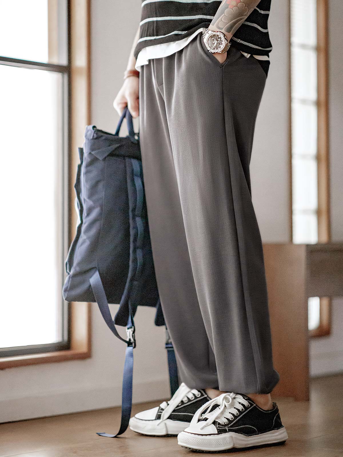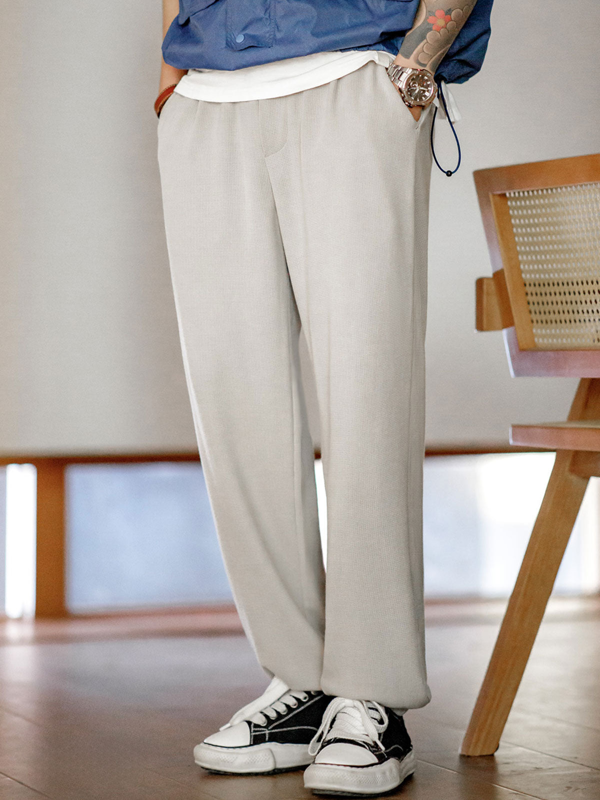 モダールとコットンを混紡したワッフル柄生地を使用し、優れた柔らかさと透湿性を提供し、スポーツ活動や日常着用に適しています。ワッフル柄のディテールは視覚的な層を増やすだけでなく、デザイン的にも特徴を持たせています。