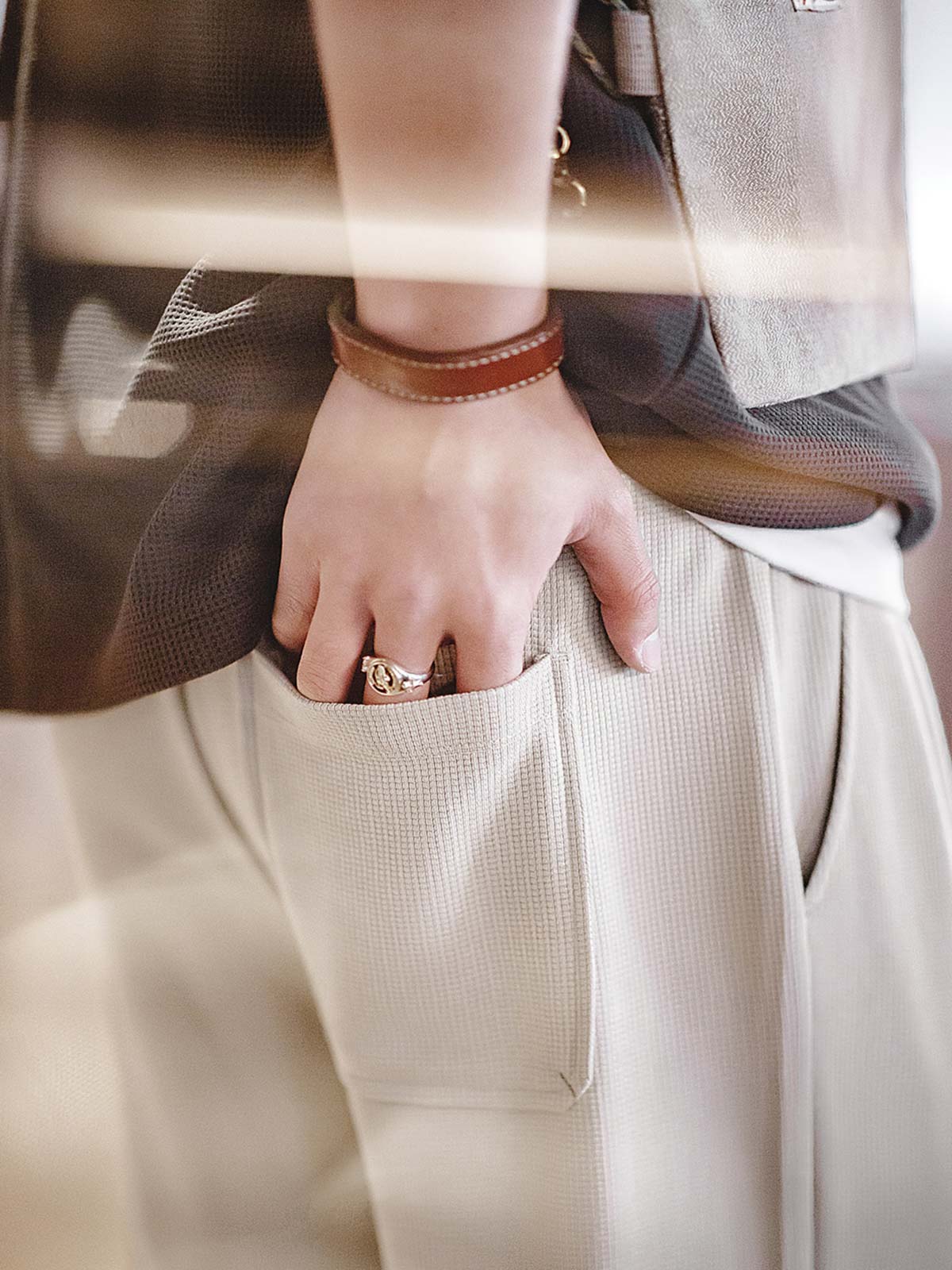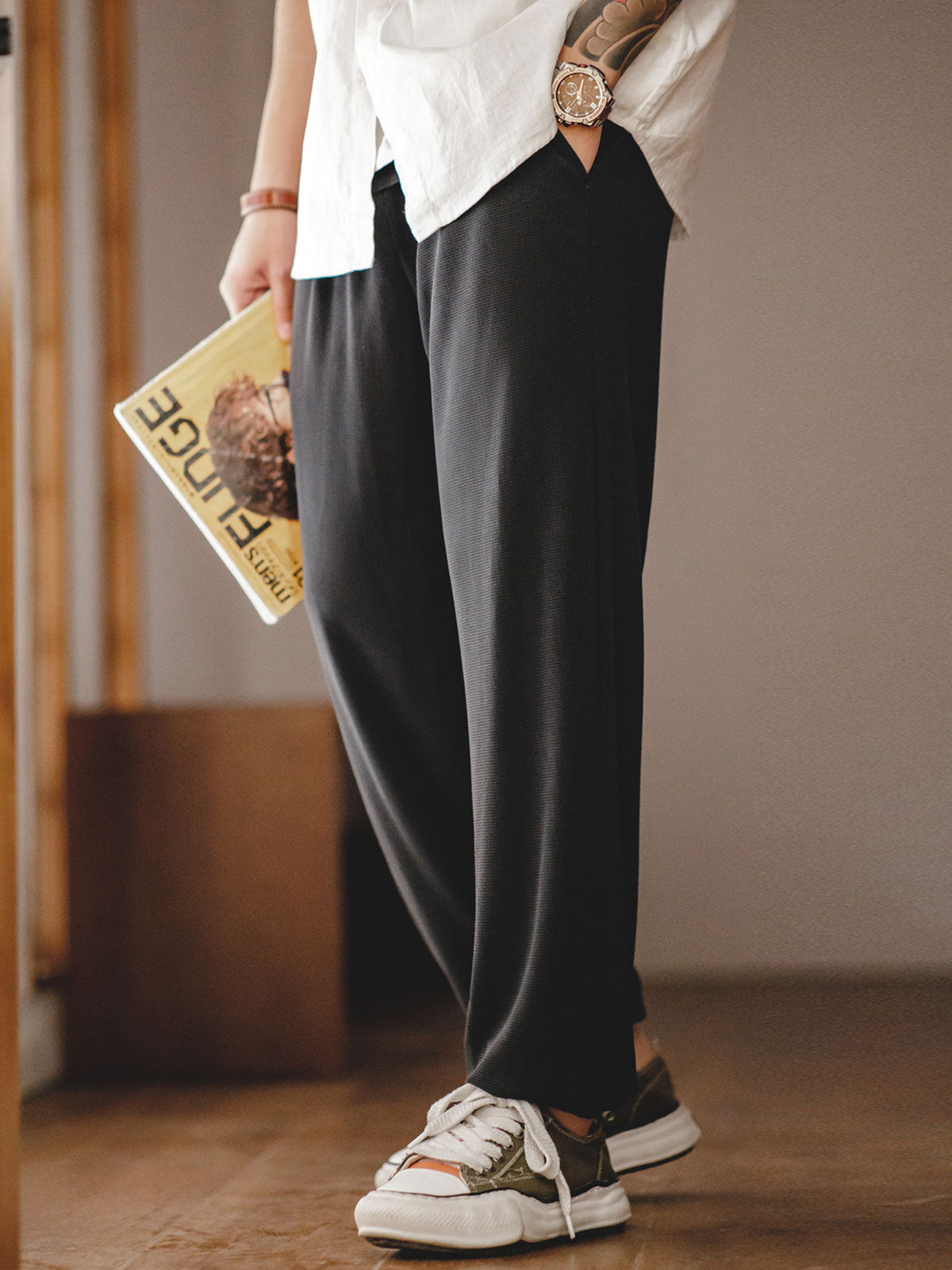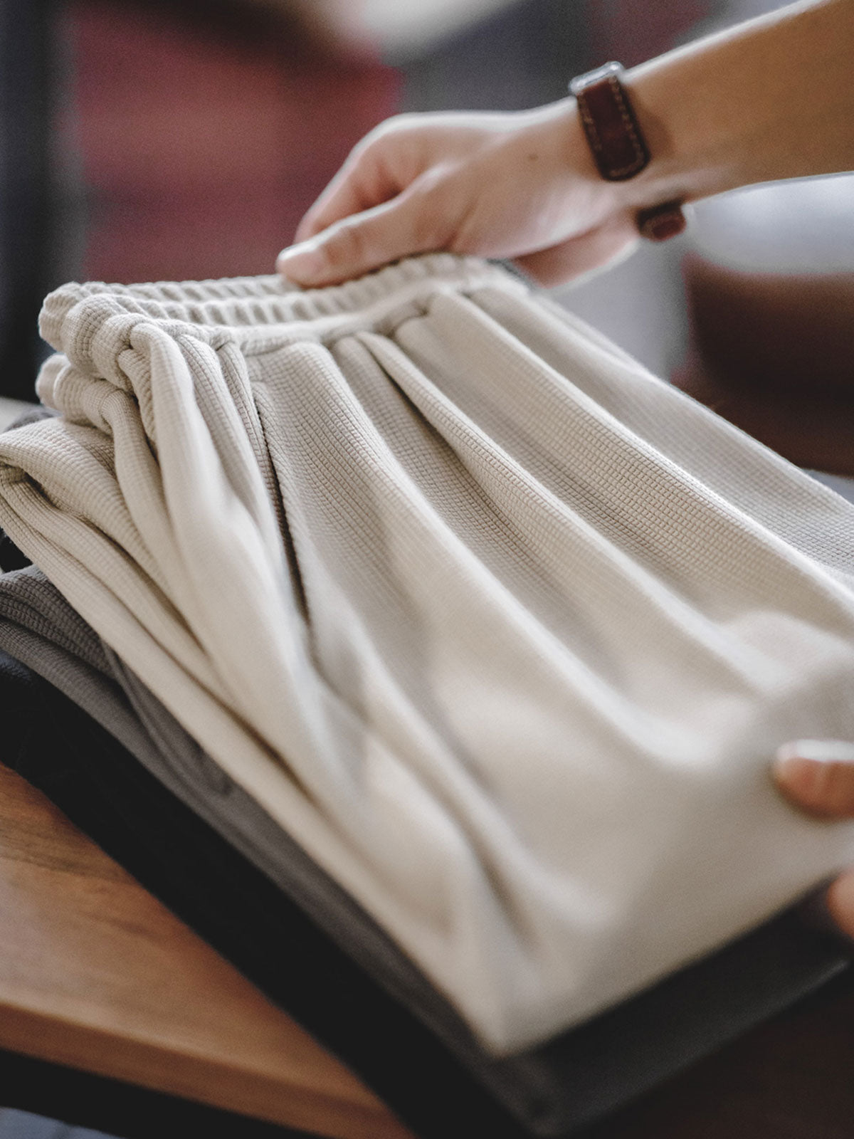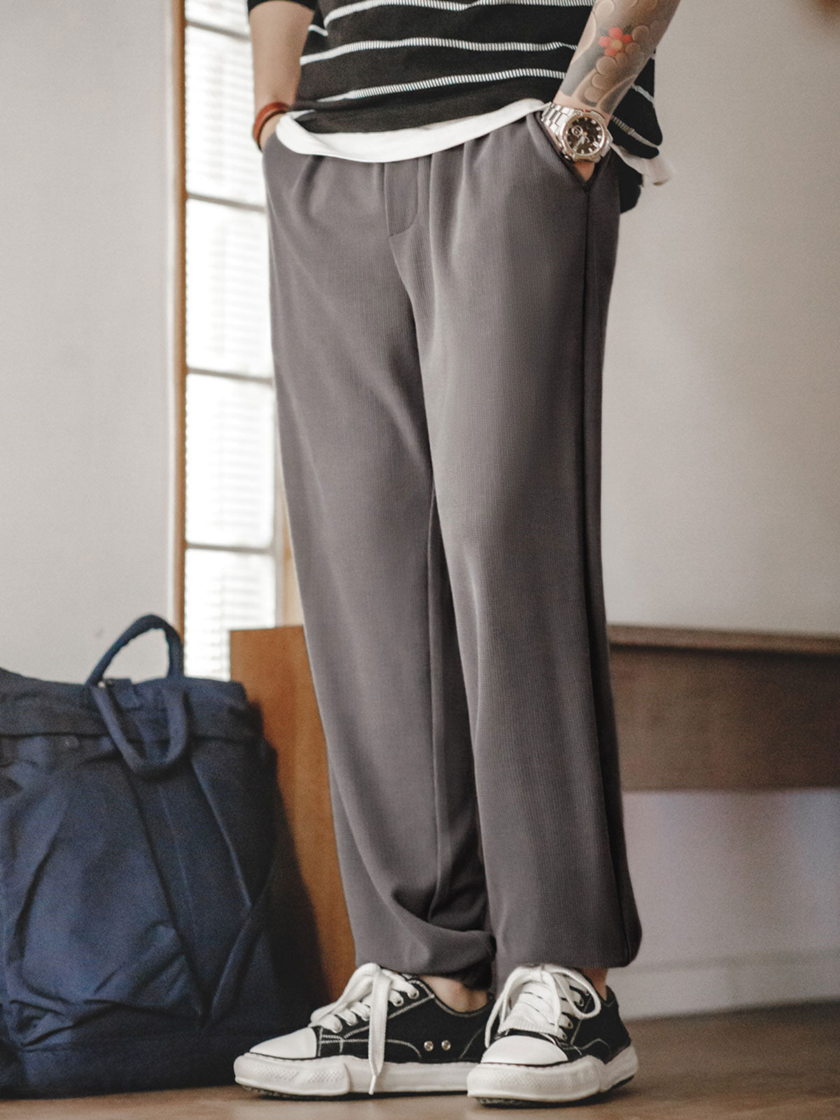 モダールとコットンを混紡したワッフル柄生地を使用し、優れた柔らかさと透湿性を提供し、スポーツ活動や日常着用に適しています。ワッフル柄のディテールは視覚的な層を増やすだけでなく、デザイン的にも特徴を持たせています。