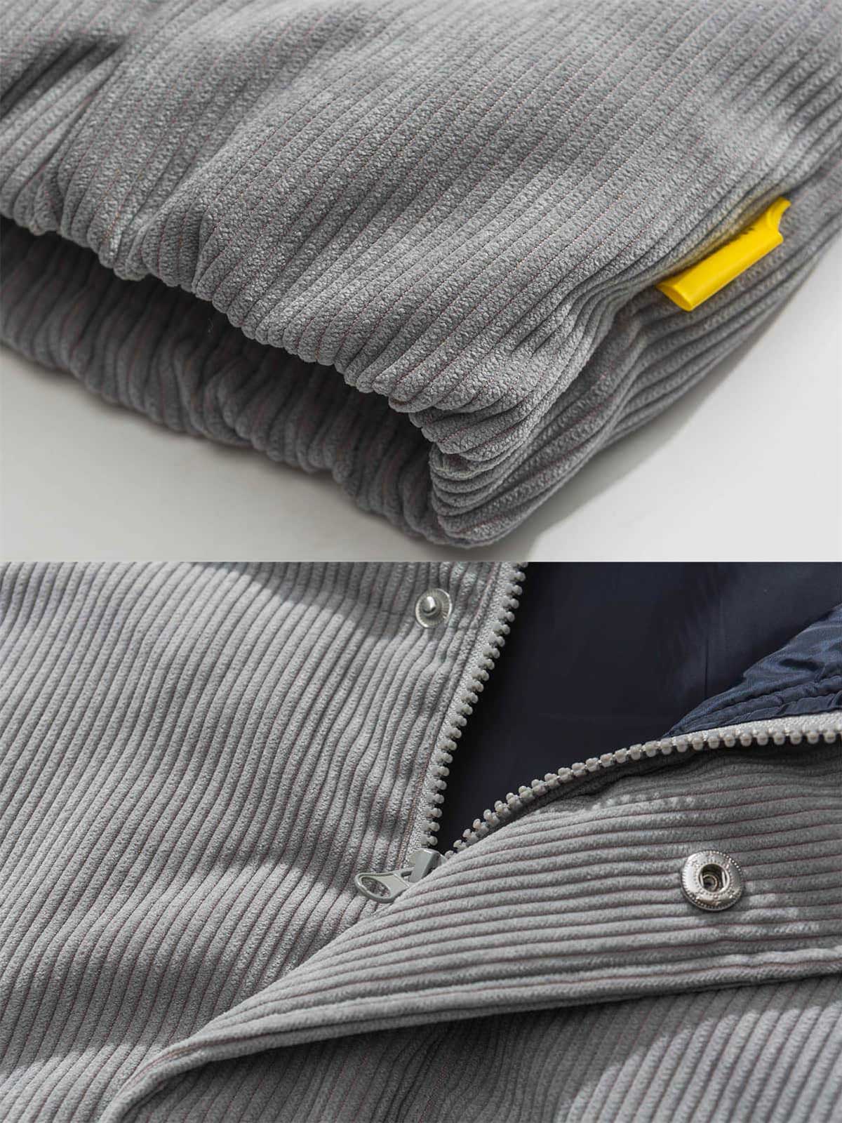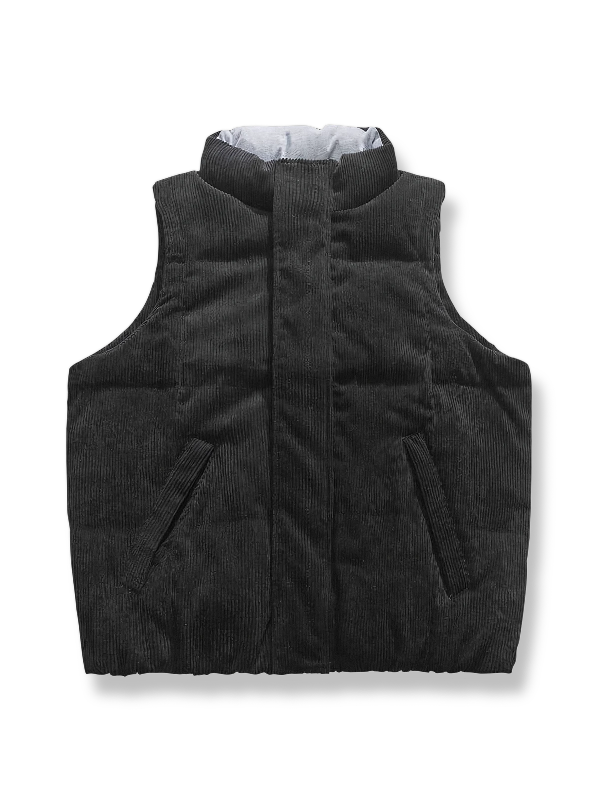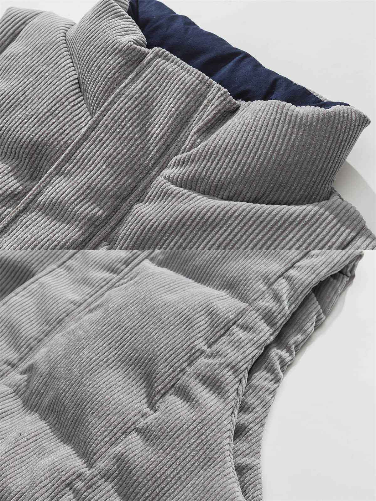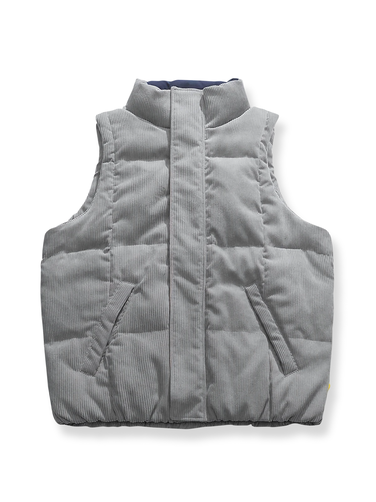 このコーデュロイダウンベストは、現代のカジュアルウェアと伝統的な素材の融合です。長い歴史を持つコーデュロイは、耐久性があり暖かい衣類の製作によく使用されます。
