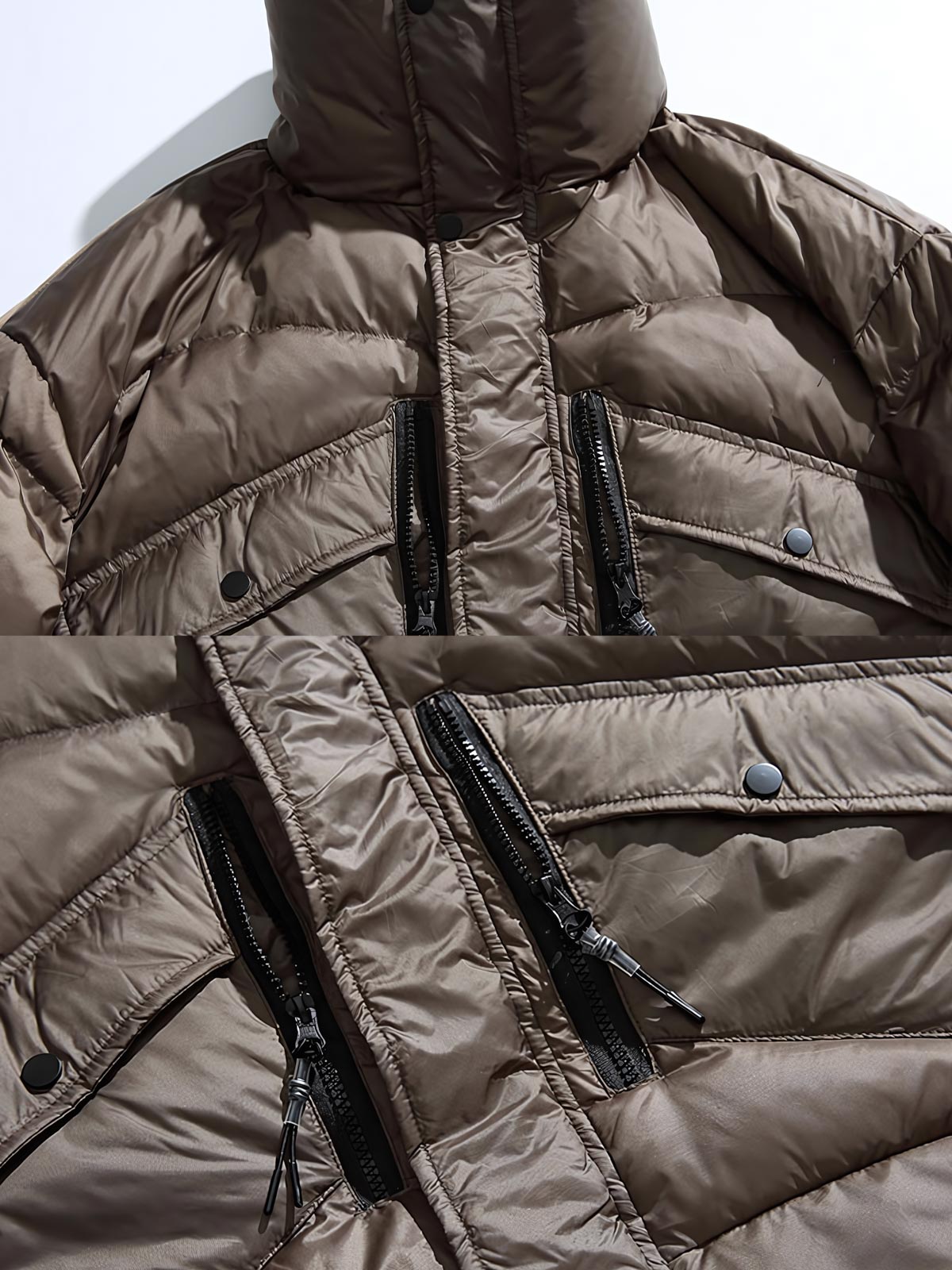 高品質の生地を使用し、内部には厳選されたホワイトダックダウンを充填しており、伝統的な製衣技術の継承を示しています。クラシックなラインデザインと精緻な縫製技術は、レトロスタイルへの敬意です。