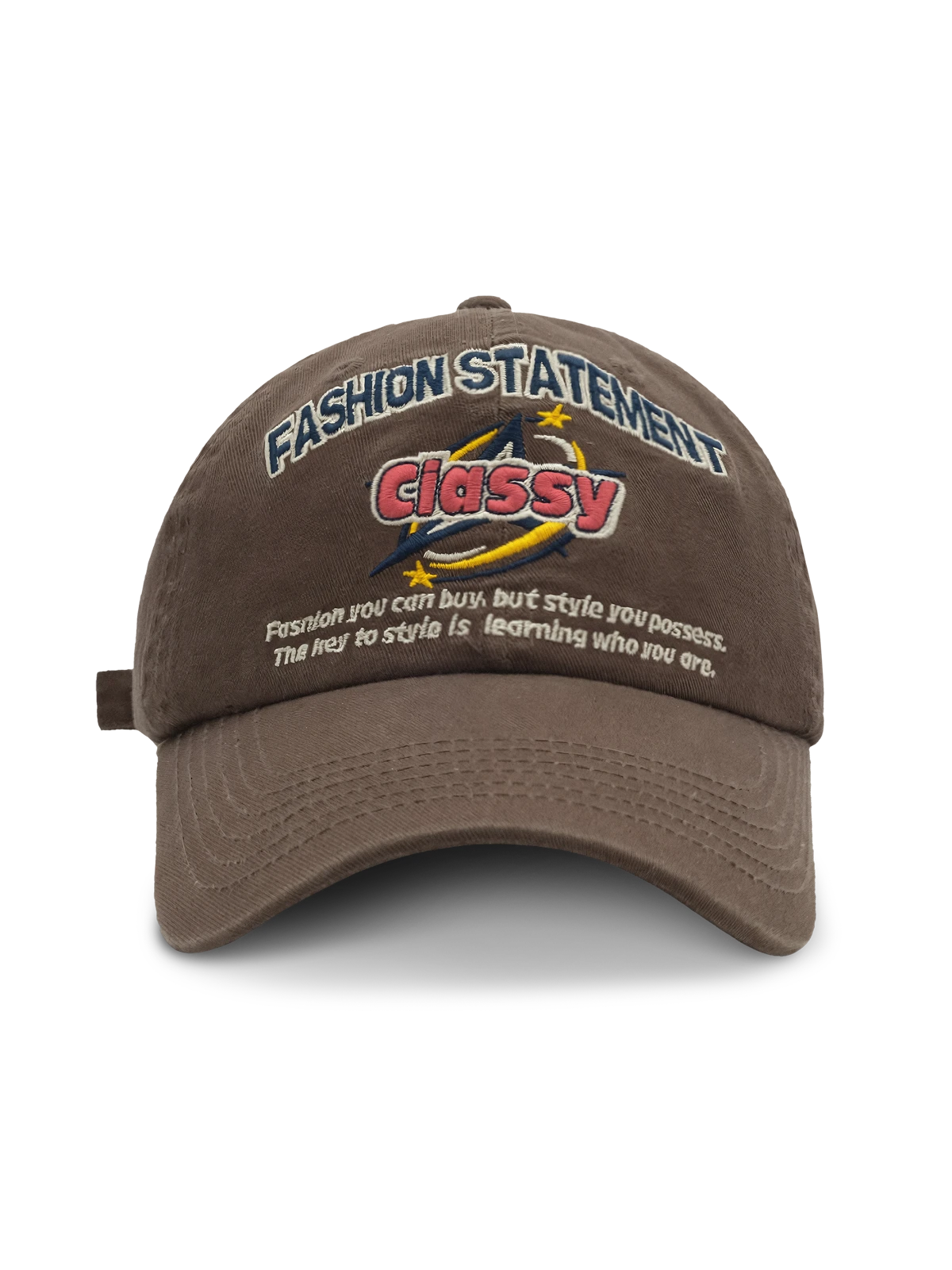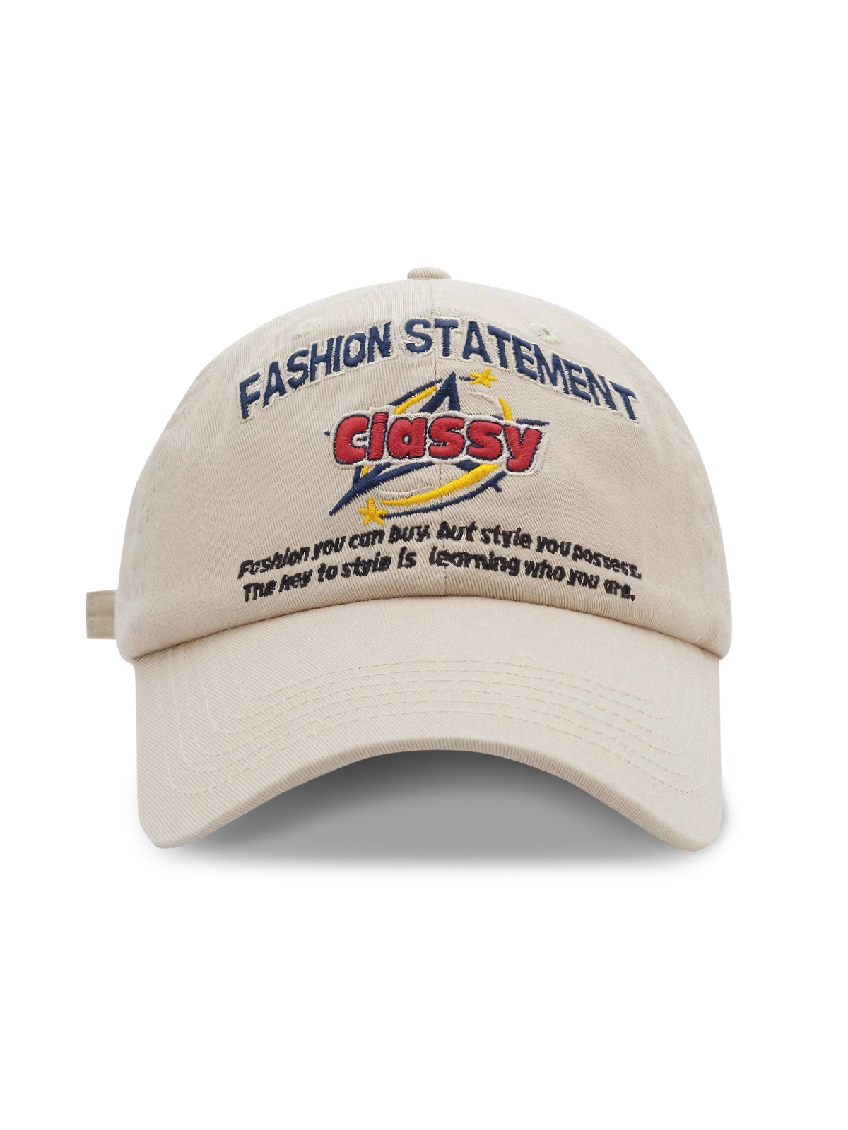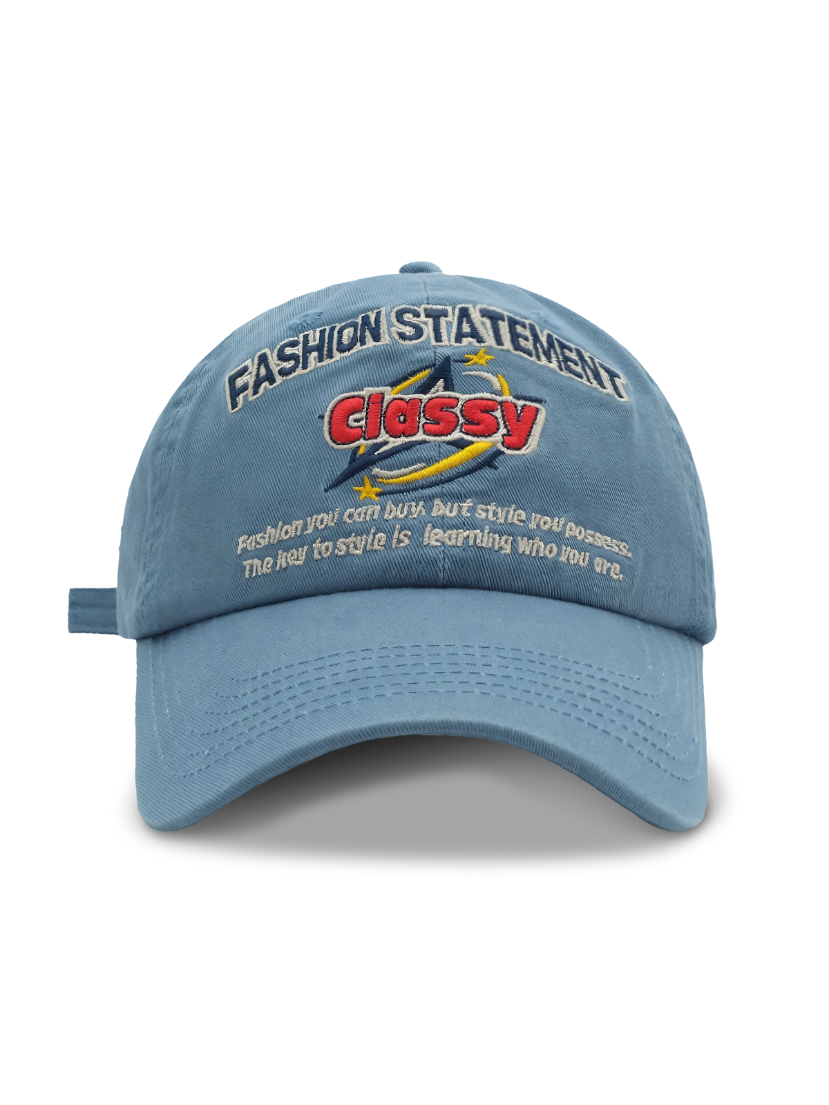 この野球帽は、スポーツ用品としての起源から、20世紀半ばにカジュアルウェアの象徴へと進化した歴史を持ちます。大胆な刺繍スローガン「FASHION STATEMENT CLASSY」が特徴で、個人のスタイルを強調しつつ、ファッションとしての自己表現を促進するデザインです。