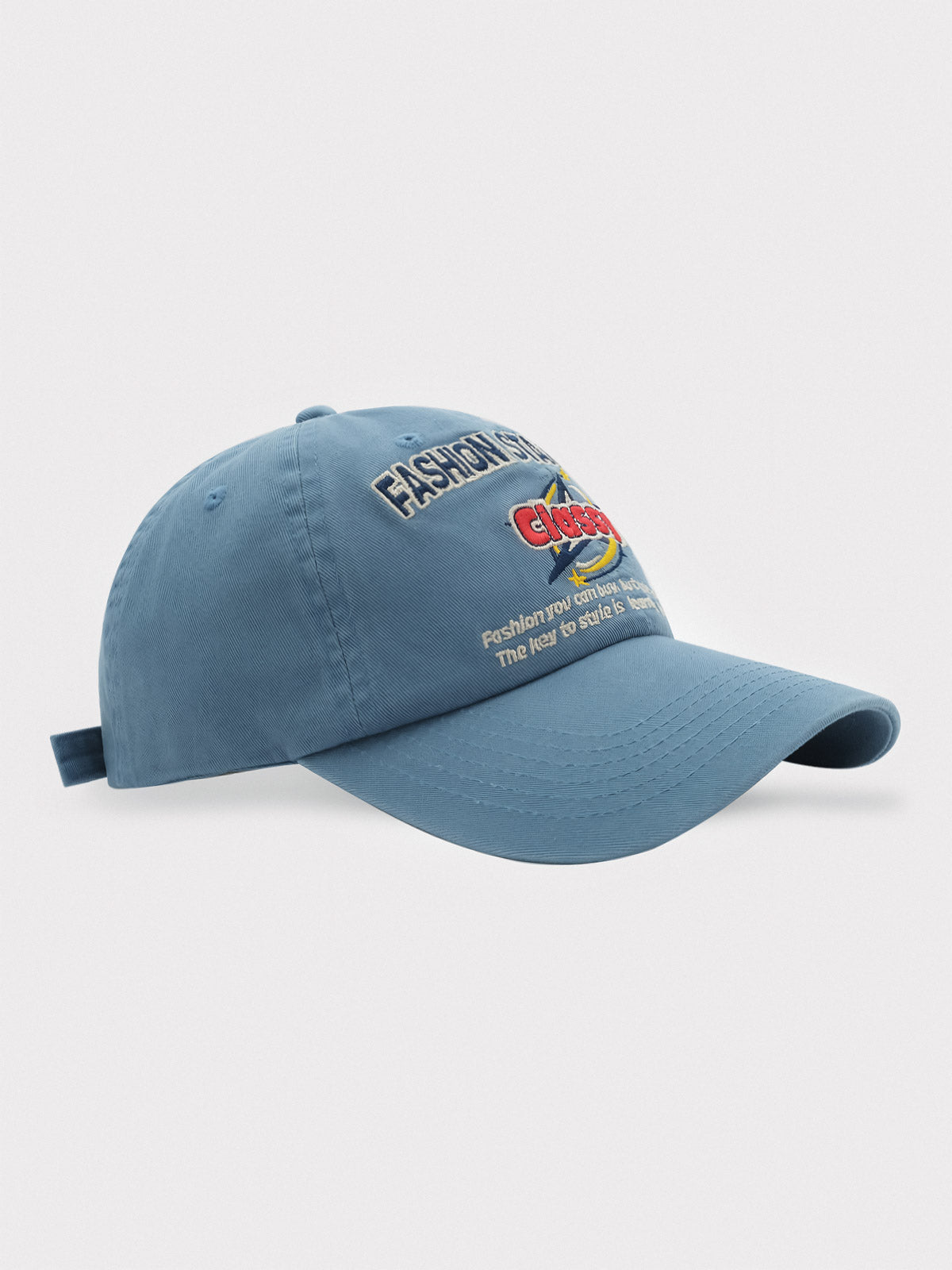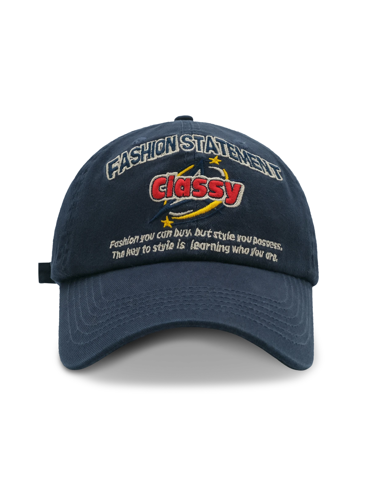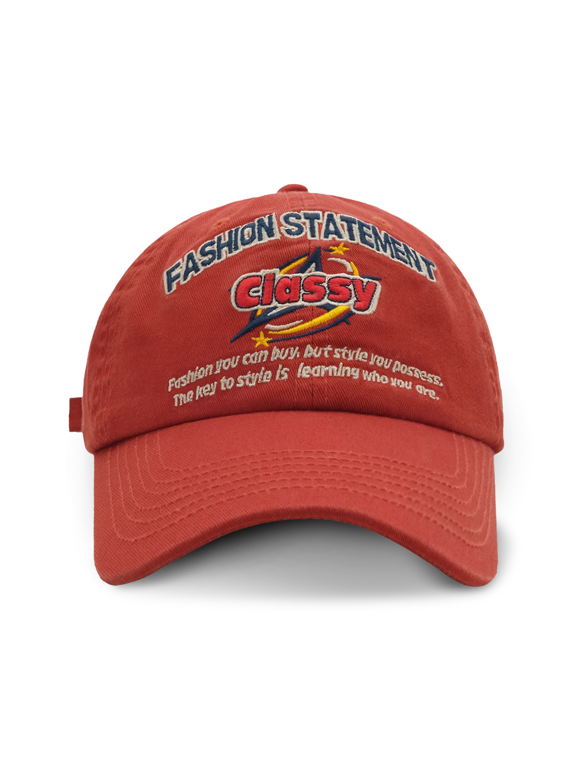 この野球帽は、スポーツ用品としての起源から、20世紀半ばにカジュアルウェアの象徴へと進化した歴史を持ちます。大胆な刺繍スローガン「FASHION STATEMENT CLASSY」が特徴で、個人のスタイルを強調しつつ、ファッションとしての自己表現を促進するデザインです。