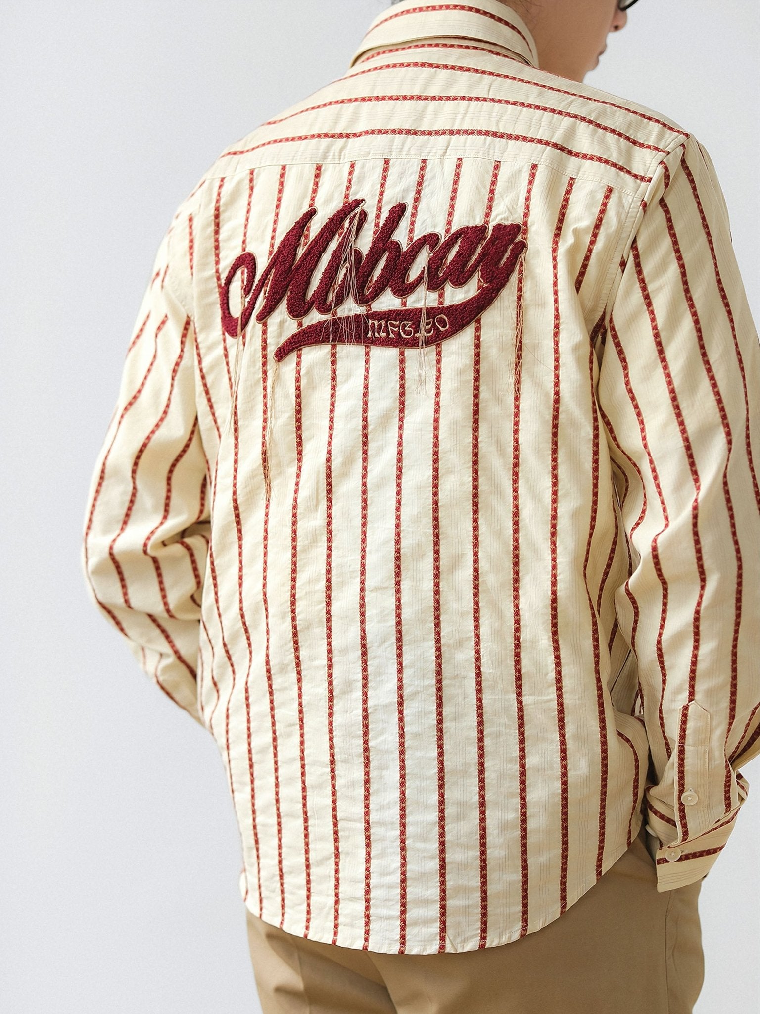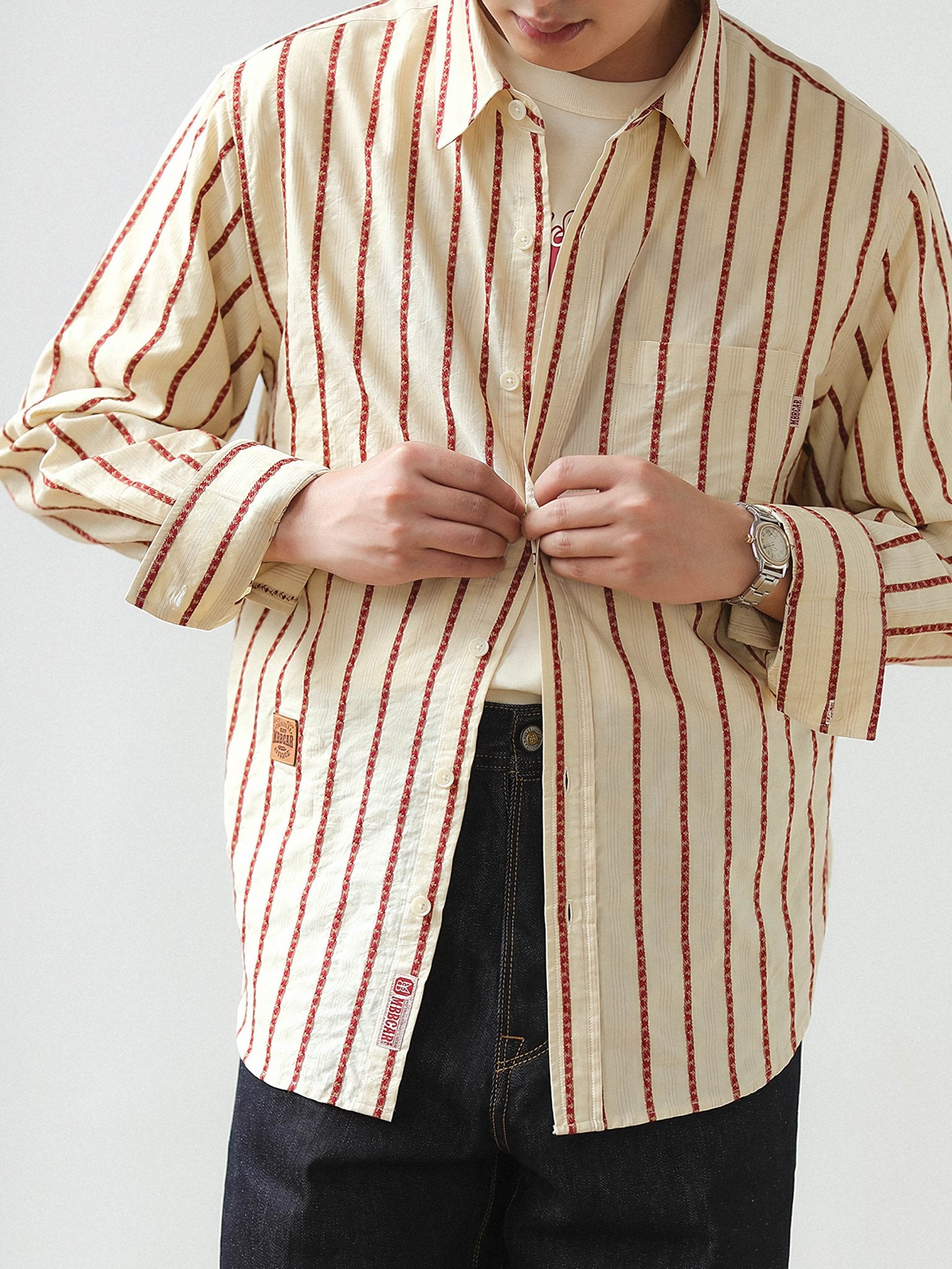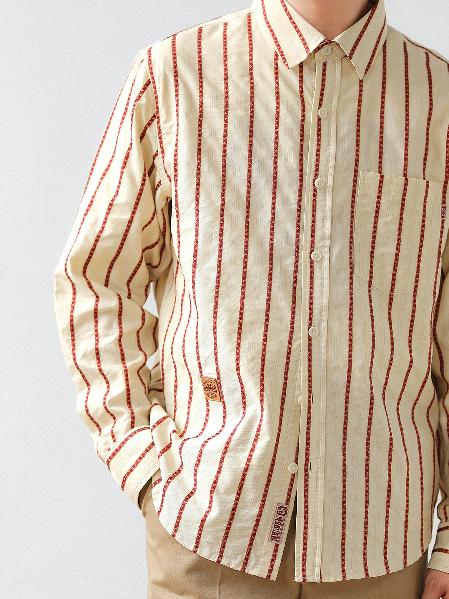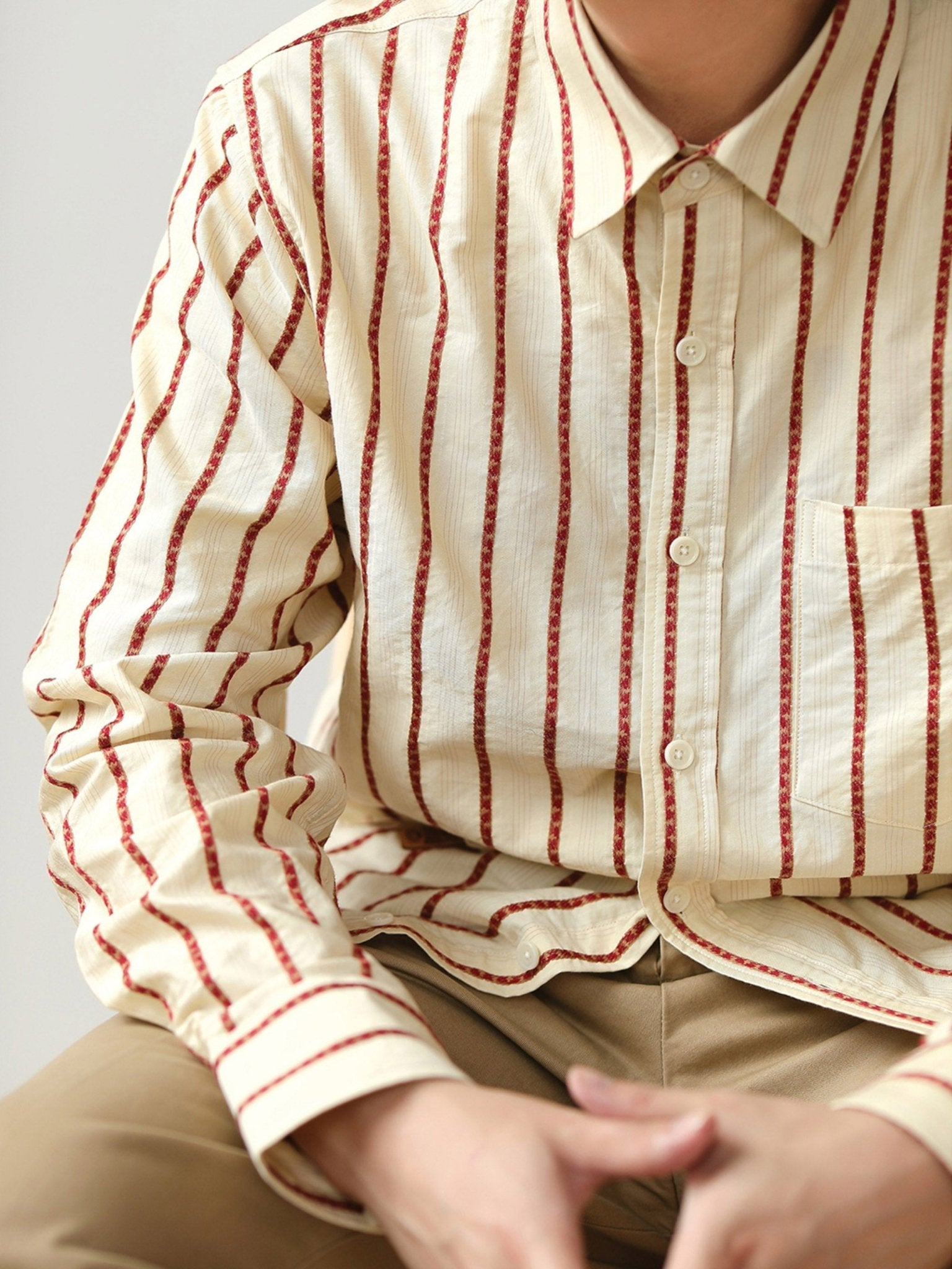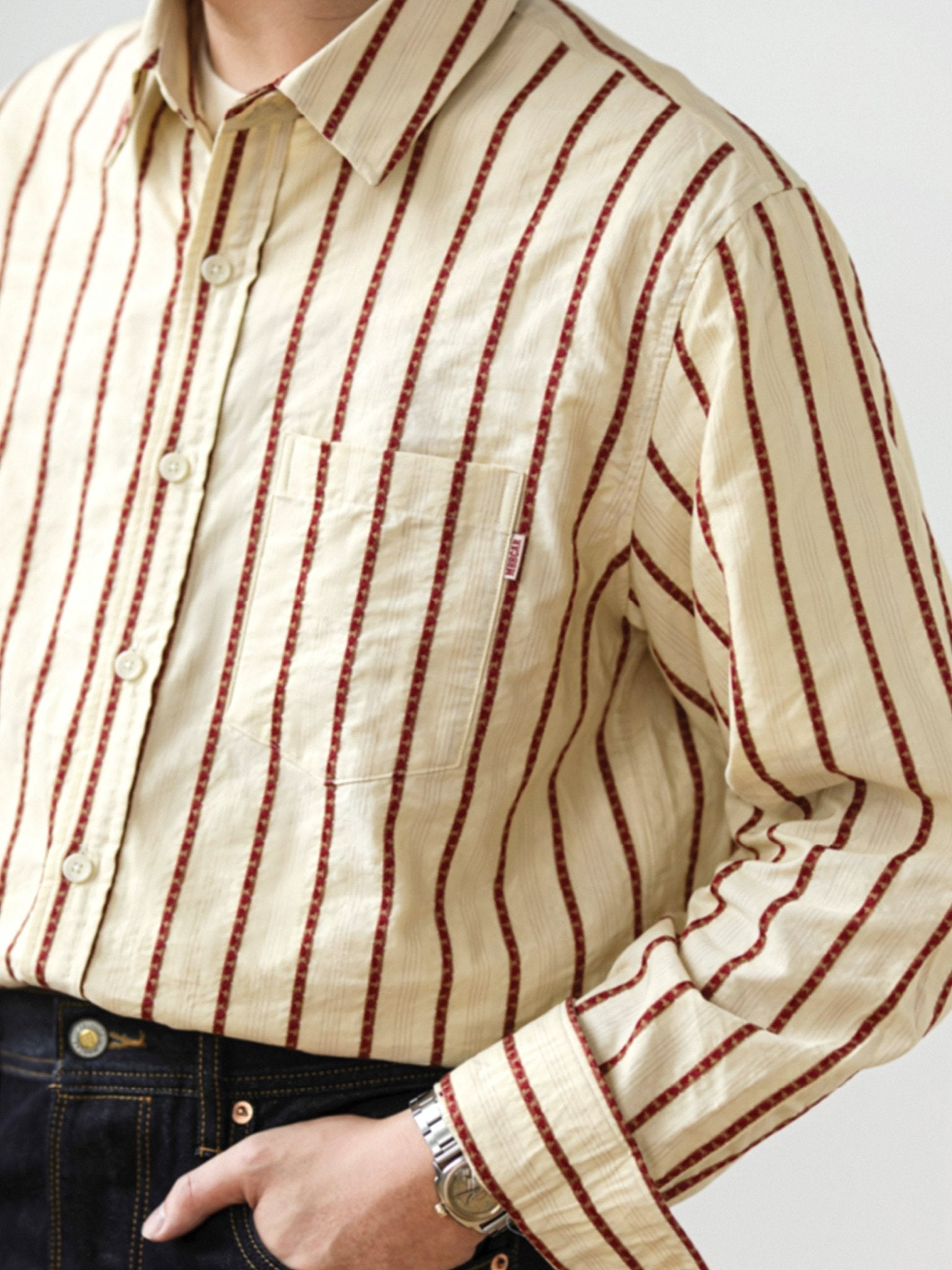 このシャツは、温かみのあるストライプとクリーム色の組み合わせを採用し、温かく調和のとれた視覚的効果を生み出しています。独特の凹凸のあるテクスチャ生地は服にレトロな雰囲気を与え、フワフワとした織り模様は温かさを増加させます。シャツには単一のポケットデザインと細かい刺繍模様が特徴的な要素を加えています。