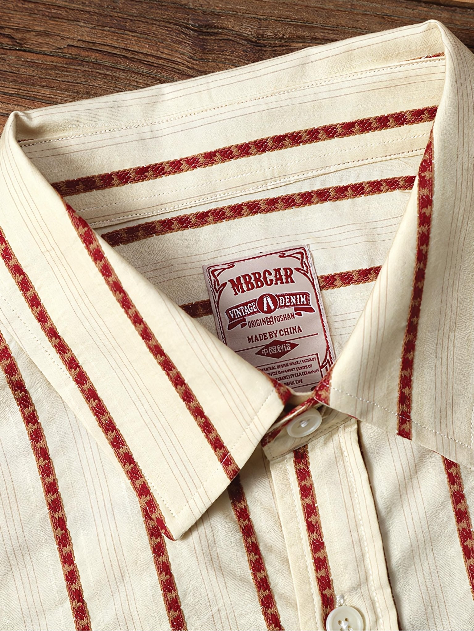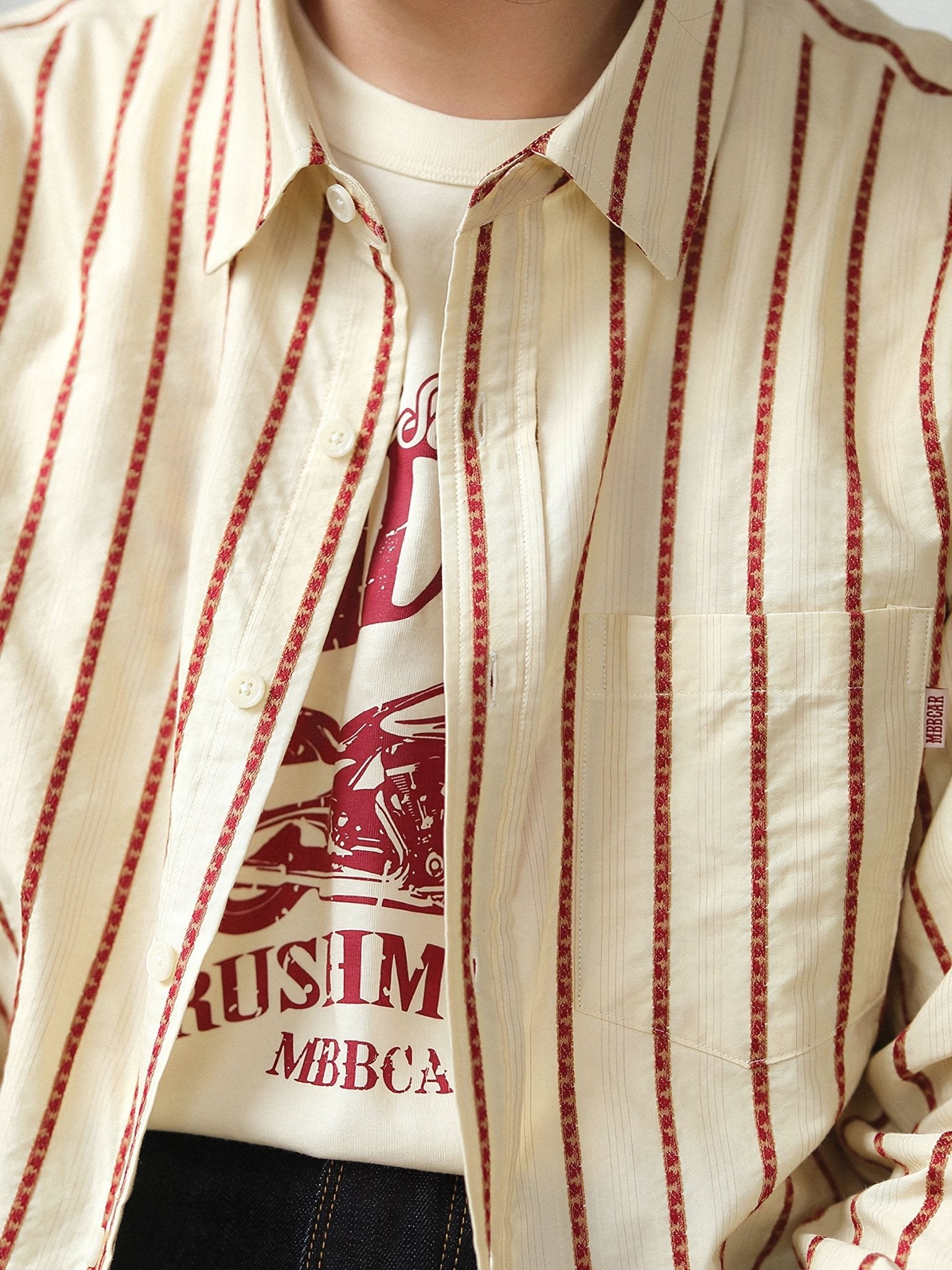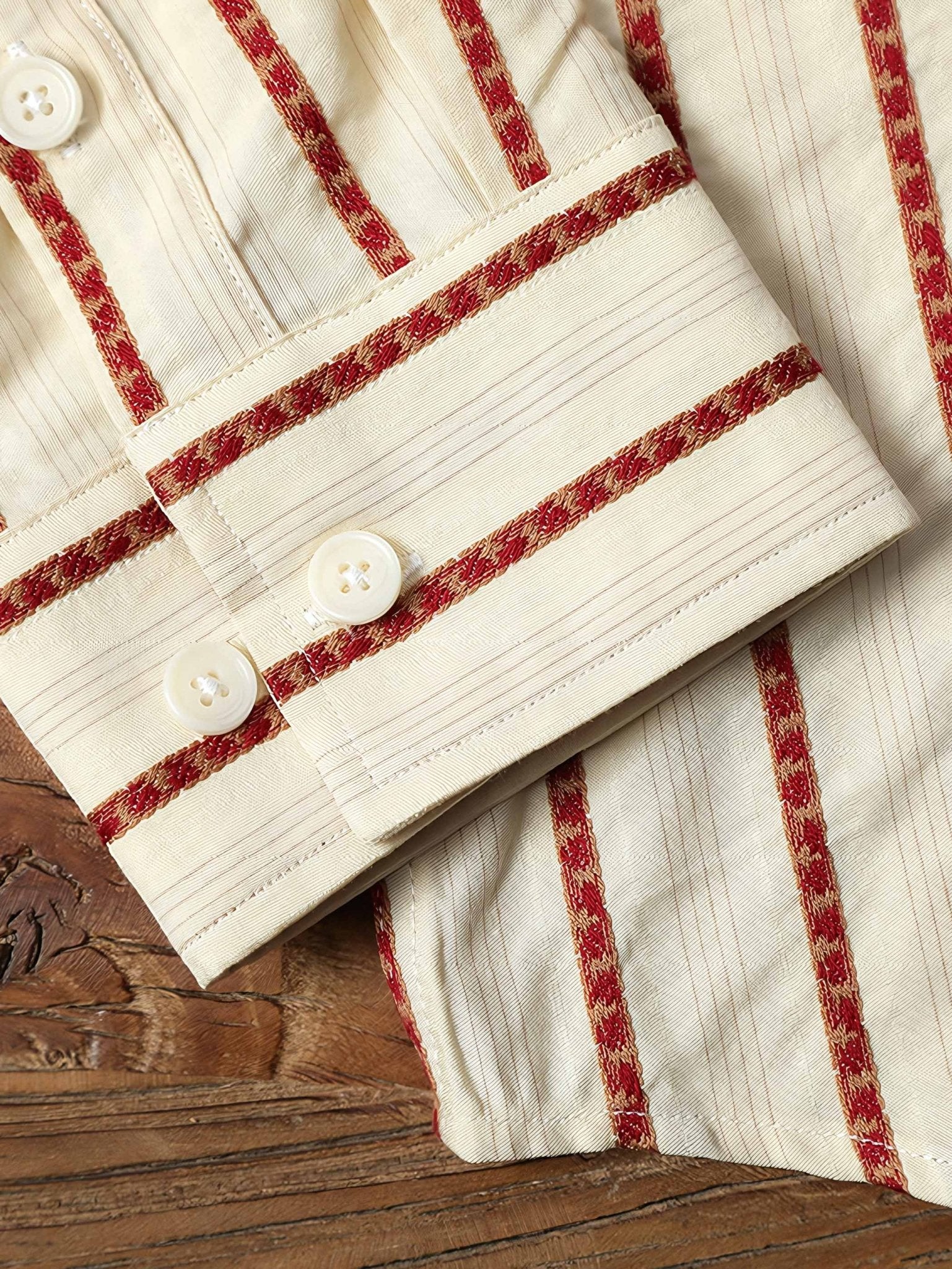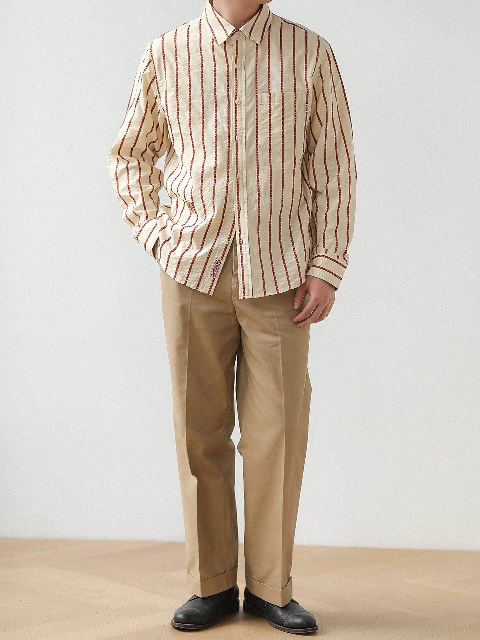 このシャツは、温かみのあるストライプとクリーム色の組み合わせを採用し、温かく調和のとれた視覚的効果を生み出しています。独特の凹凸のあるテクスチャ生地は服にレトロな雰囲気を与え、フワフワとした織り模様は温かさを増加させます。シャツには単一のポケットデザインと細かい刺繍模様が特徴的な要素を加えています。