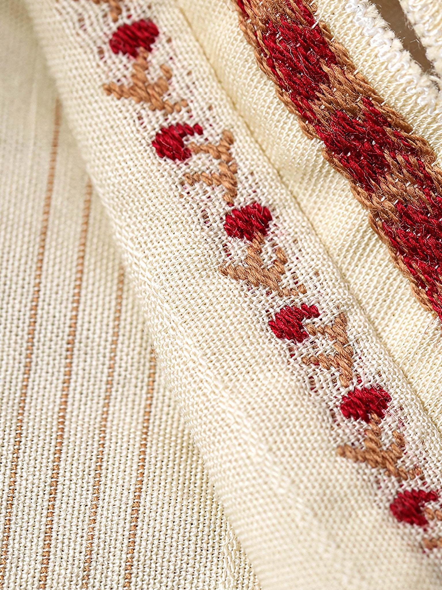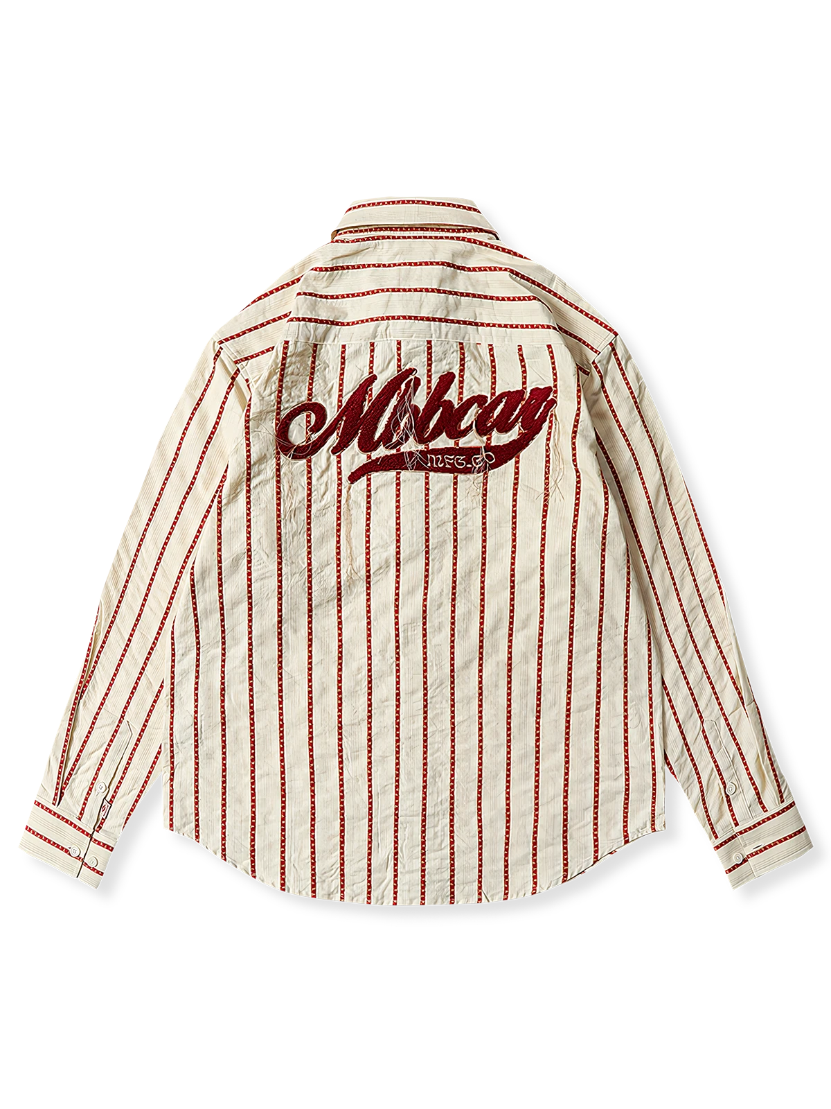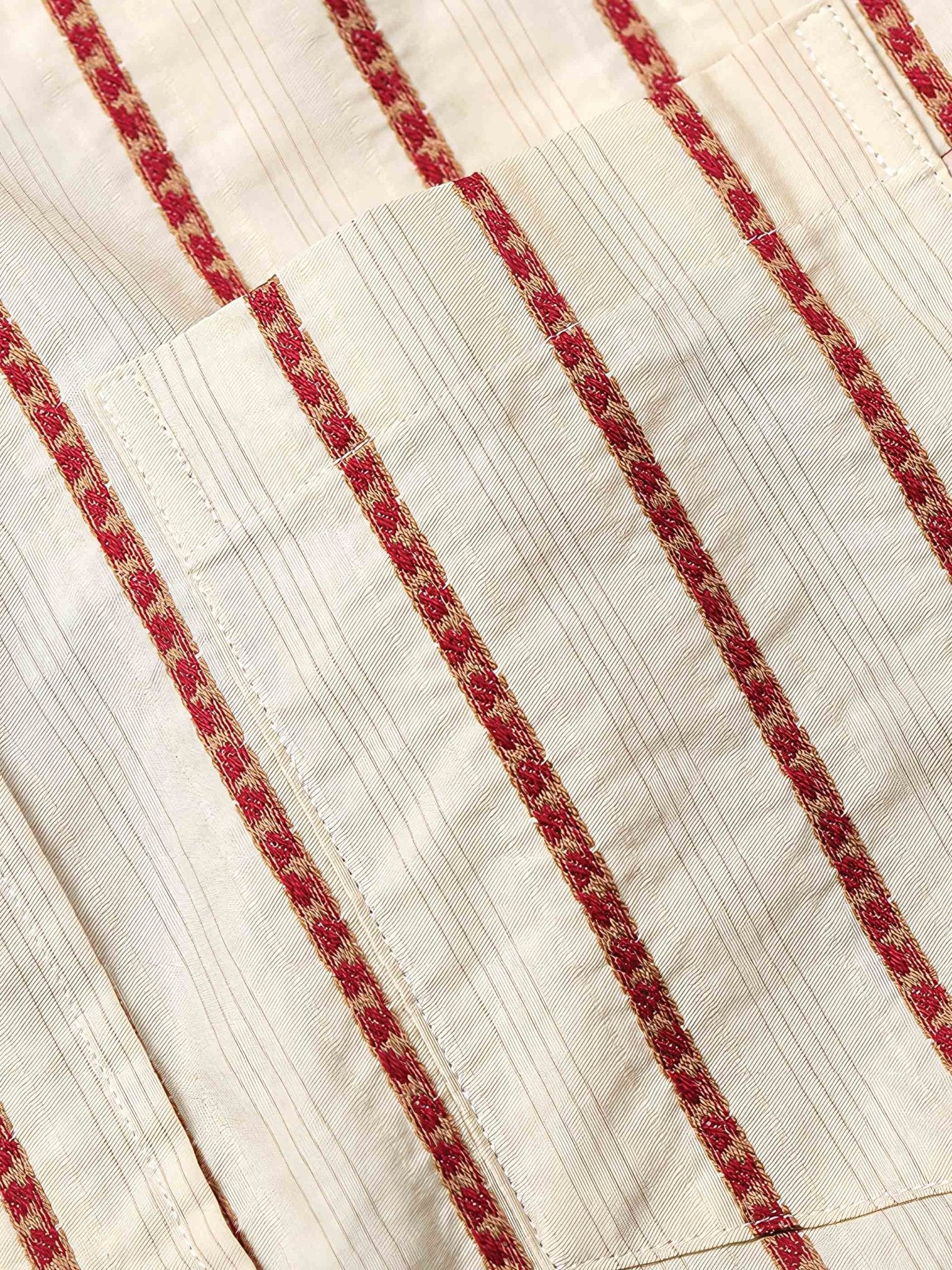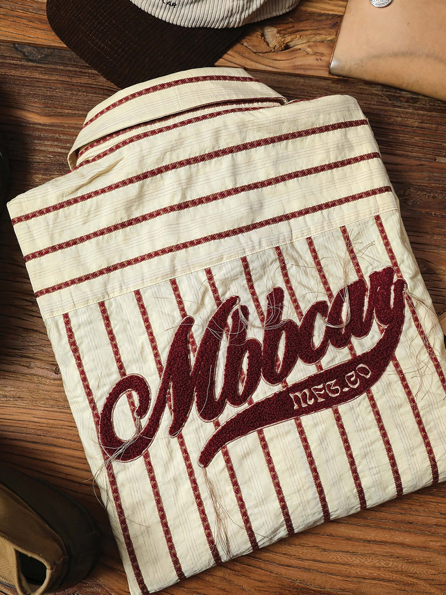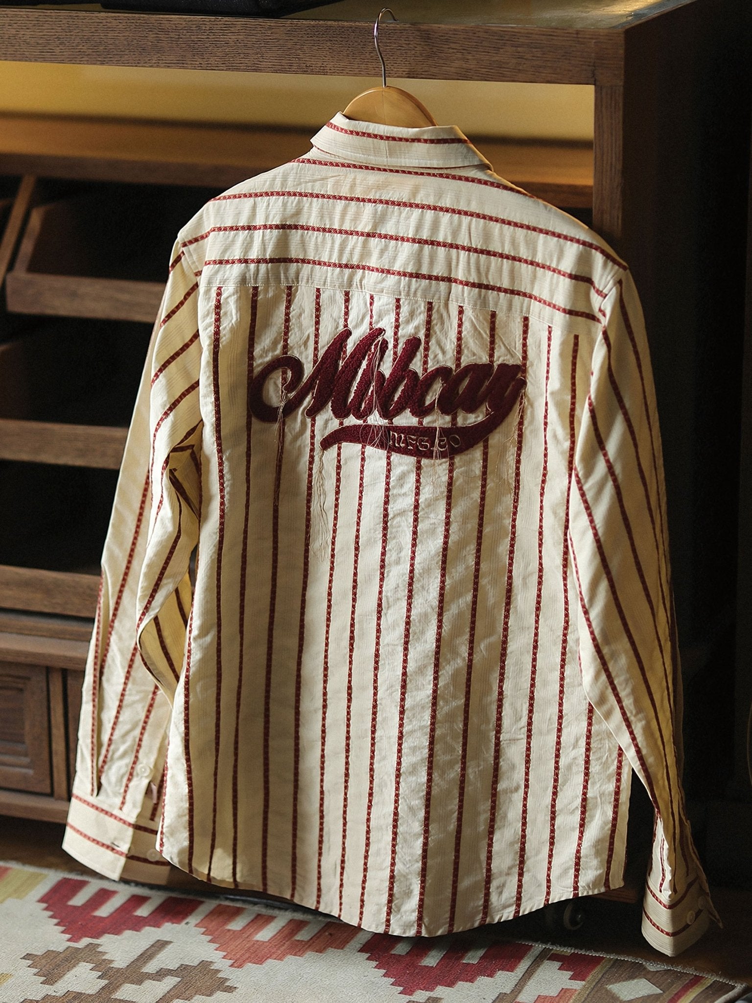 このシャツは、温かみのあるストライプとクリーム色の組み合わせを採用し、温かく調和のとれた視覚的効果を生み出しています。独特の凹凸のあるテクスチャ生地は服にレトロな雰囲気を与え、フワフワとした織り模様は温かさを増加させます。シャツには単一のポケットデザインと細かい刺繍模様が特徴的な要素を加えています。