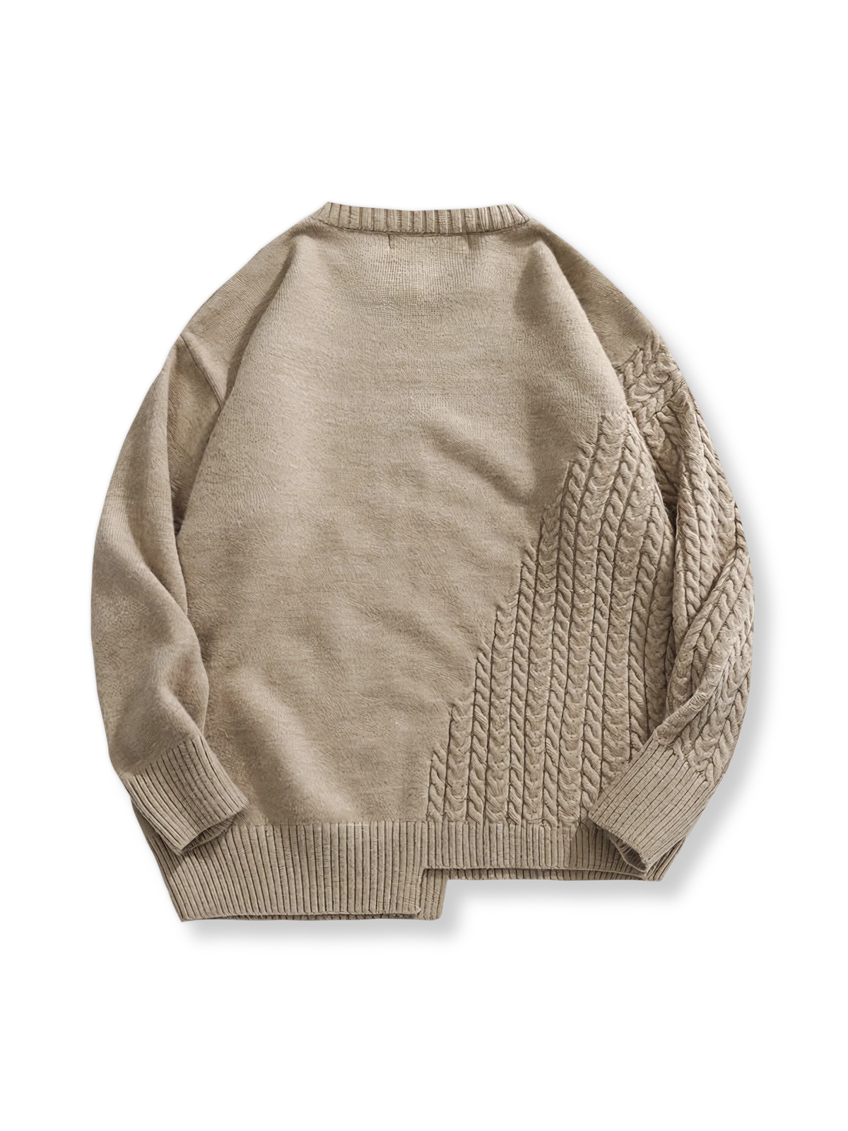 このベージュのニットセーターは、伝統的な編み模様を取り入れており、何世紀にもわたるニットウェアで人気のあるパターンで、レトロで手工芸の美しさを伝えています。