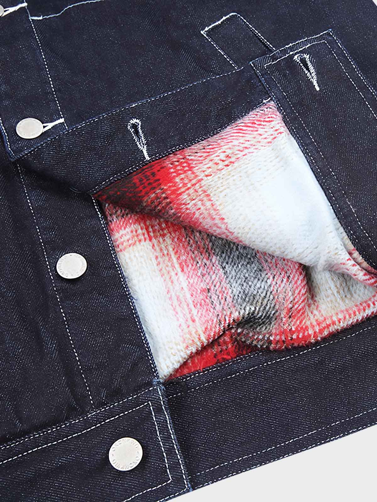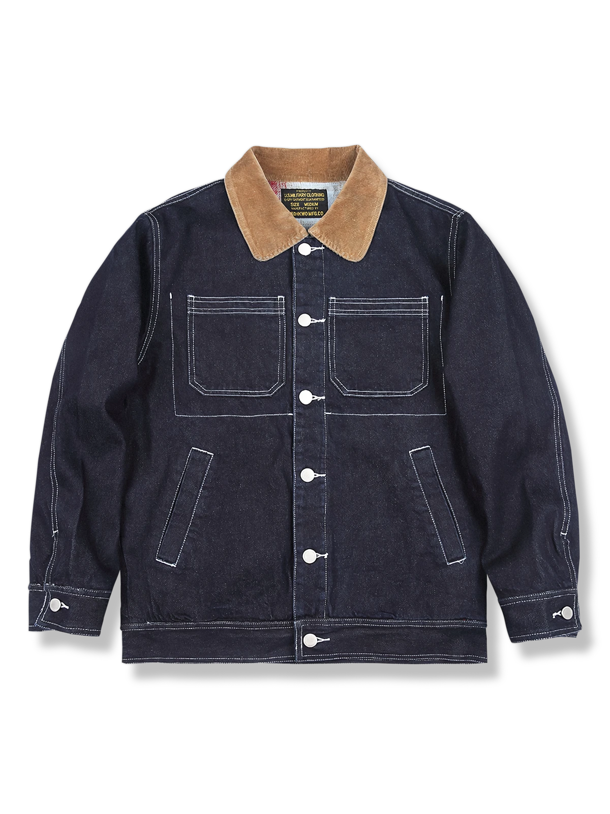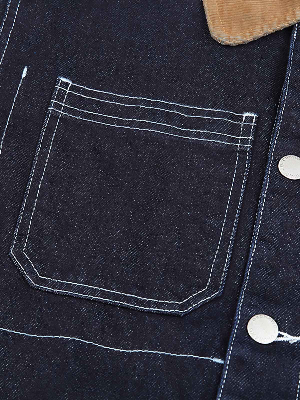 このジャケットはコーデュロイの襟と多ポケットデザインが特徴で、レトロと実用性を融合しています。デニム素材のクラシックなスタイルとストライプ要素が組み合わされ、レトロなトレンドと現代ファッションの融合を反映しています。
