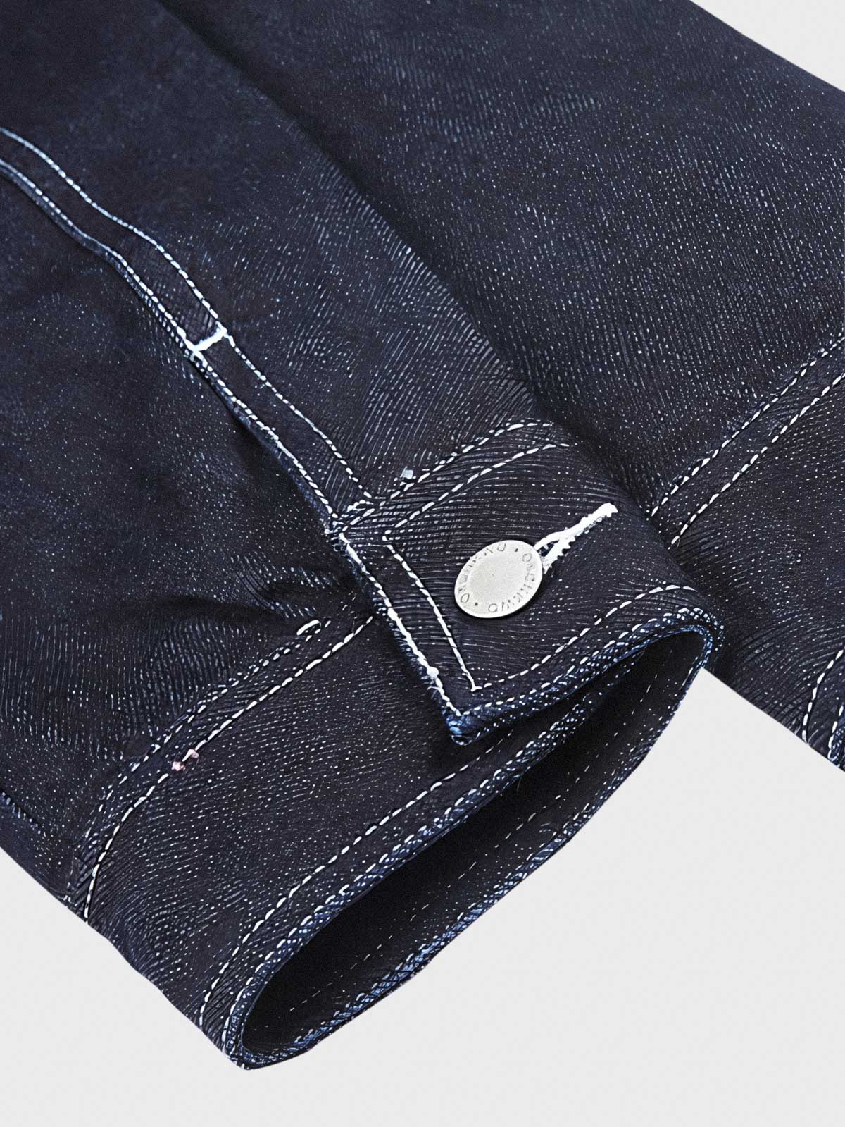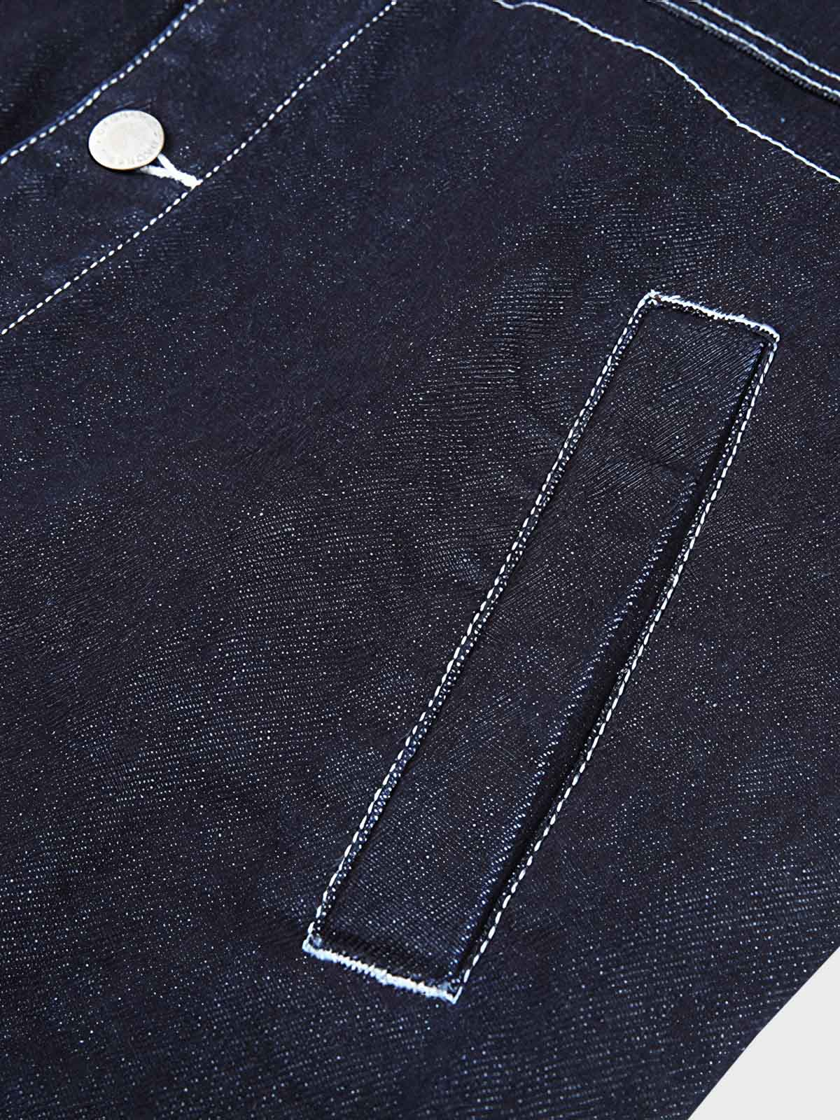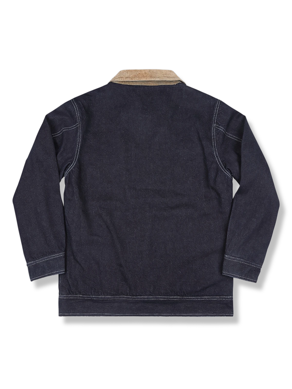 このジャケットはコーデュロイの襟と多ポケットデザインが特徴で、レトロと実用性を融合しています。デニム素材のクラシックなスタイルとストライプ要素が組み合わされ、レトロなトレンドと現代ファッションの融合を反映しています。