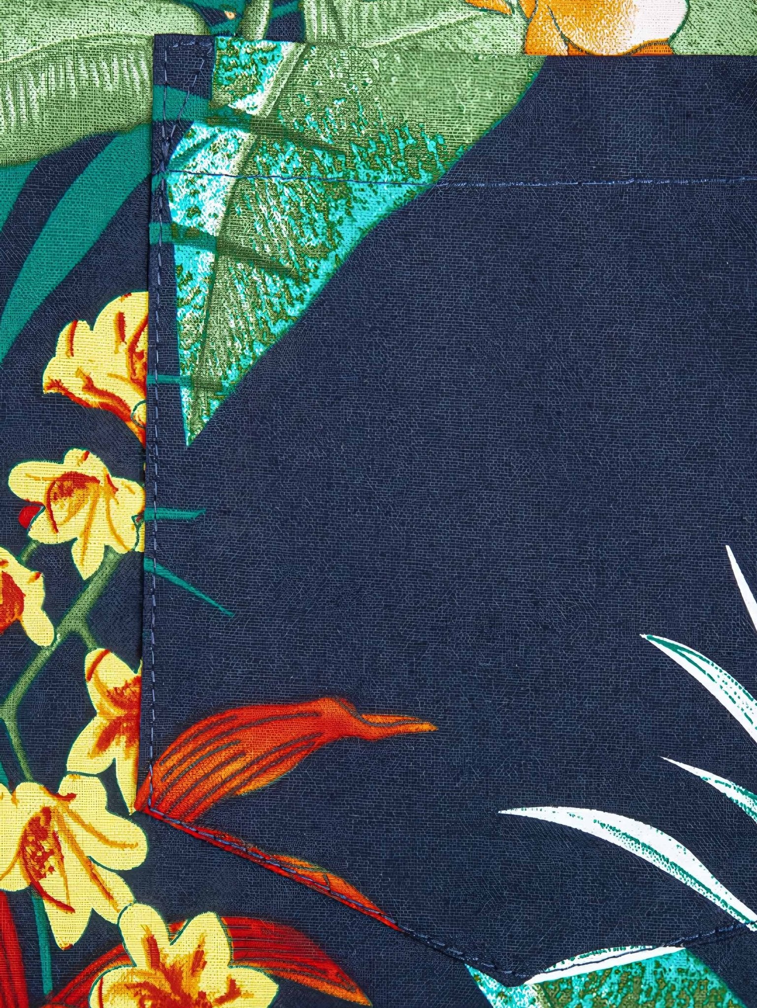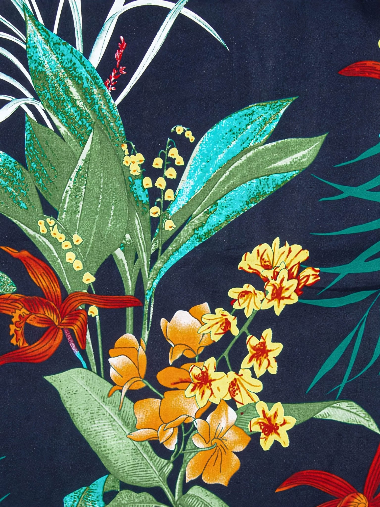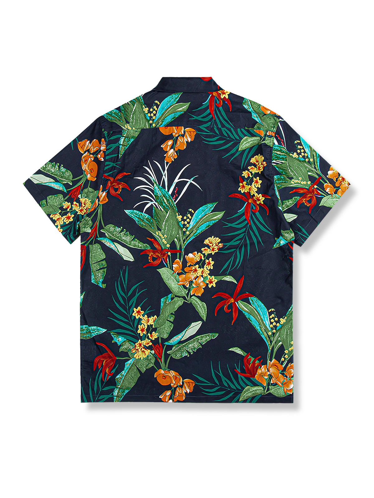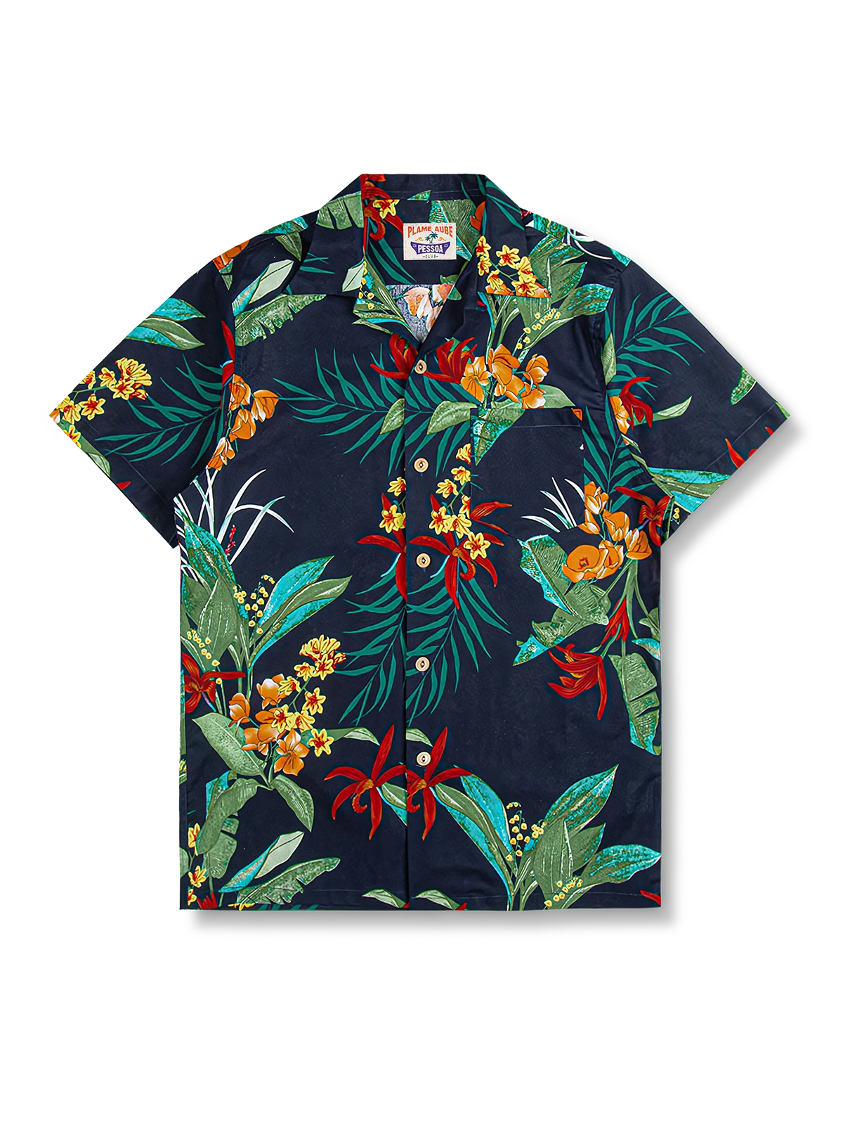 このネイビーを基調としたアロハシャツは、様々な植物の要素を採用しています。シンプルでありながらも活気にあふれたデザインであり、カジュアルな日常着に最適です。また、適度な余白を活用して、シャツ全体が視覚的に快適で調和の取れたものになるようにし、優雅な感覚を際立たせています。