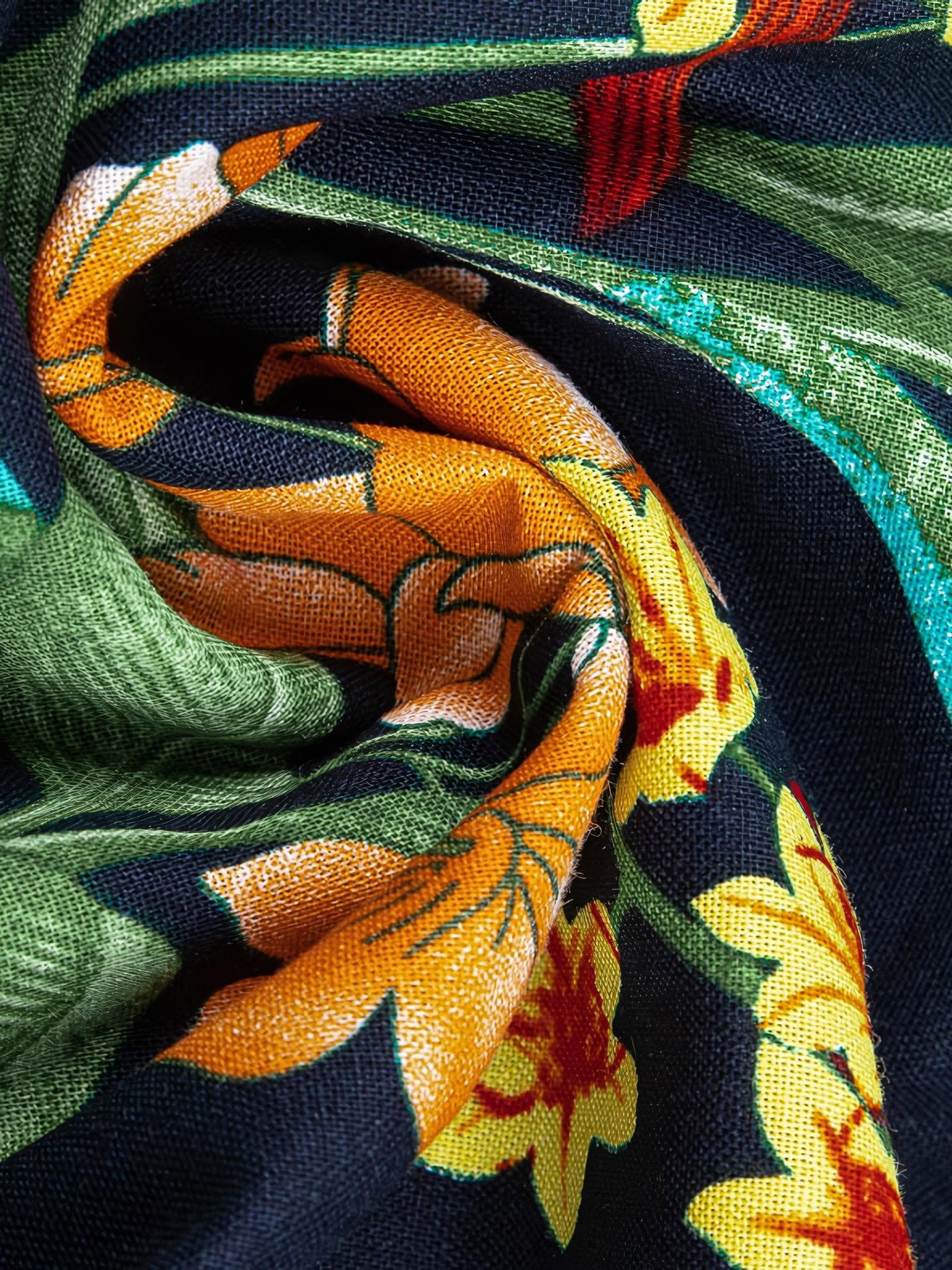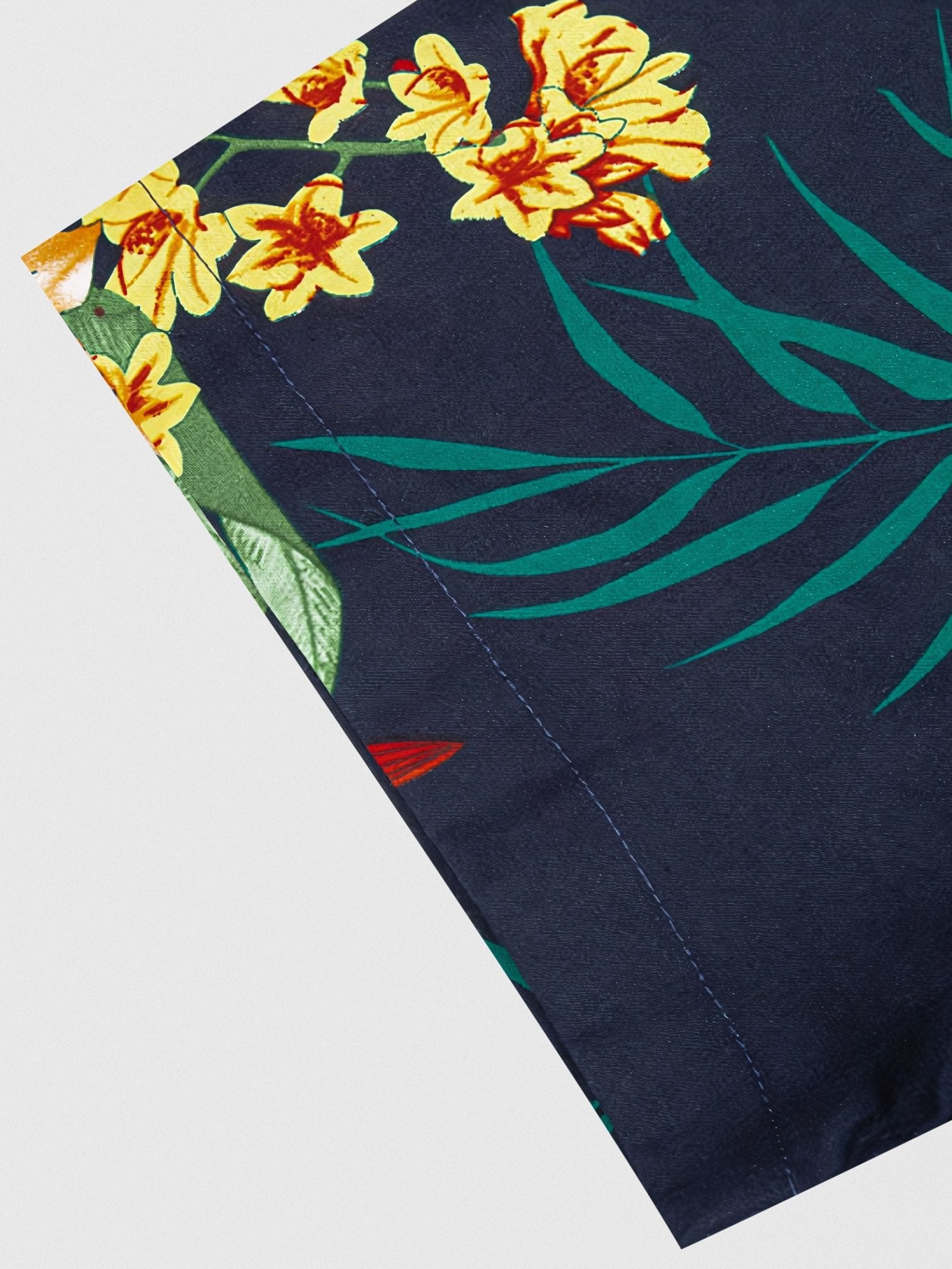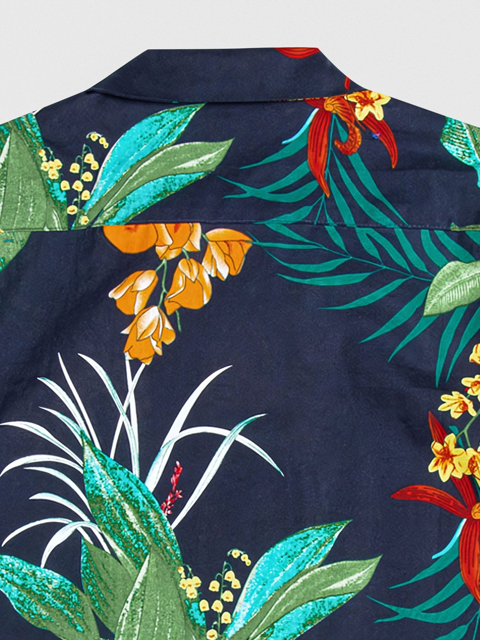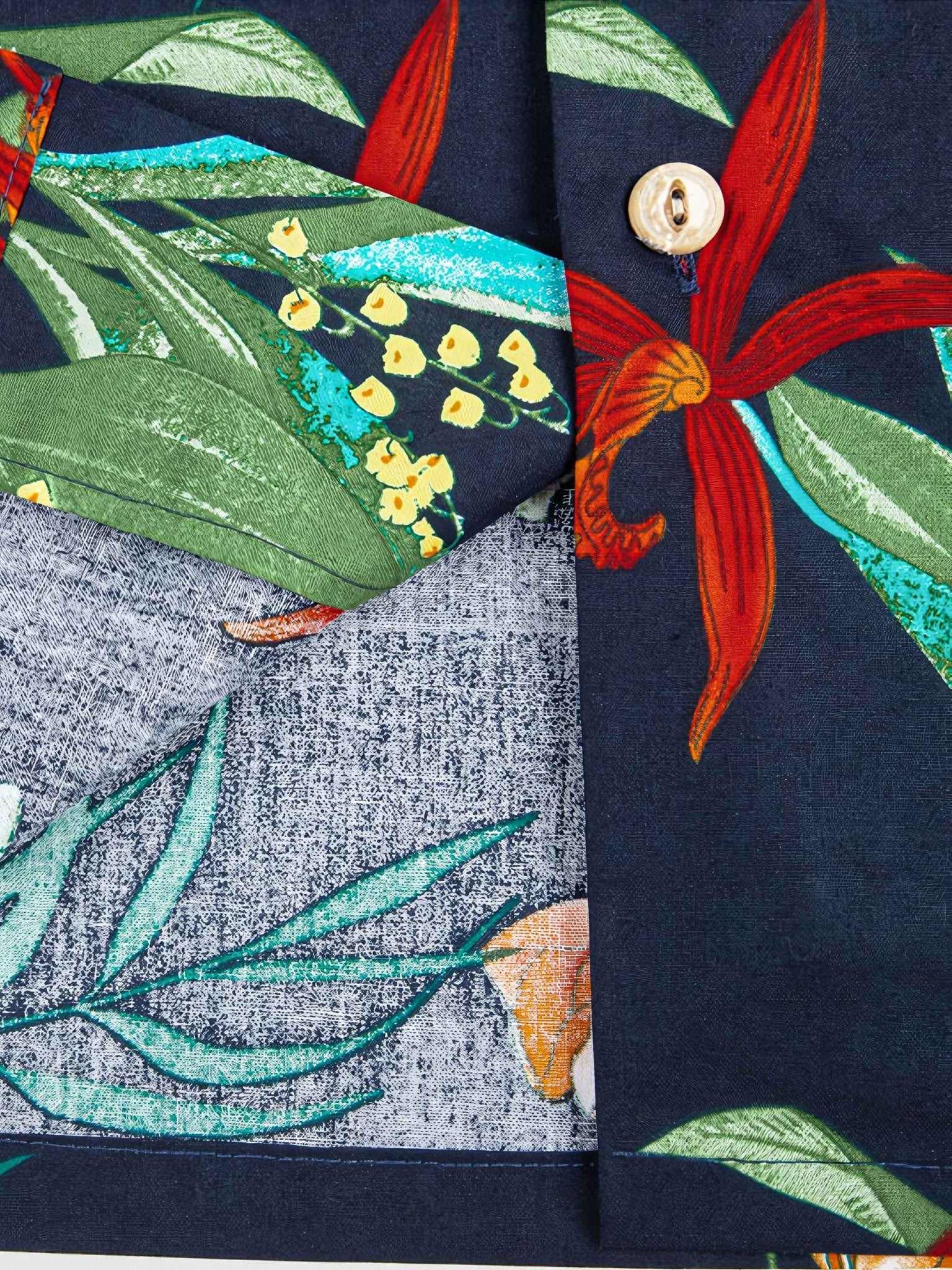 このネイビーを基調としたアロハシャツは、様々な植物の要素を採用しています。シンプルでありながらも活気にあふれたデザインであり、カジュアルな日常着に最適です。また、適度な余白を活用して、シャツ全体が視覚的に快適で調和の取れたものになるようにし、優雅な感覚を際立たせています。