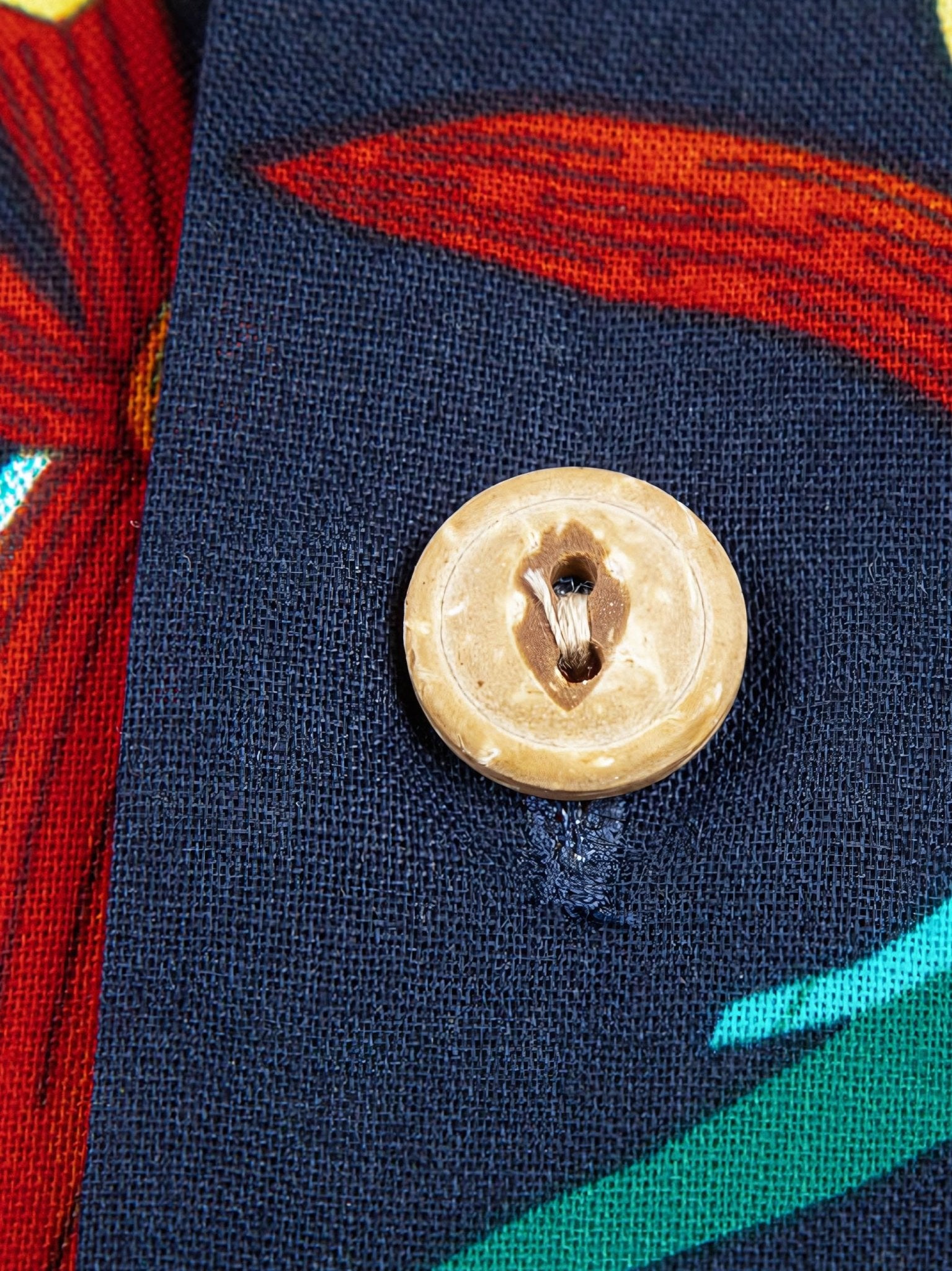 左胸にはポケットが付いており、ナチュラルココナッツシェルで研磨されたボタンが品質を高めています。全体的に精巧な印象を与え、ハワイアンスタイルの特徴にも合致しています。