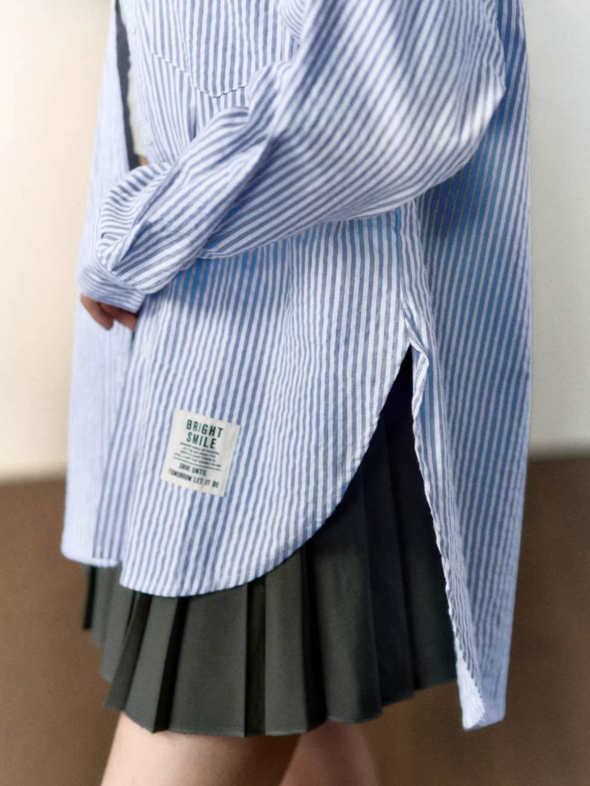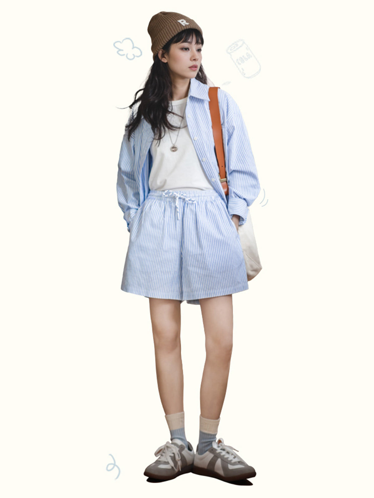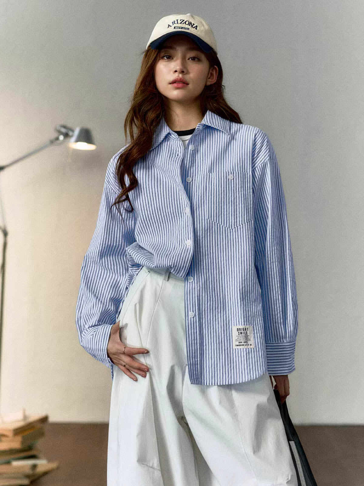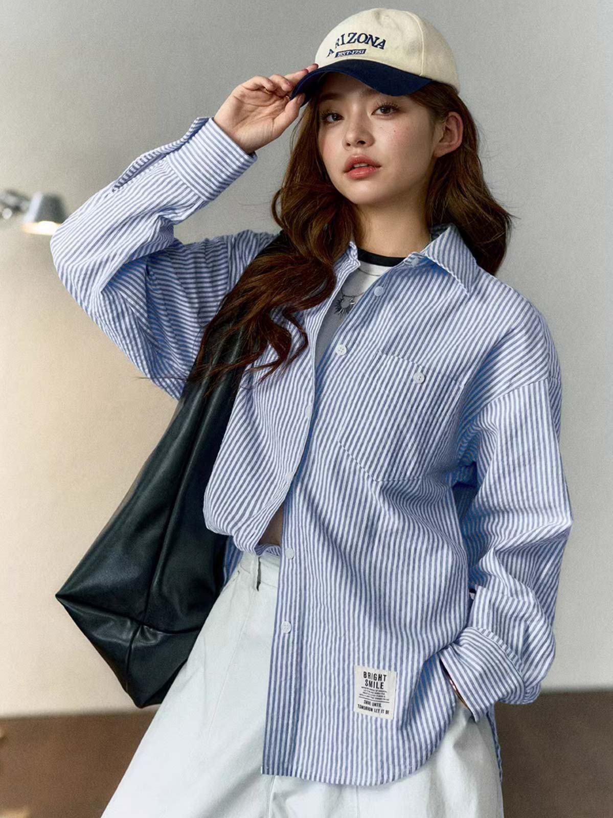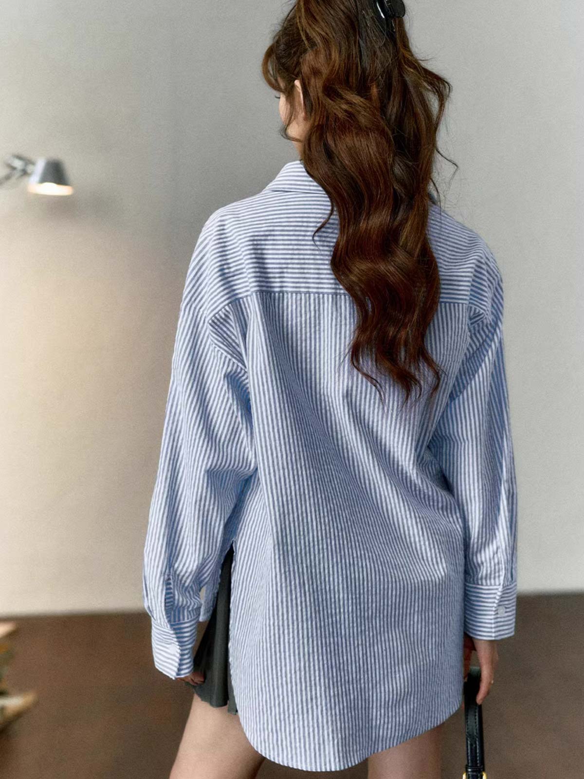 このシャツは100%リネンコットン素材を使用しており、快適さと通気性に優れています。フレンチブルーとホワイトの細いストライプが爽やかな視覚効果を演出し、ゆったりとしたシルエットは快適でリラックスした着心地を提供します。春夏には単品で着用するのに適しており、重ね着にも対応可能です。基本的なアイテムとしてだけでなく、アウターとしても中間層としても活躍し、全体の色調を調和させながら、ワードローブ内で実用的かつスタイリッシュな選択肢となっています。