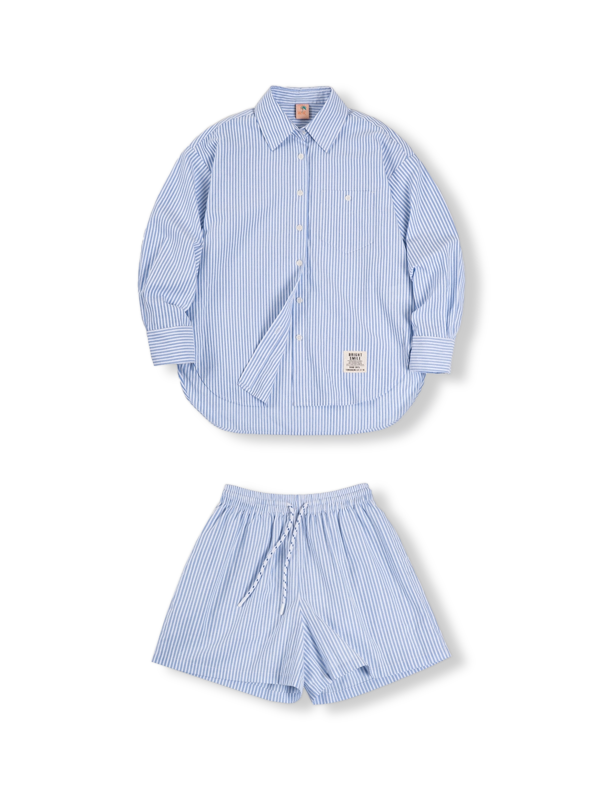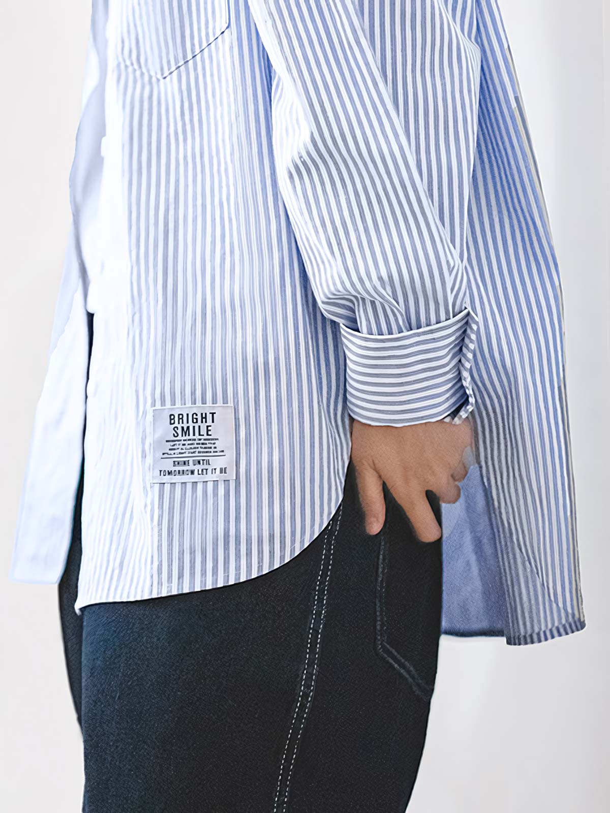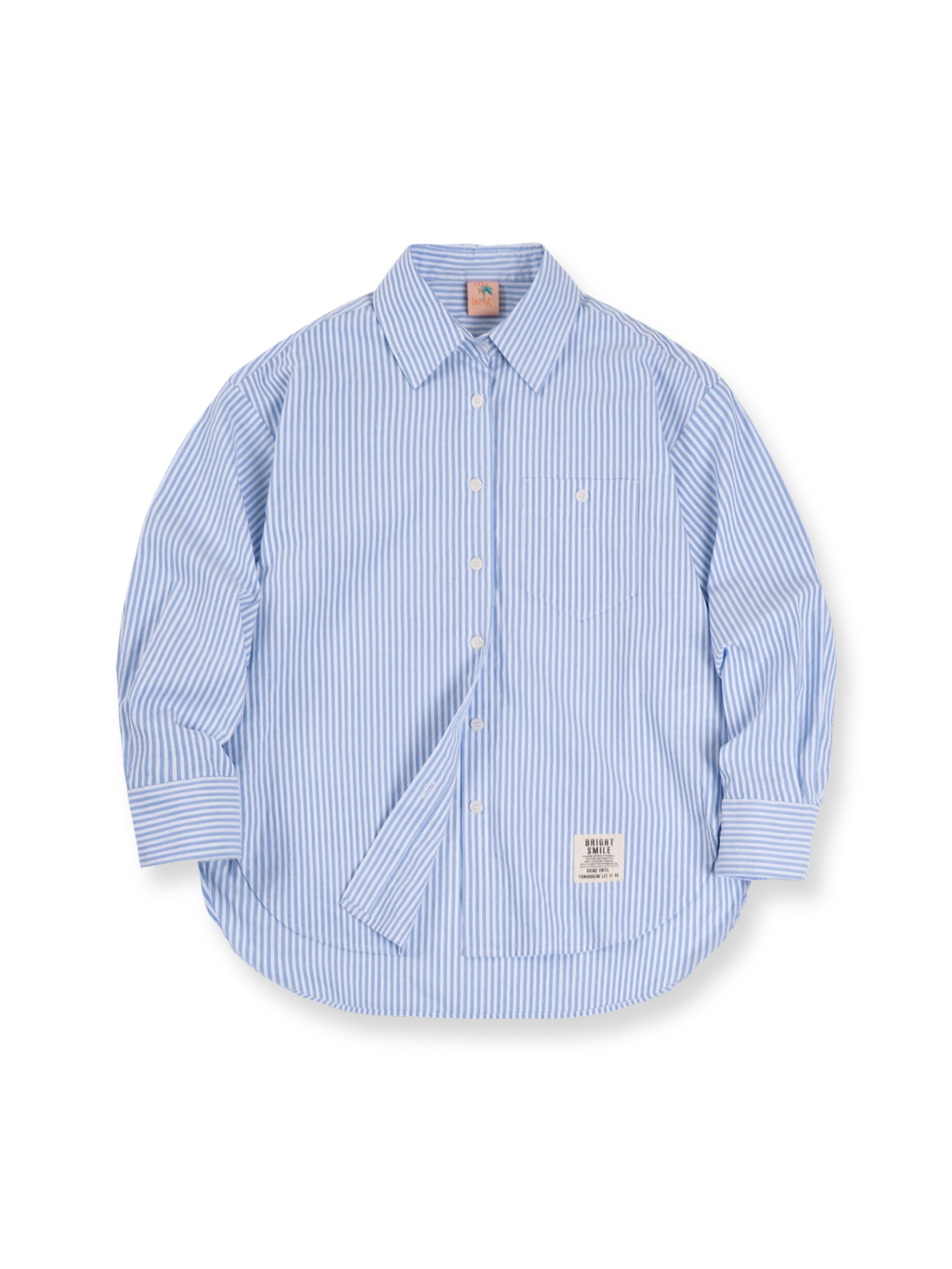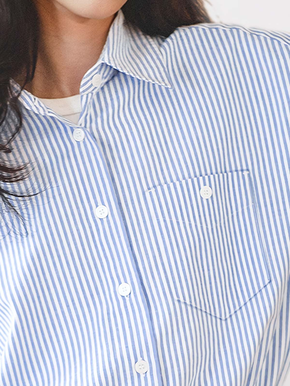 クラシックなフレンチブルーとホワイトの細いストライプが特徴のこのシャツは、清潔感とリラックスしたカジュアルスタイルを提供します。
