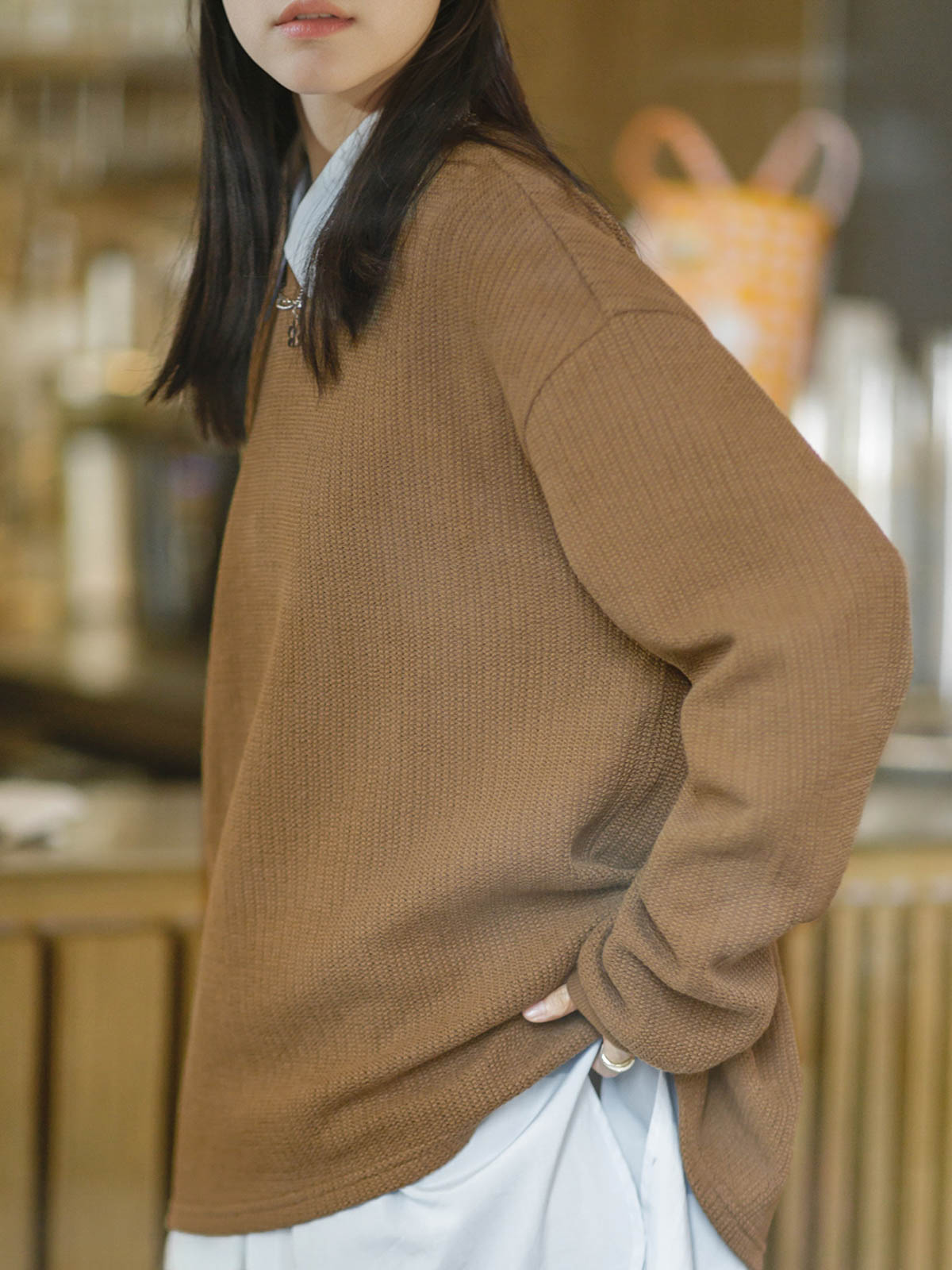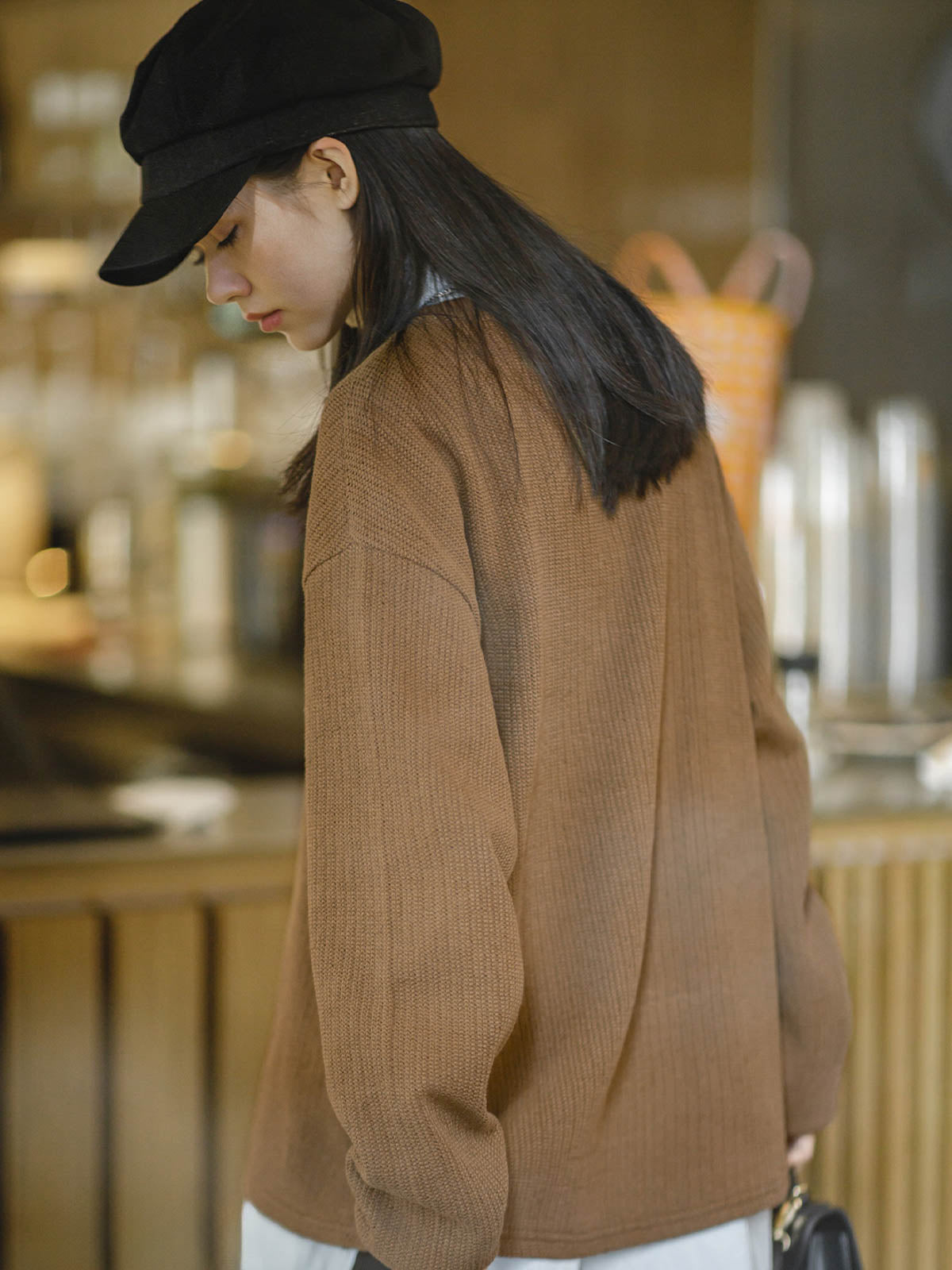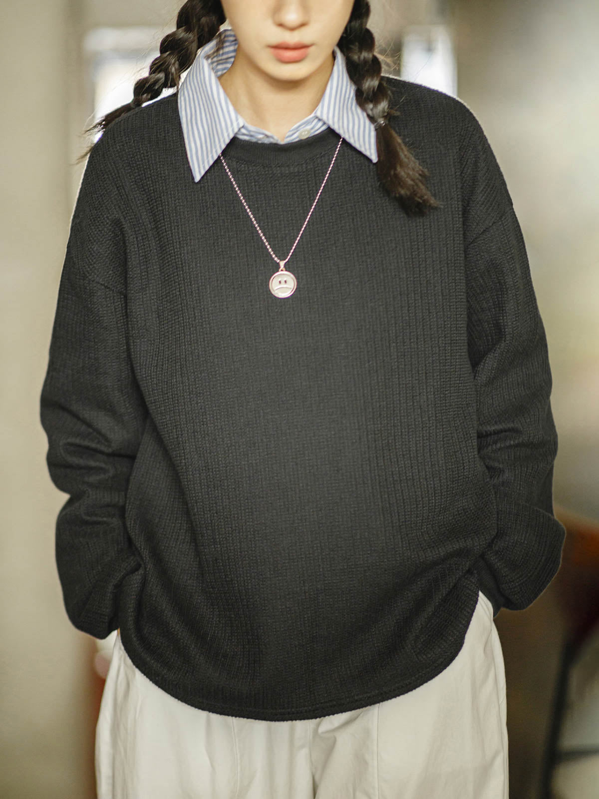 この麦穂テクスチャーのプルオーバーは、特殊な編み技術を使用しており、混紡素材をはっきりとした立体的な模様に織り上げています。内側は滑らかで肌触りが良く、重ね着に最適です。カーキグリーンとクラシックブラックの2色展開で、シンプルながらスタイリッシュな印象を与えます。ゆったりとしたシルエットとスリム効果のあるドロップショルダーデザイン、リブ編みの袖口がリラックスした雰囲気を演出し、秋、冬、春の3シーズンに対応します。デニムやその他のアイテムと組み合わせるだけで、簡単にレトロなユニセックススタイルを作り出せます。