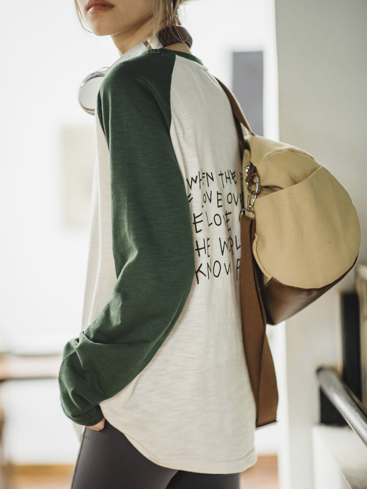 アカデミックスタイルとアメリカンヴィンテージ風の文字プリントラグランスリーブ長袖Tシャツ。