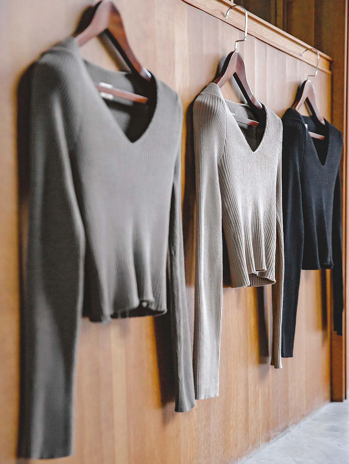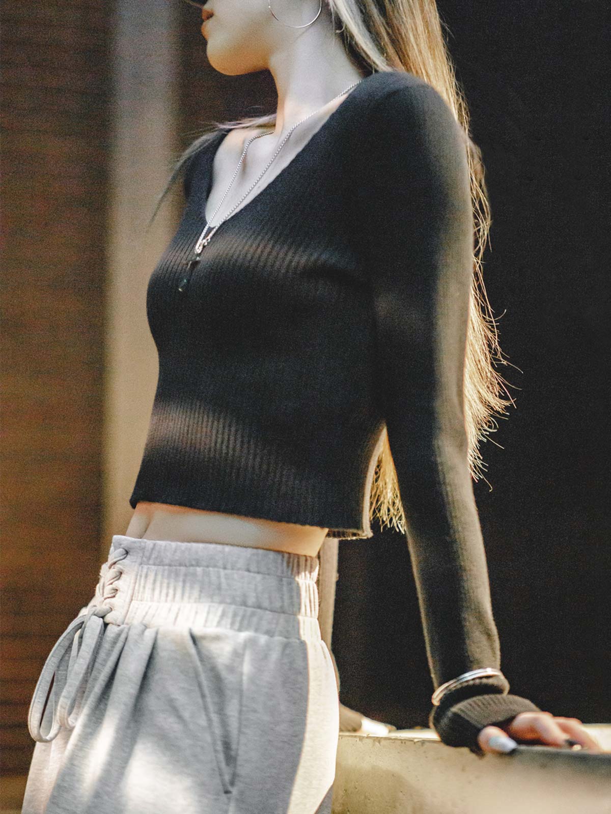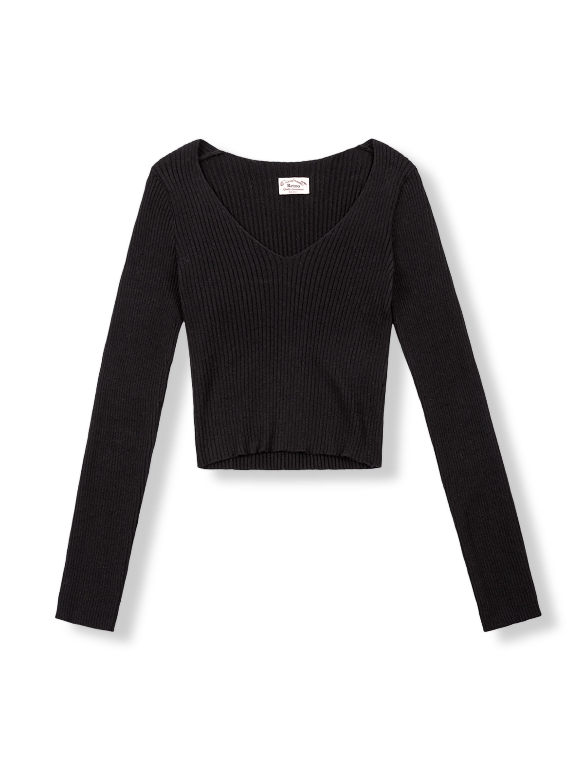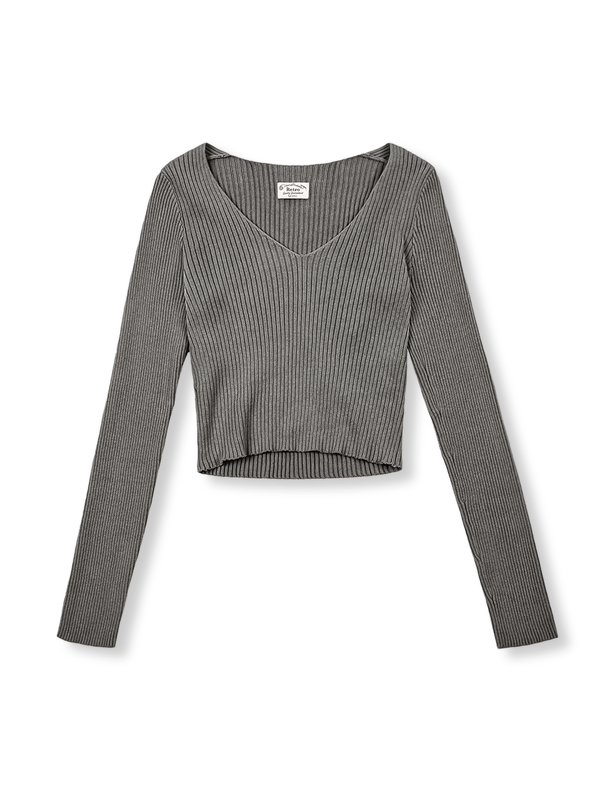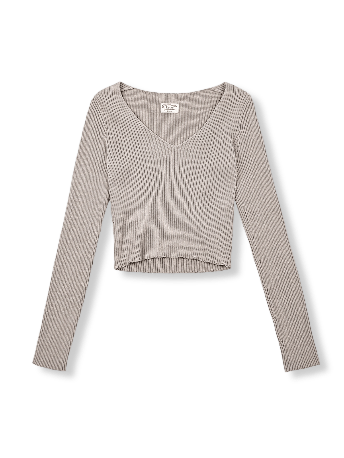 スリムでスタイリッシュなVネックショート丈ロングスリーブニットセーター、秋冬に最適。