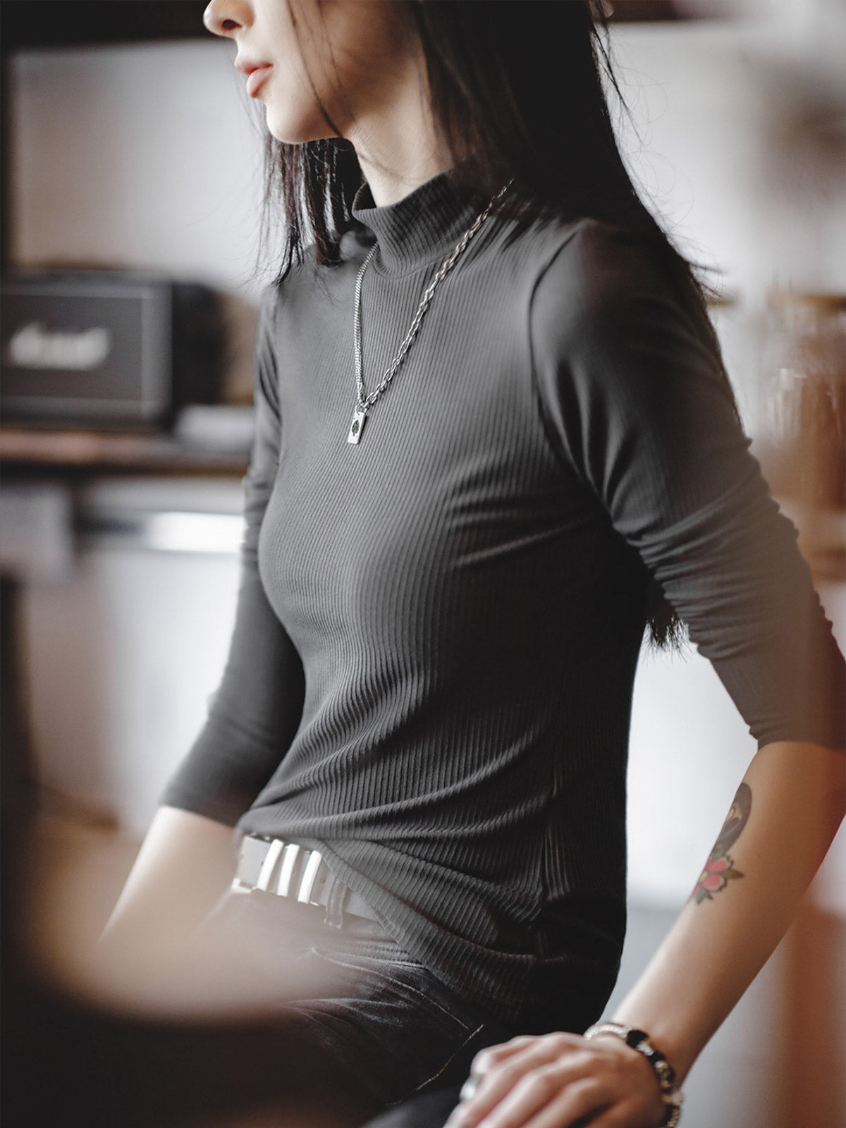 基本的で万能な半高領縦縞インナー、簡単にシルエットを強調し、秋冬のコーディネートに最適。