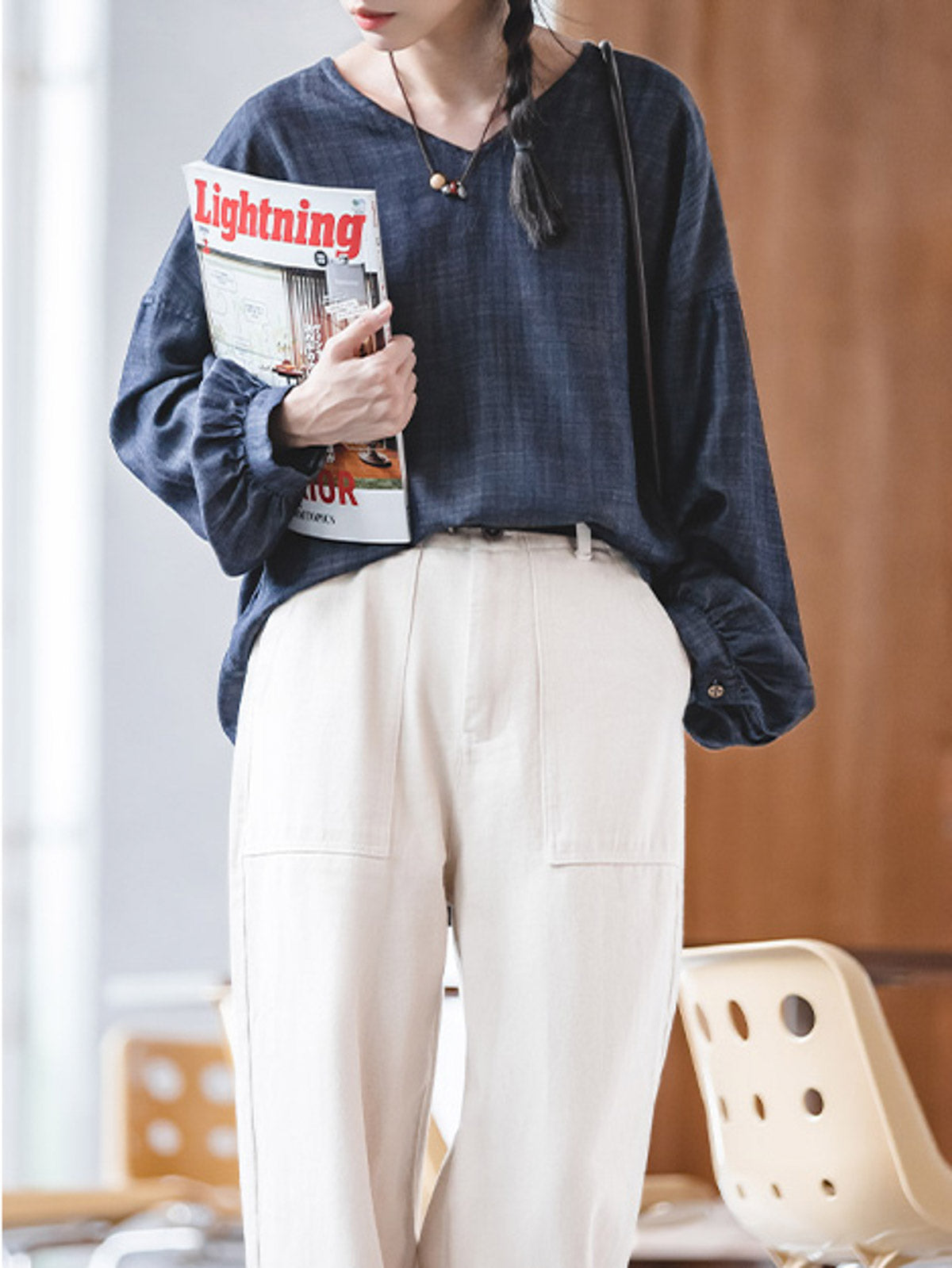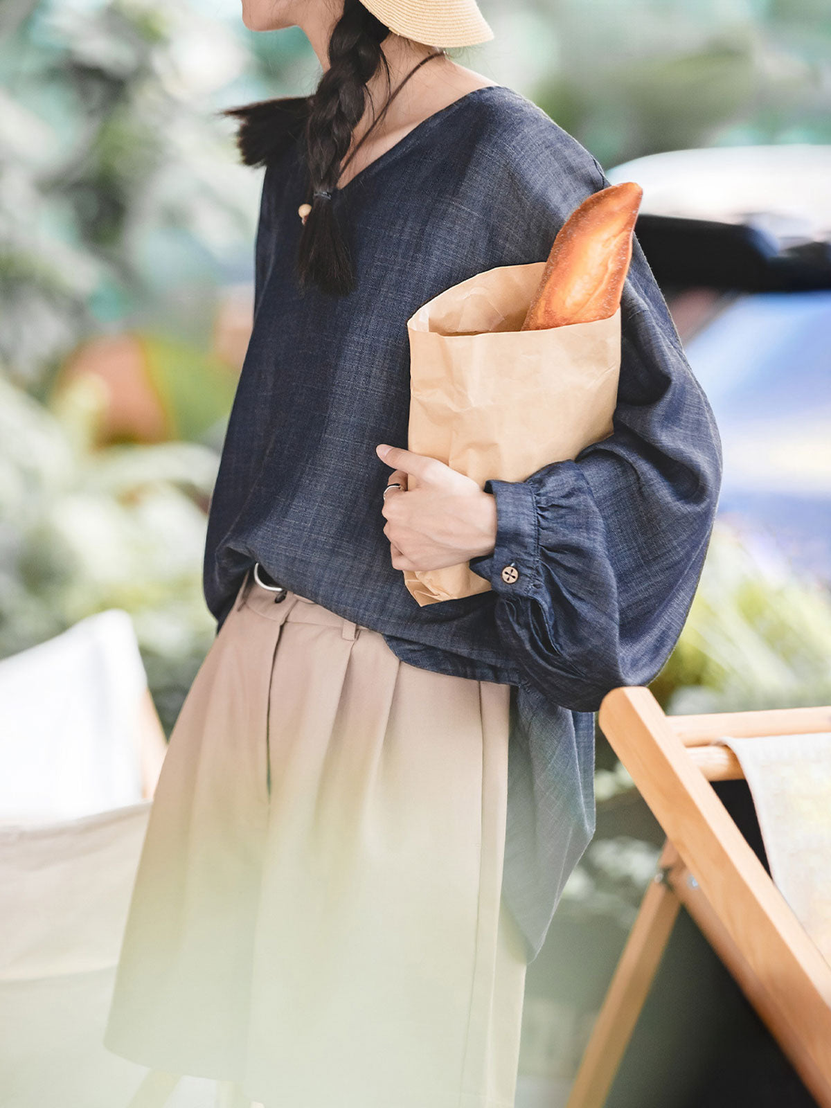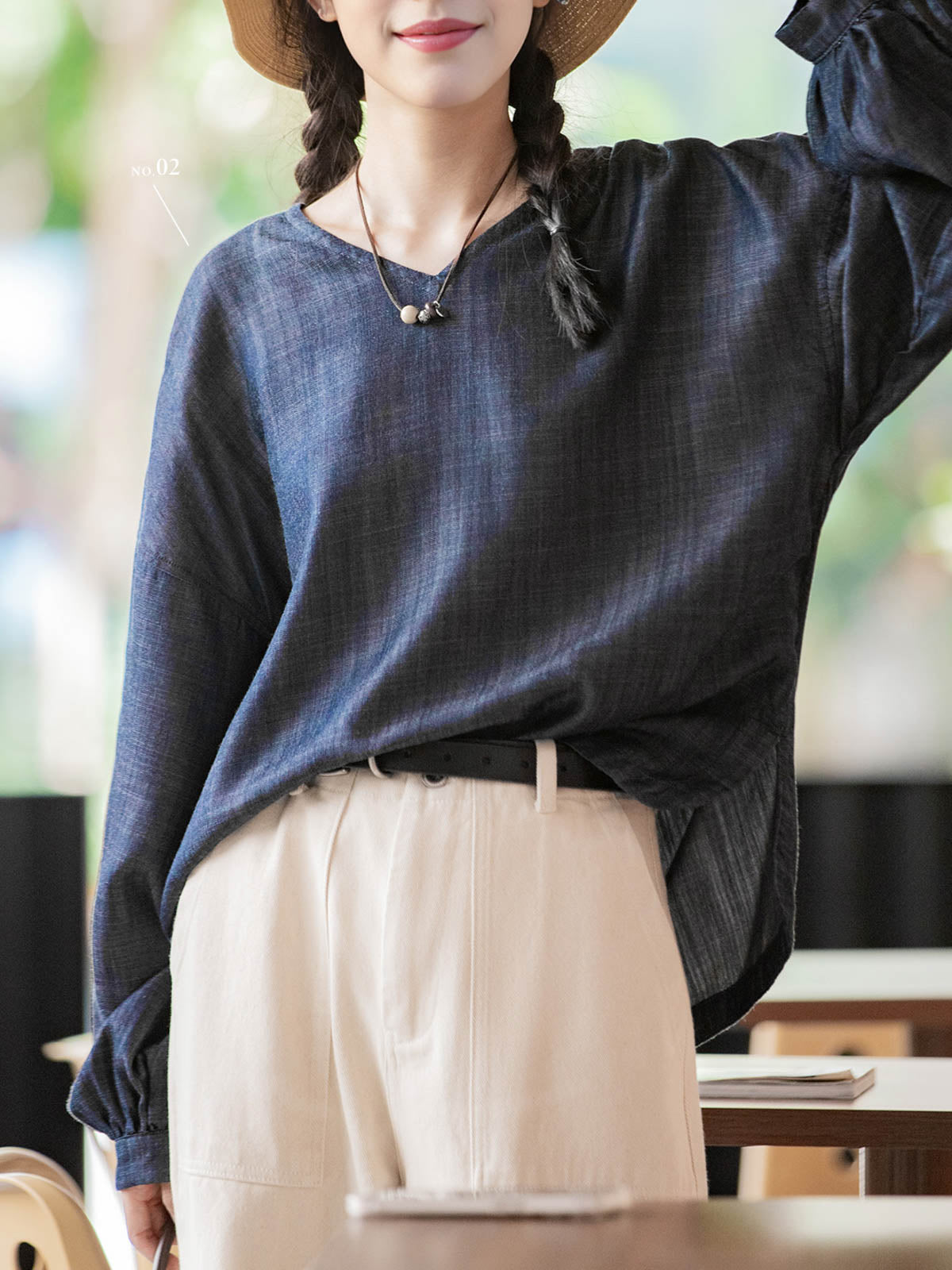 このライセルテンセル防晒シャツは、100%ランジンライセル繊維で作られており、生地は柔らかく通気性があり、抗菌性と環境に優しい特性を持つため、夏の着用に最適です。深いブルーの和風ヴィンテージカラーは、バルーンスリーブと手作り感のある木製ボタンと組み合わせて、リラックスしたナチュラルな雰囲気を醸し出します。Vネックデザインが首元を引き立て、小顔効果があります。ゆったりとしたシルエットカットは、動きやすく、スリムな効果があります。カーブしたヘムとサイドスリットデザインが、シャツにデザイン性と柔軟性を加えています。テンセルデニム素材の竹節のような質感と光沢感が、自然に近い手作り感を提供し、和風スタイルのコーディネートにぴったりです。