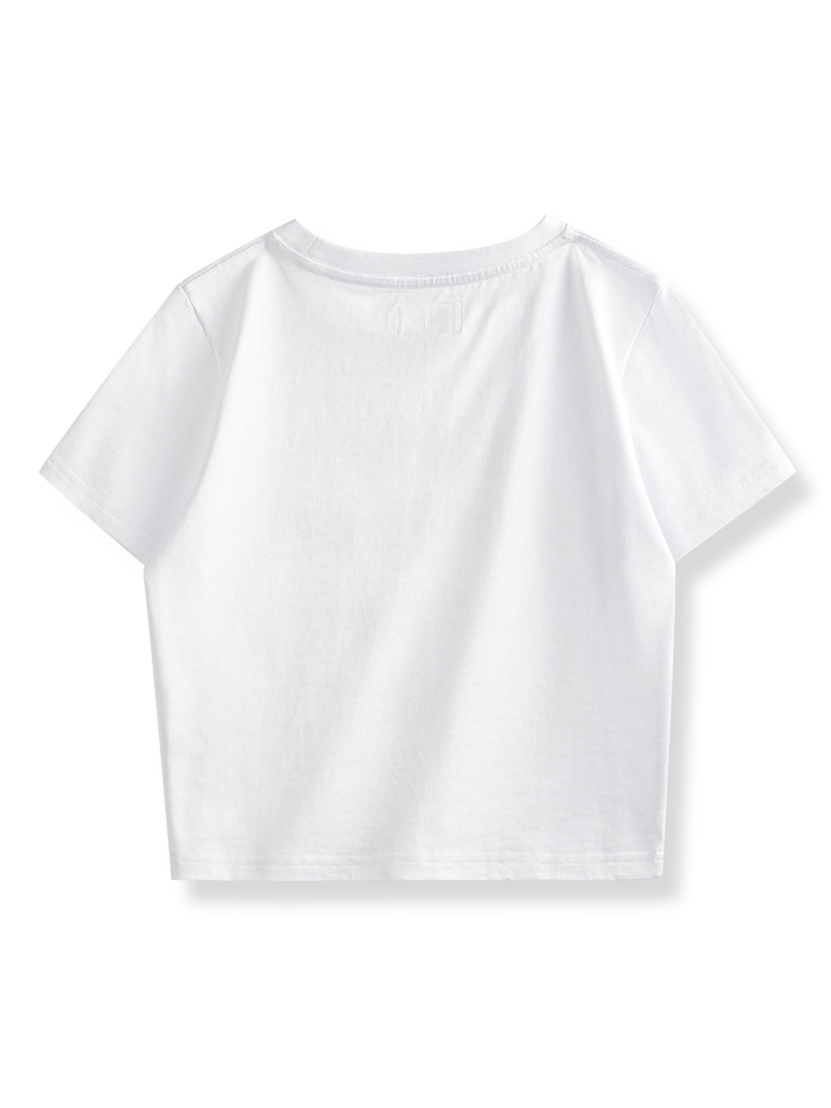 四つの言語でのクリエイティブなプリントが国際的な魅力を表現するTシャツ。