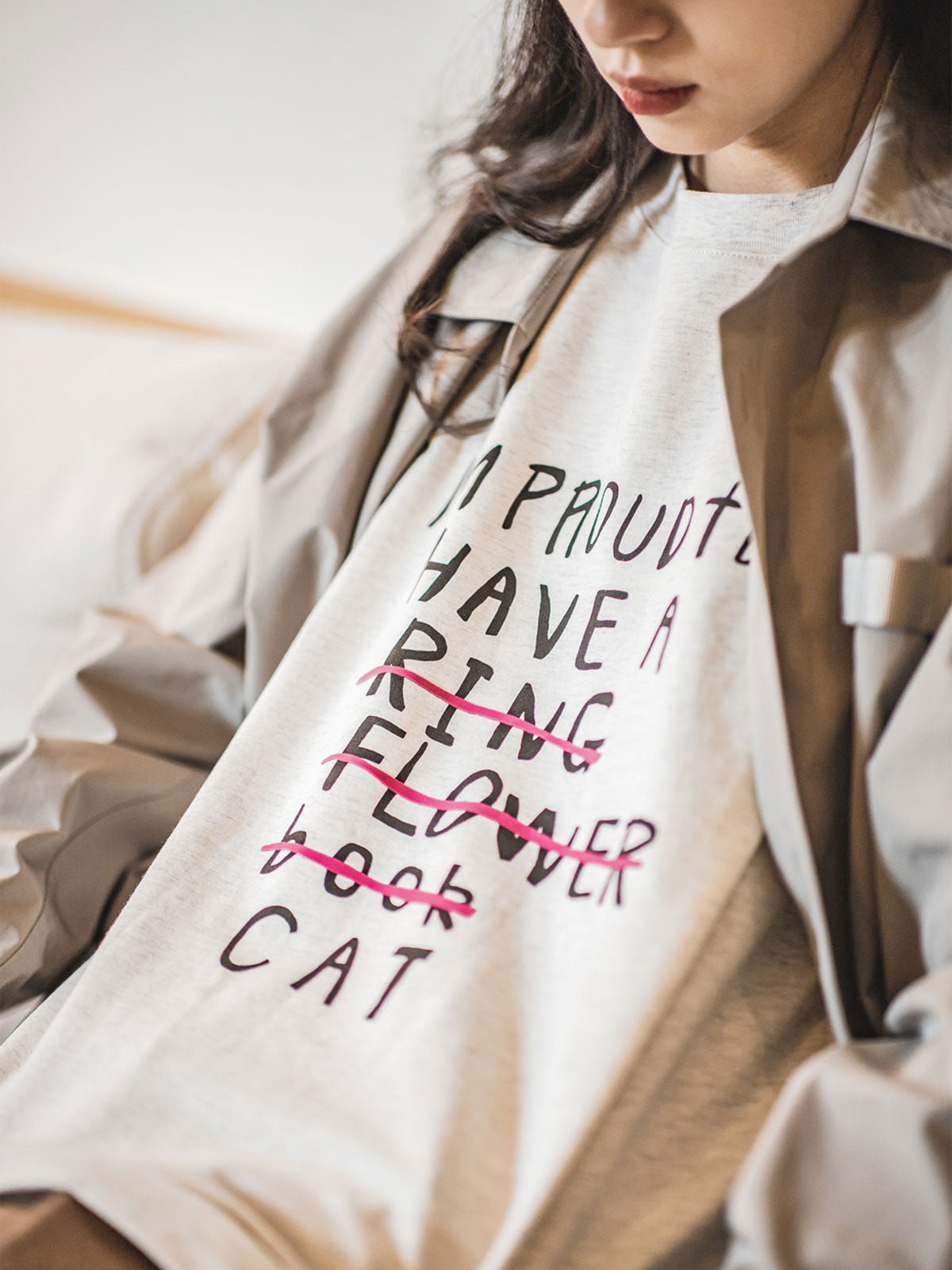 「I'M PROUD TO HAVE A CAT」というユニークな文字プリントが特徴的なTシャツで、快適な素材とカジュアルなデザインが日常のファッションを楽しく演出します。