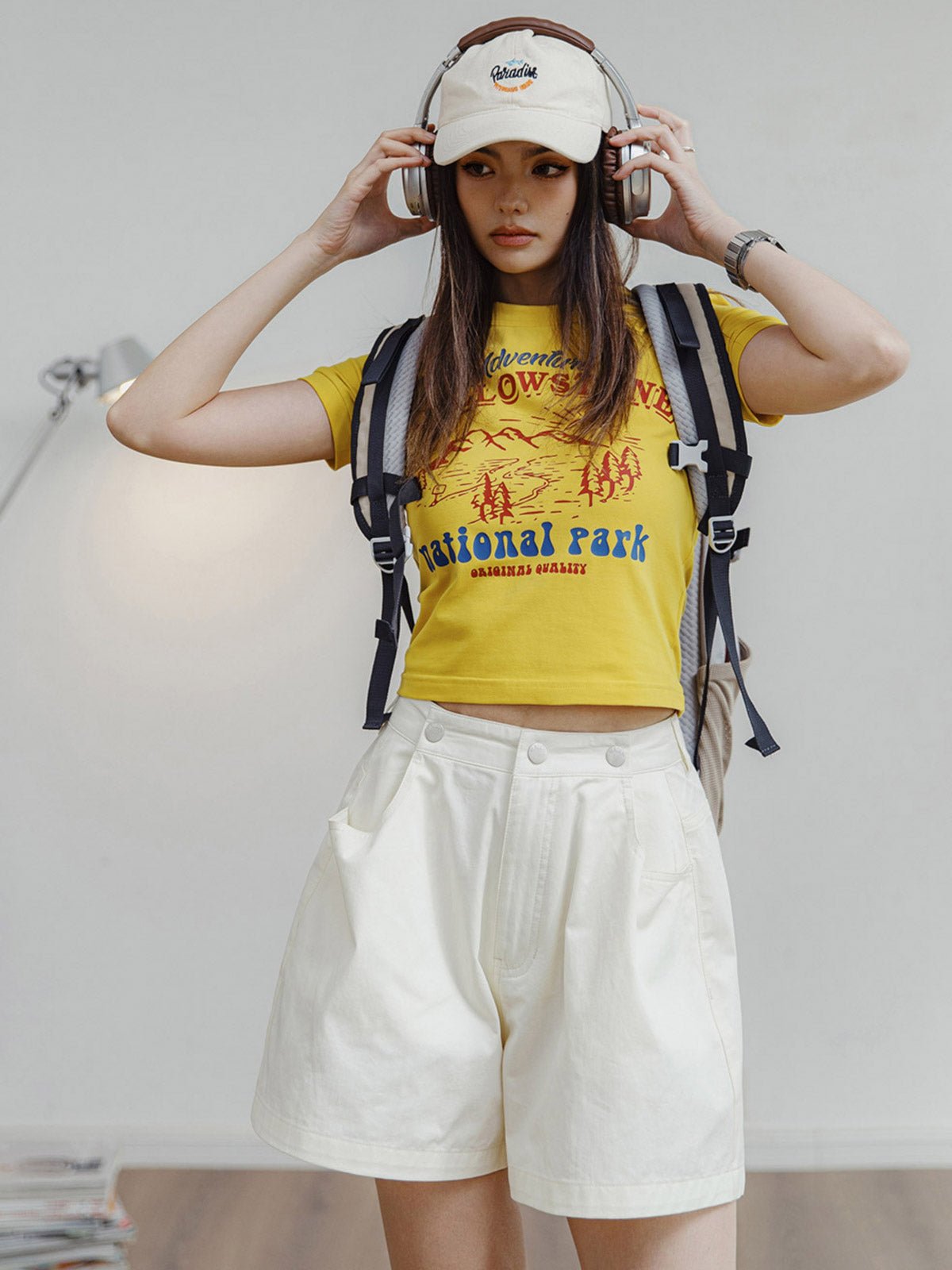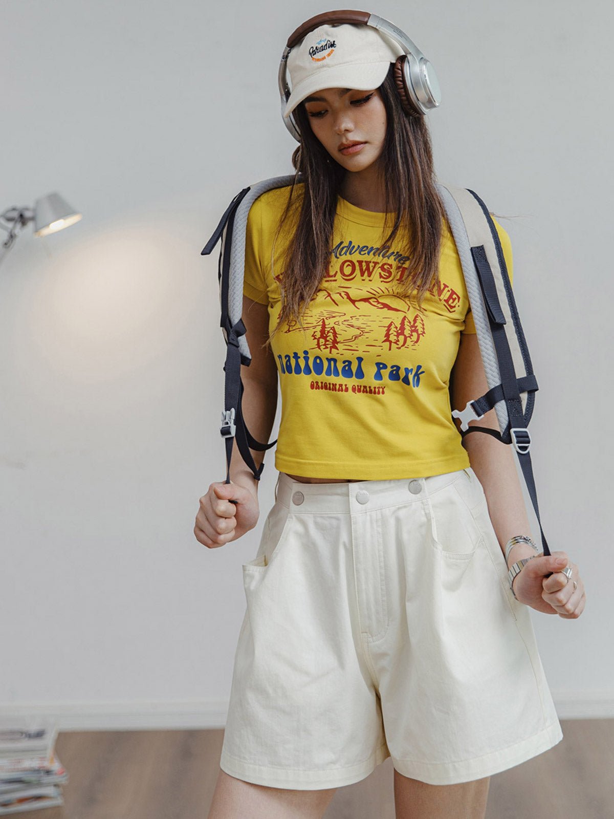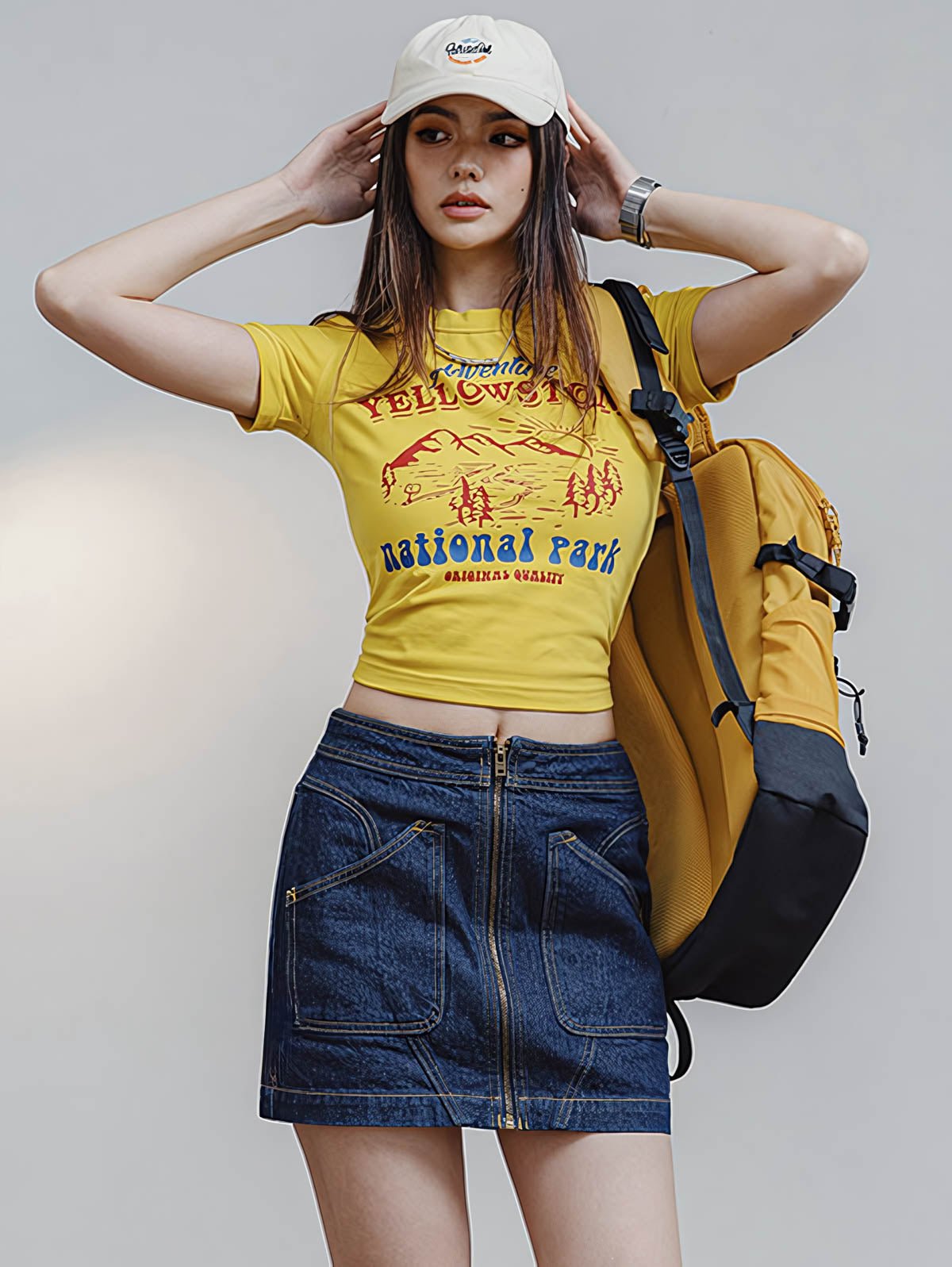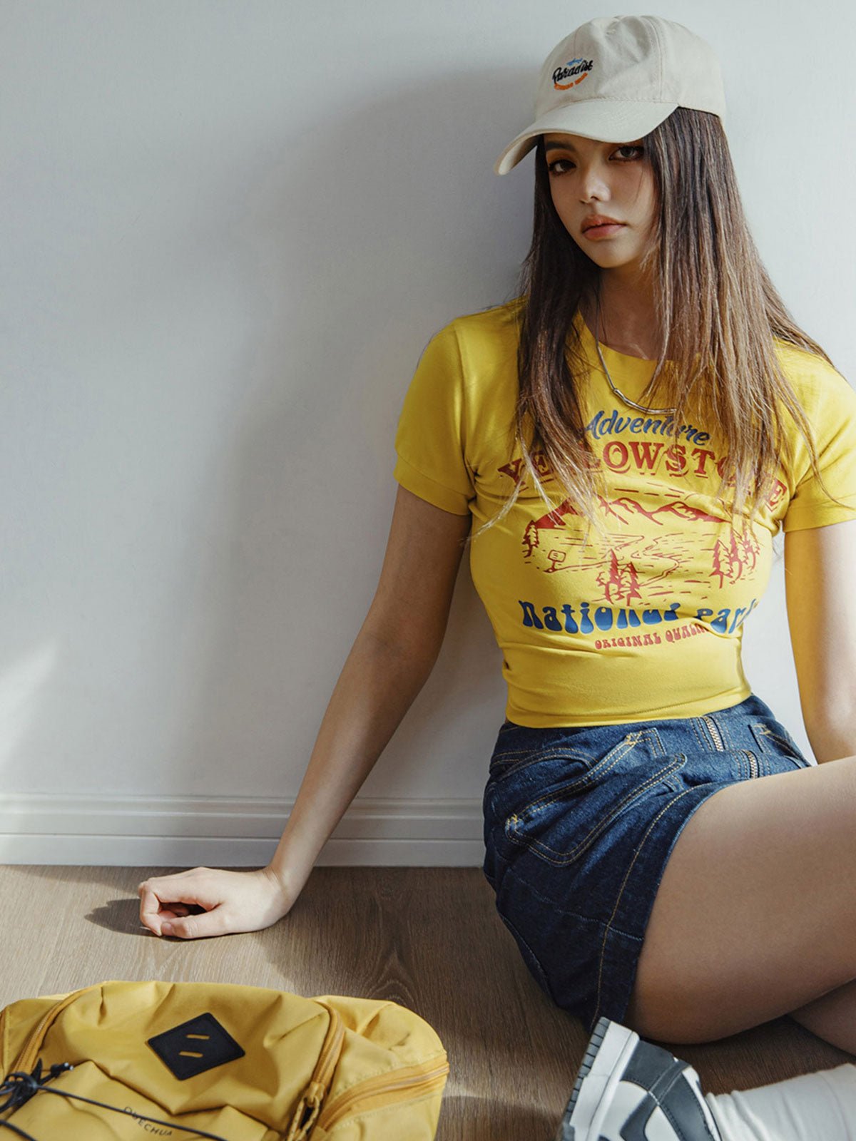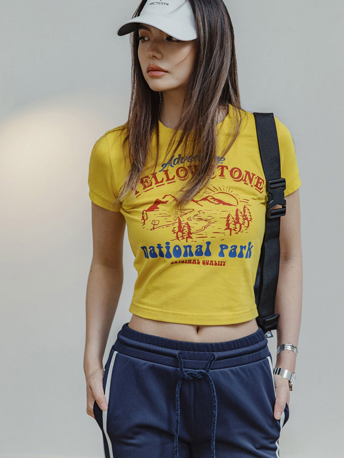 このイエローストーン公園プリントTシャツは、アメリカ西部ワイオミング州のイエローストーン公園をテーマにしています。鮮やかな黄色を基調に、クラシックな赤と青のカラーブロックプリントが施され、濃厚なヴィンテージ感を演出します。フィットしたシルエットはボディラインを引き立て、ややウエストが見える丈は脚長効果をもたらします。バックボタンのデザインが遊び心を添え、キャップやヘッドフォン、スポーツパンツやスカートとの相性も抜群です。おしゃれなストリートスタイルを簡単に完成させ、注目を集めること間違いなしです。