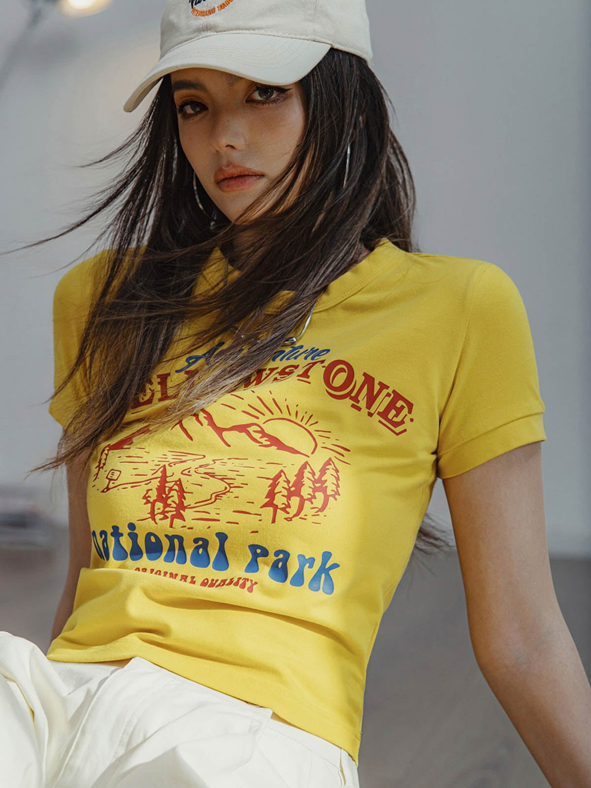 イエローストーン公園プリントのビビッドイエローTシャツ、ヴィンテージ感たっぷり。