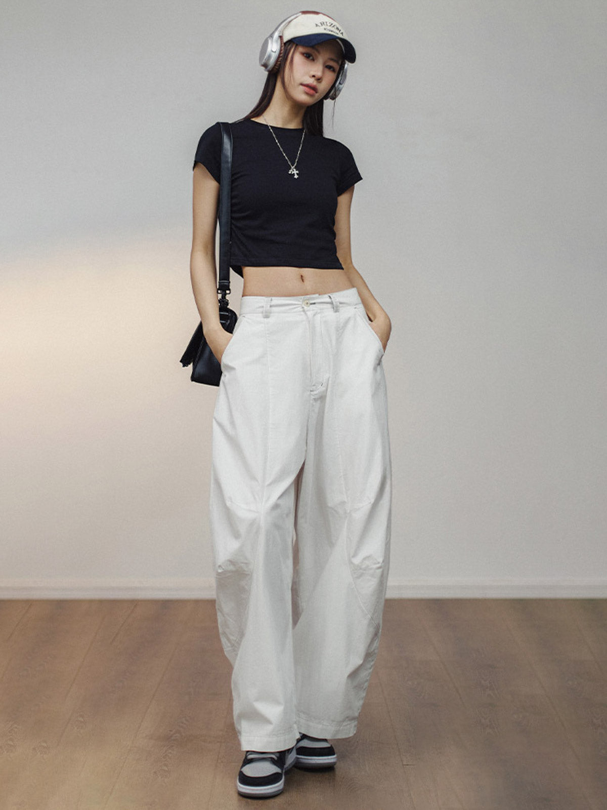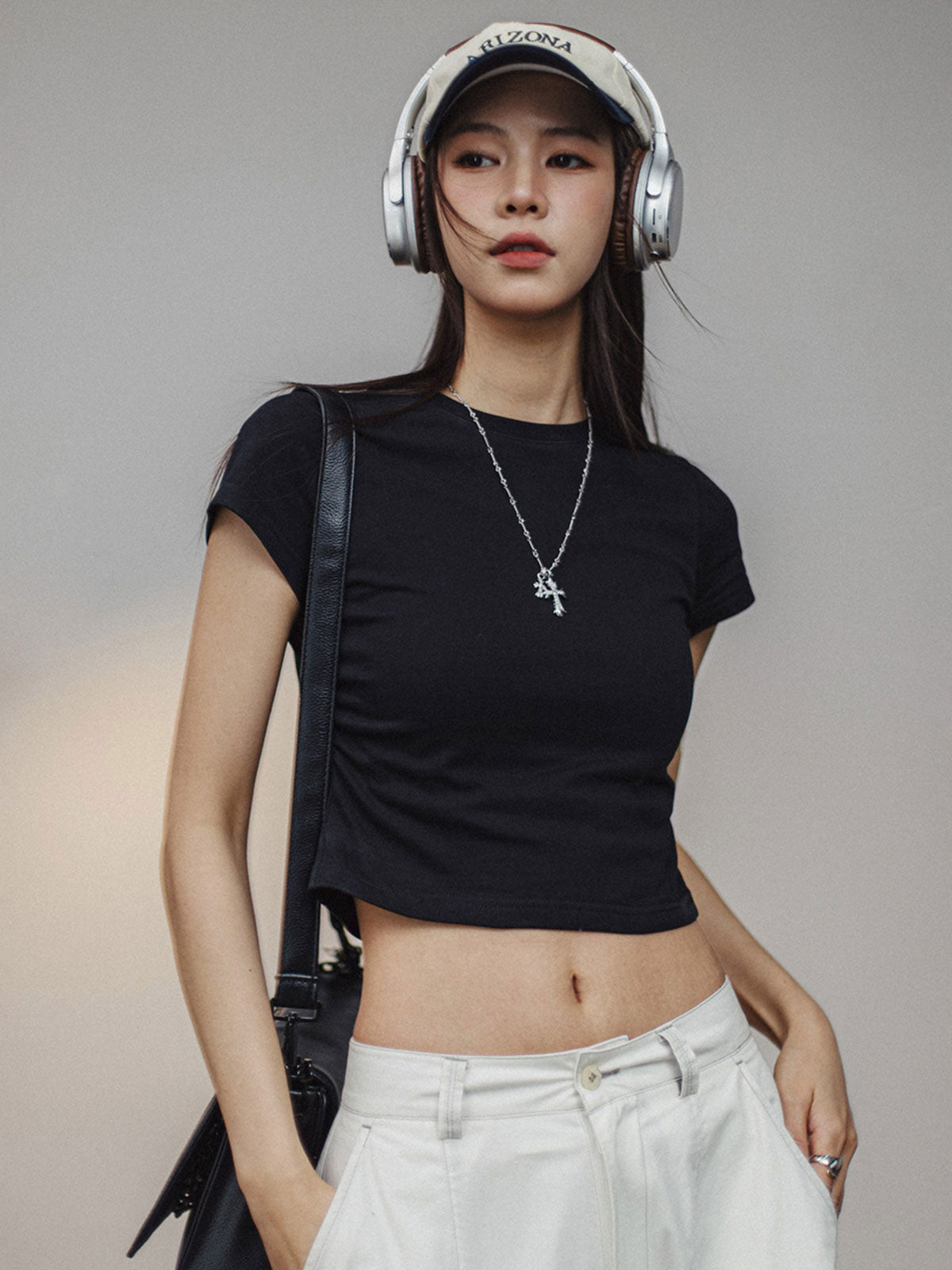 スリムフィットのウエストギャザーデザイン、日常使いに最適なスタイルアップTシャツ。