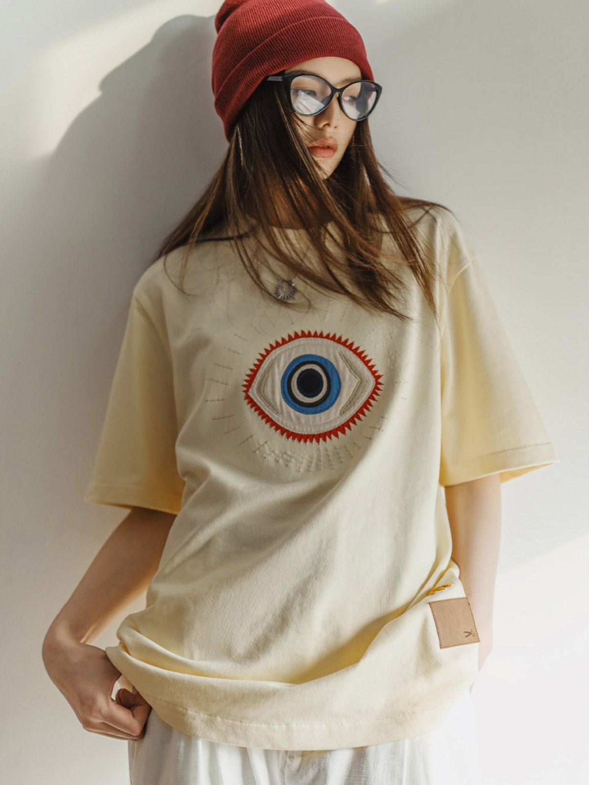 このTシャツは、古代エジプト神話の「ホルスの目」をデザインのインスピレーションに取り入れています。9200針の七色刺繍技法を用いており、色が豊かでディテールが精巧に仕上げられています。クラシックなラウンドネックデザインとルーズフィットのシルエットが見事に融合し、300g/m²の100%コットン が快適で通気性の良い着心地を保証します。ヴィンテージカラーの刺繍は、全体の立体感を高めるだけでなく、幸福を守り悪運を退ける意味も込められています。カジュアルパンツやオーバーオールと合わせることで、夏の街歩きや通勤、オフィスでの着用にぴったりな濃厚なヴィンテージ感を演出します。