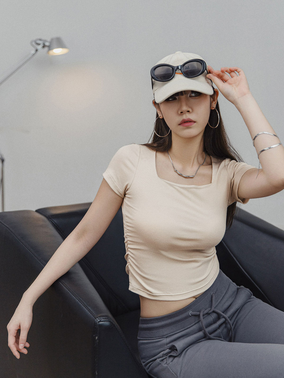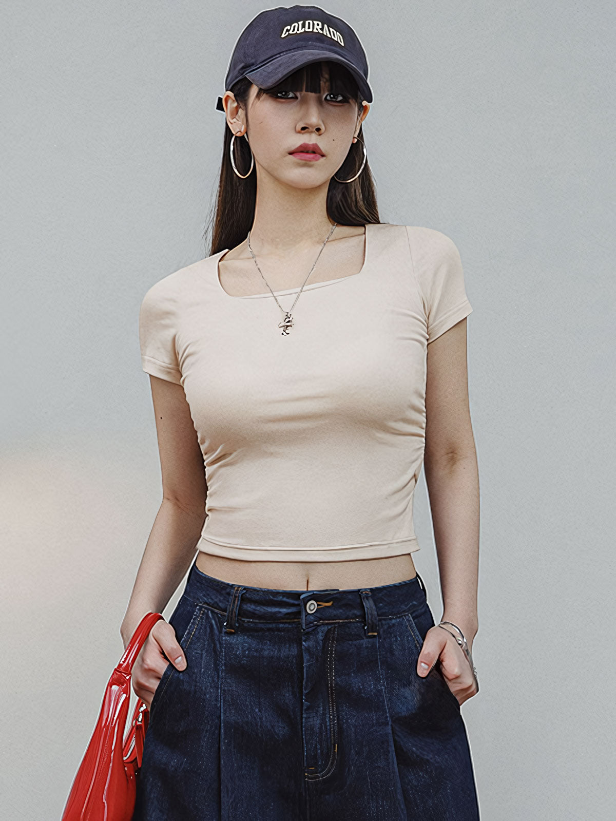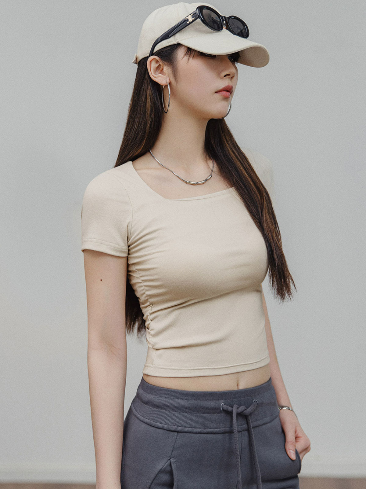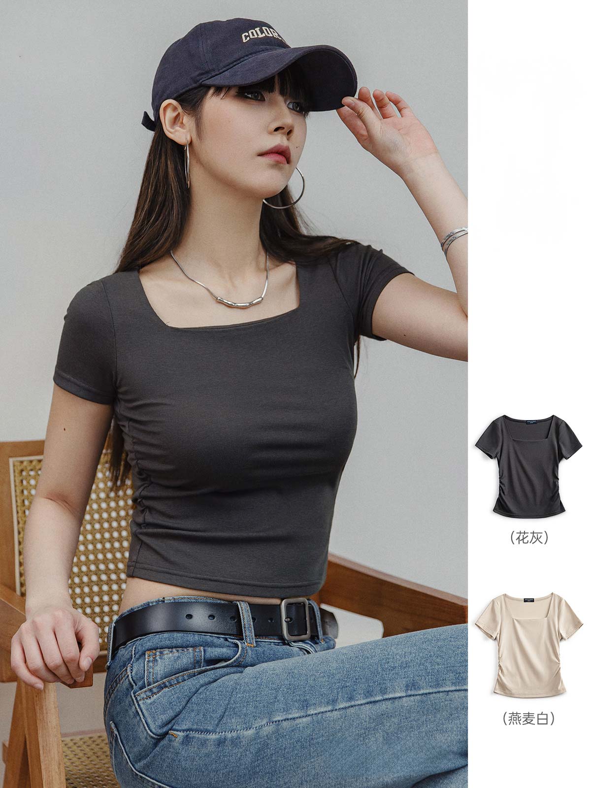 このTシャツはフレンチスタイルの大きなスクエアネックデザインで、肩のラインがしっかりしたカットを採用しています。着用すると非常にスリムに見え、鎖骨のラインを適度に露出し、瞬時に魅力をアップします。両側のシャーリングデザインで衣服の長さを調整でき、コーディネートの多様性を増やします。シンプルな無地のスリムフィットスタイルで、215g/m²のストレッチニット素材を使用し、快適に着用できます。ヘザーグレーとオートミールホワイトはデニムやスカートと簡単に組み合わせられ、旅行や日常通勤でもスタイリッシュに着こなせます。
