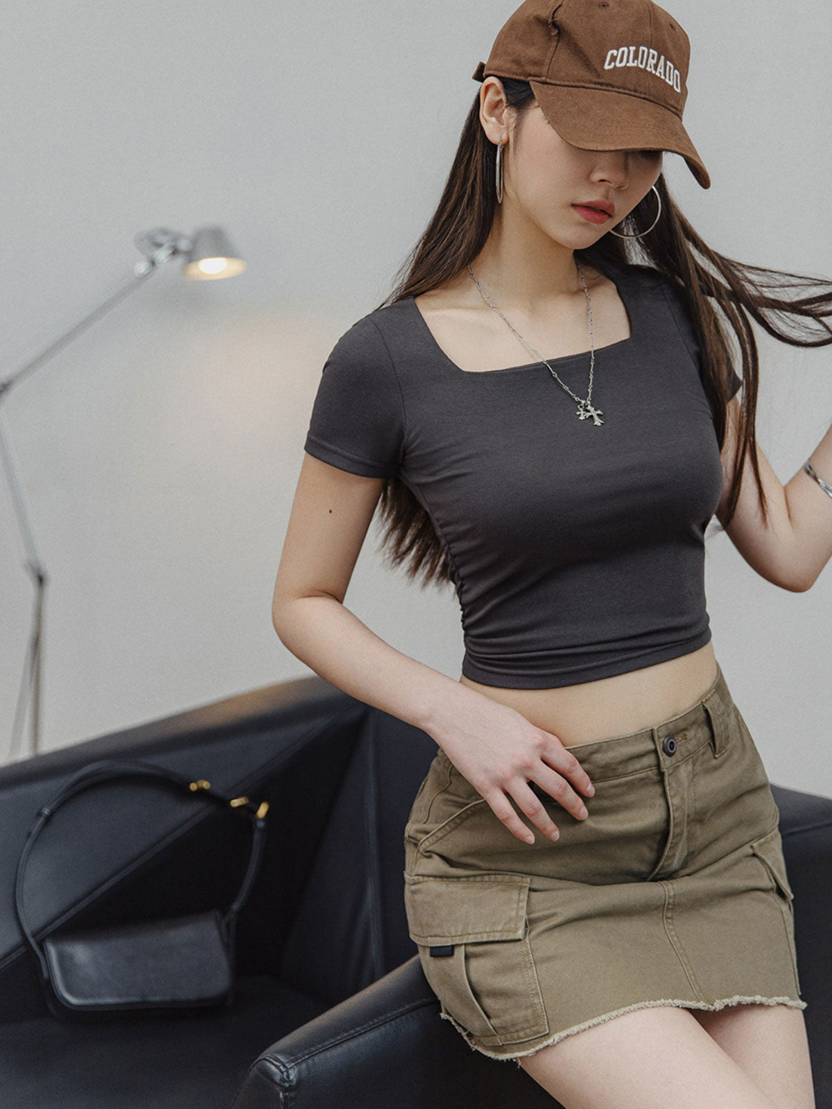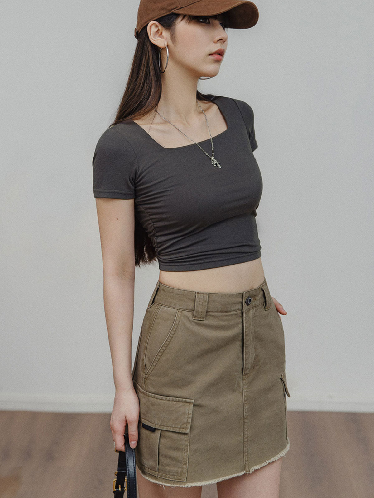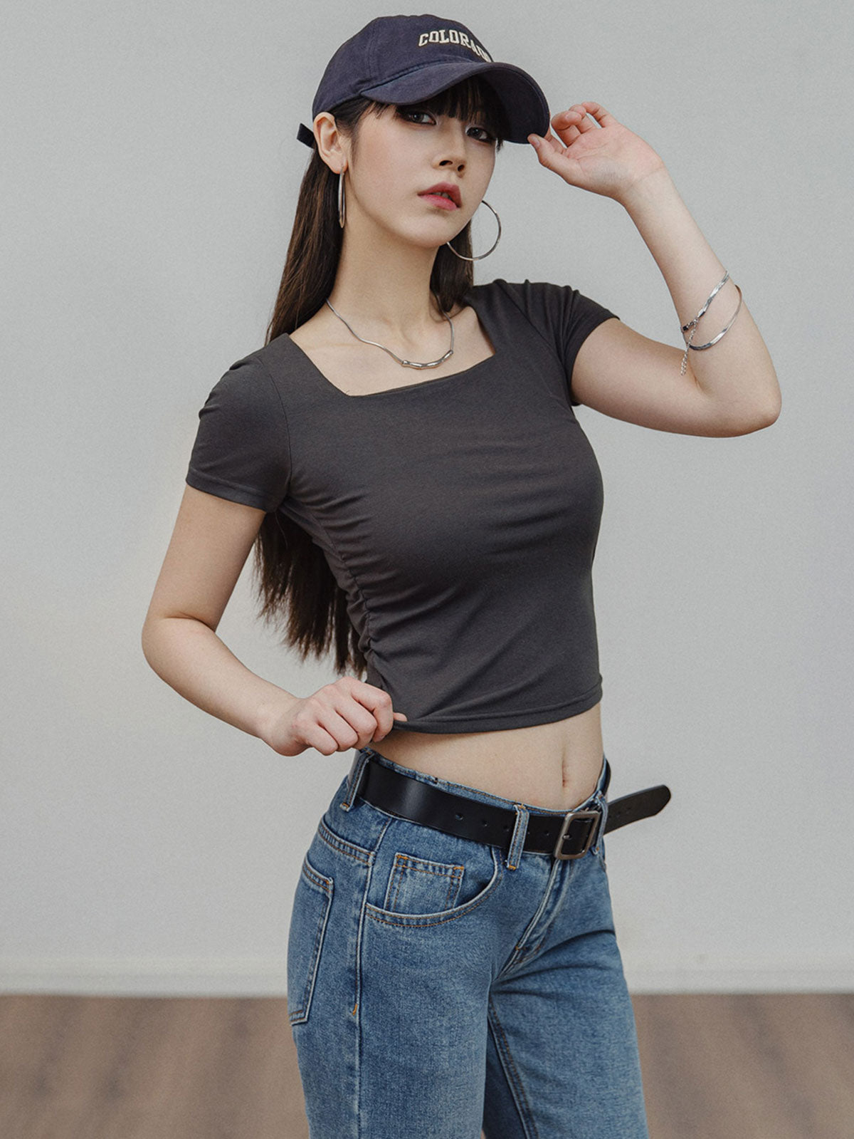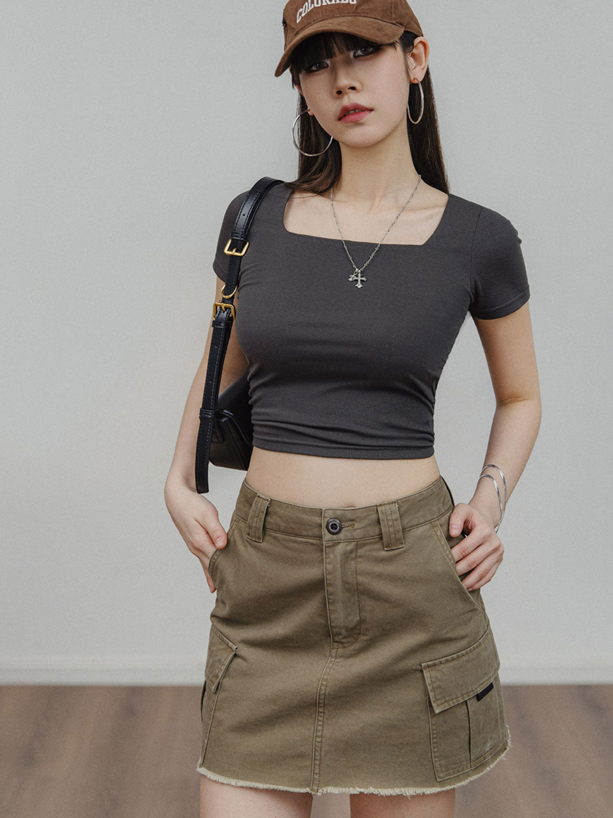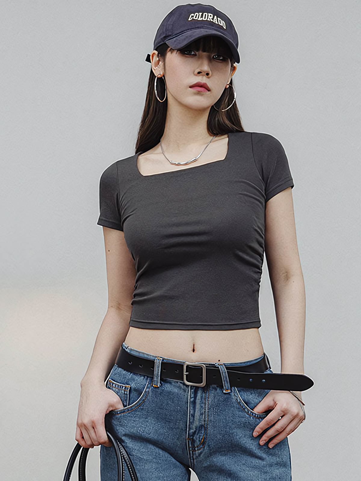 ギャルのデイリーアイテム!スタイリッシュなスクエアネック ショルダー TEE。