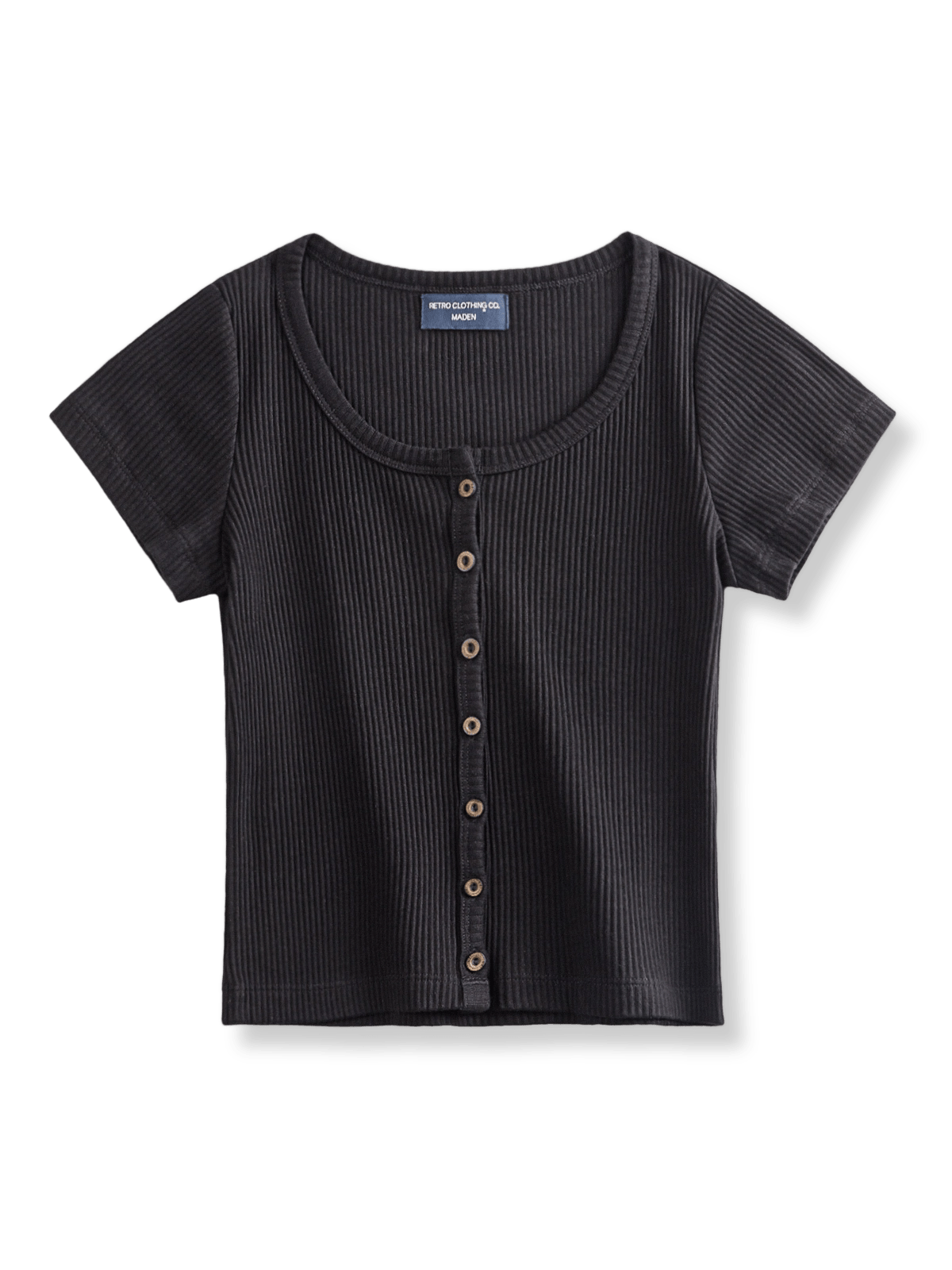 このクロップドニットトップスは、97.5%のコットンと2.5%のスパンデックス混紡素材を採用し、肌触りが柔らかく伸縮性に優れています。クラシックなクルーネックと洗練されたボタンディテールがエレガンスと現代的なスタイルを加え、タイトなフィット感が体のラインを美しく見せます。ショートのクロップドデザインは、若々しさと活動性を強調し、単体での着用やインナーとしても最適です。ハイウエストのジーンズやスカートとの相性が良く、夏のスタイリングに欠かせないアイテムです。