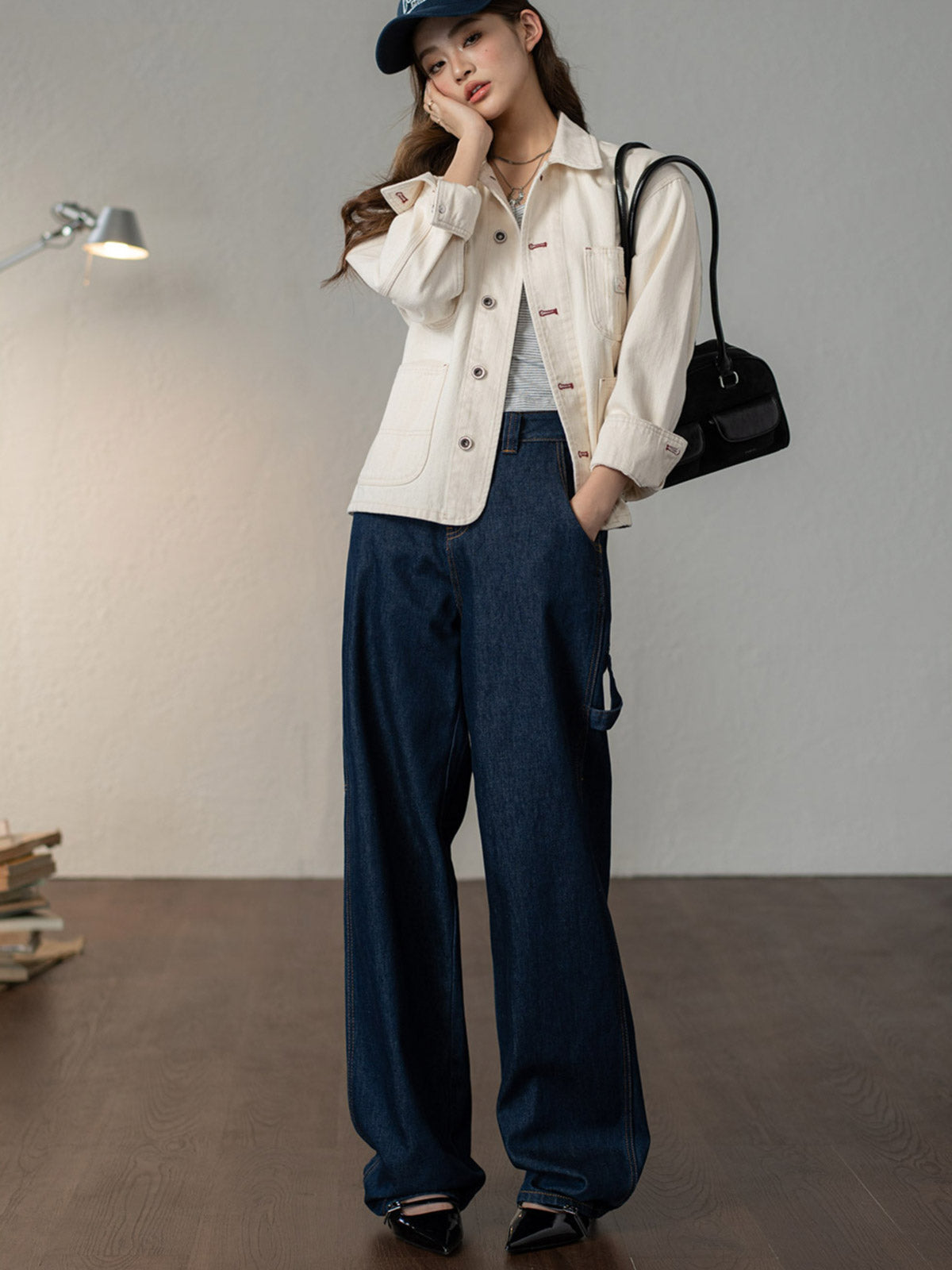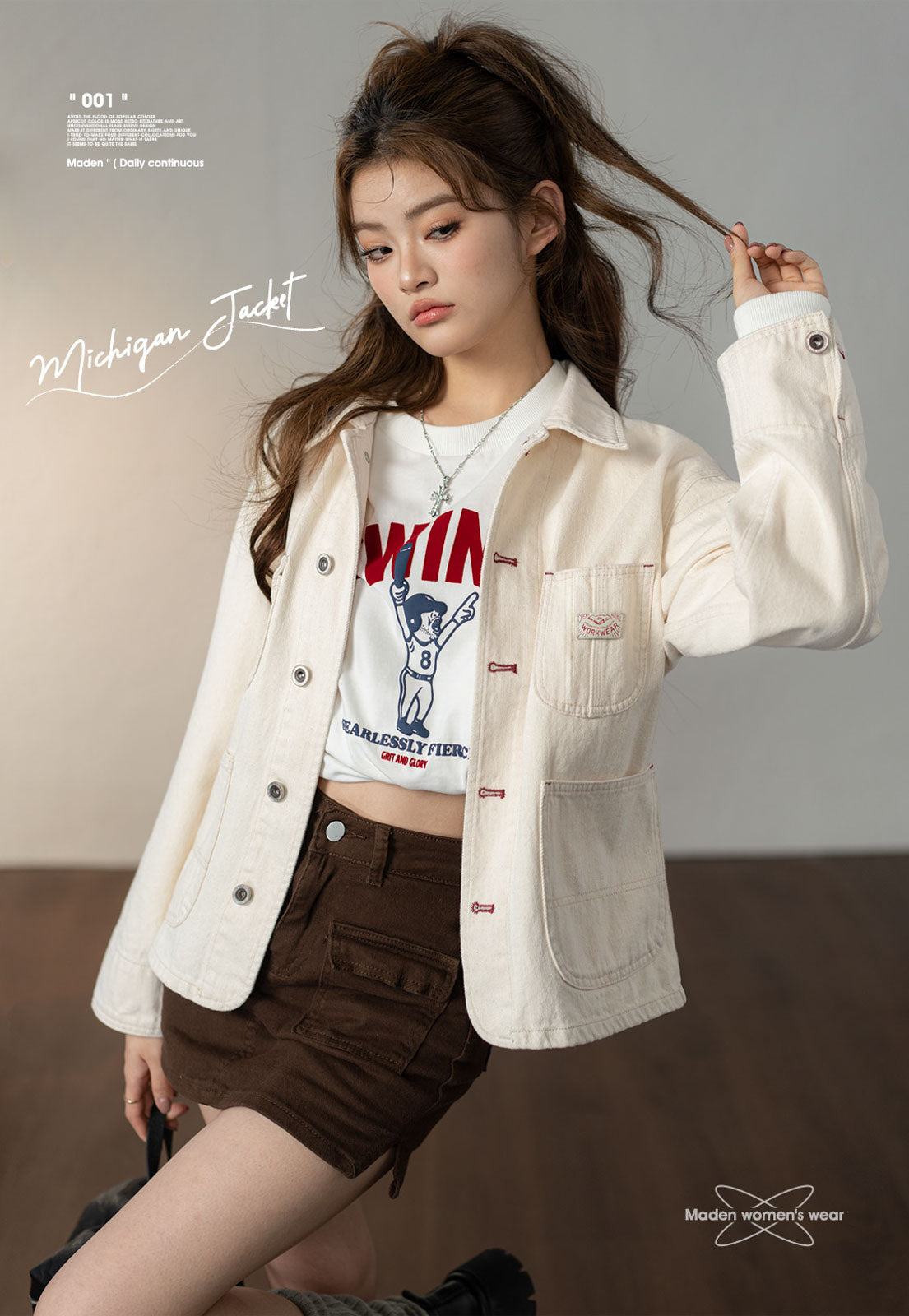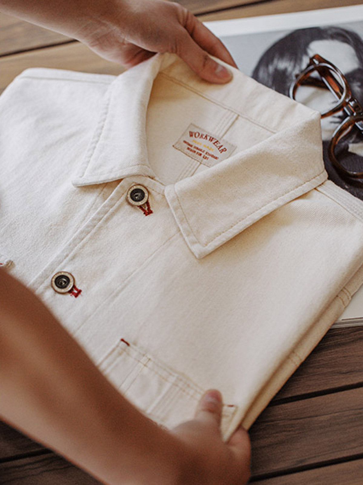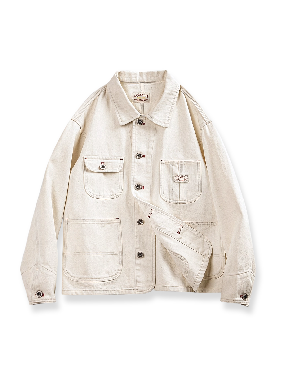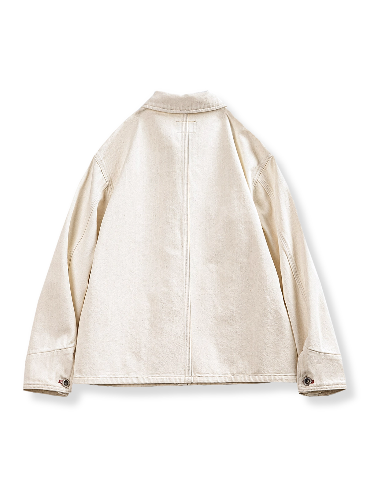 ミルキーホワイトの色合いとレトロなディテールが特徴のミシガンデニムジャケットは、ヴィンテージスタイルを現代的に表現します。