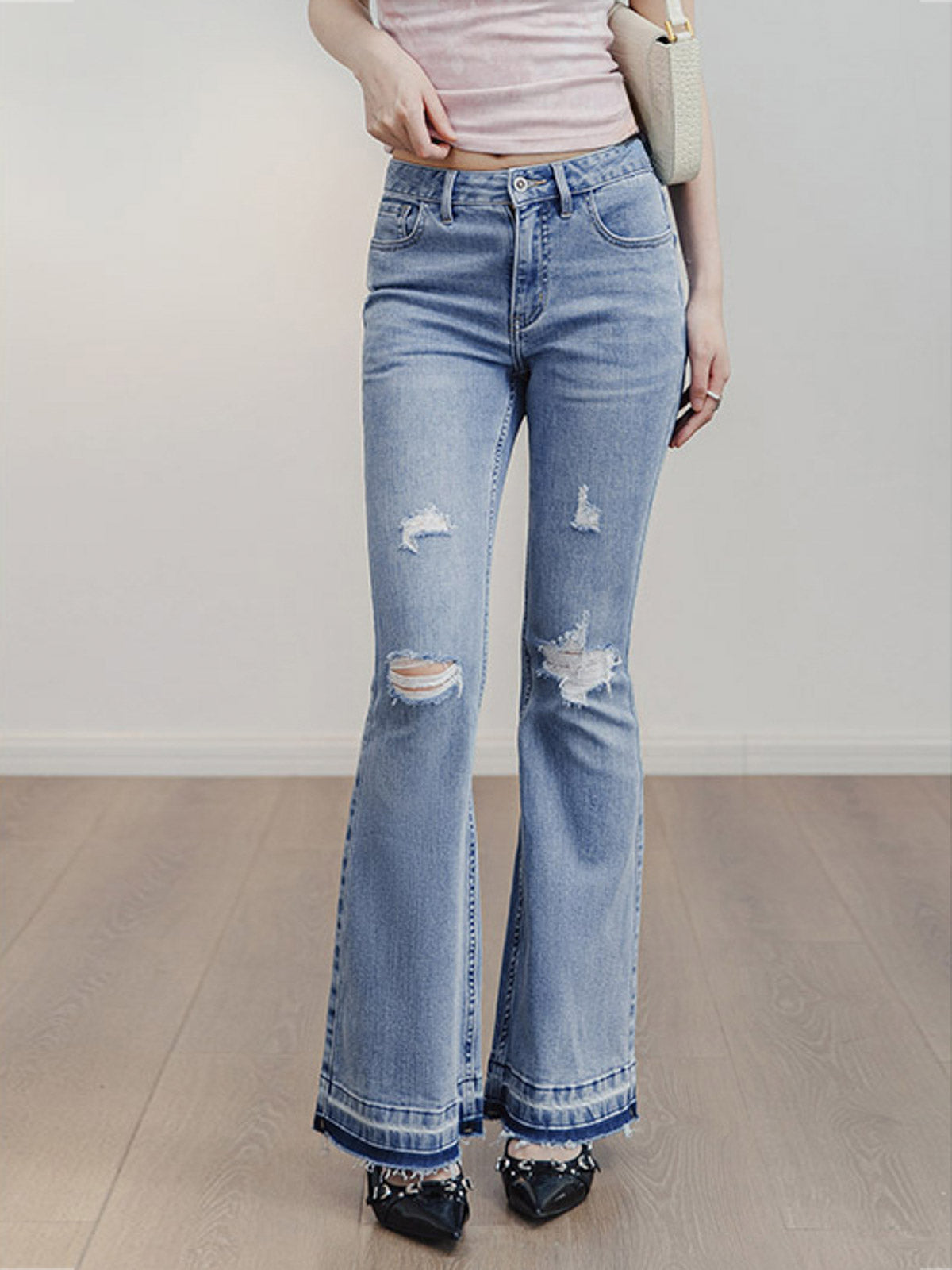破れとフリンジが施されたフレアデニムパンツで、90年代アメリカンストリートのレトロな魅力を完璧に再現します。