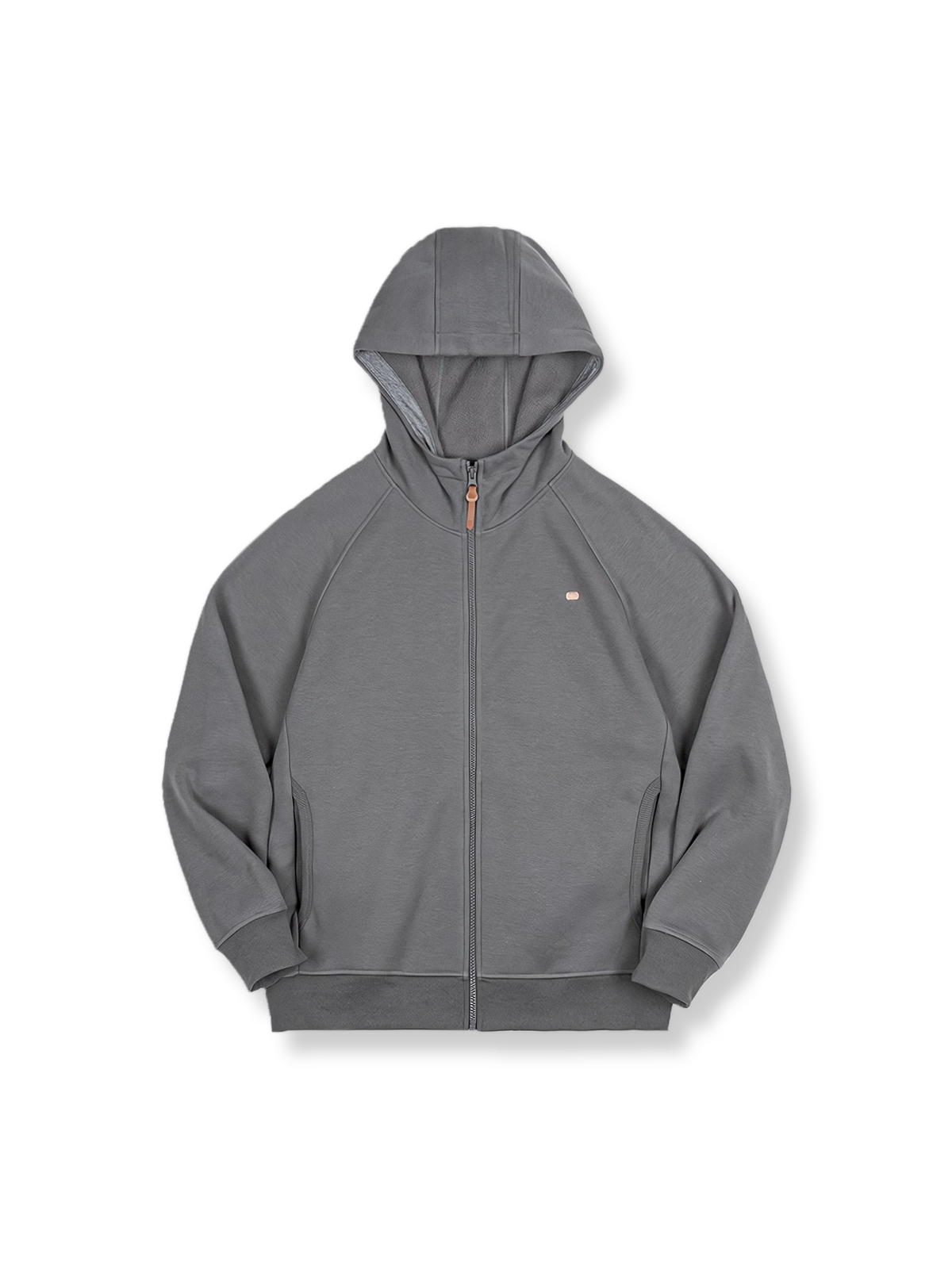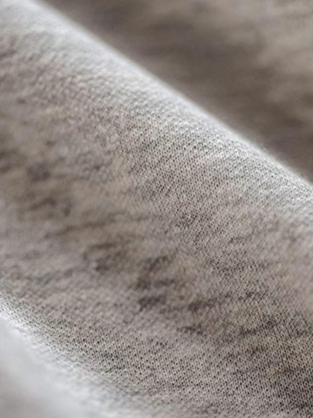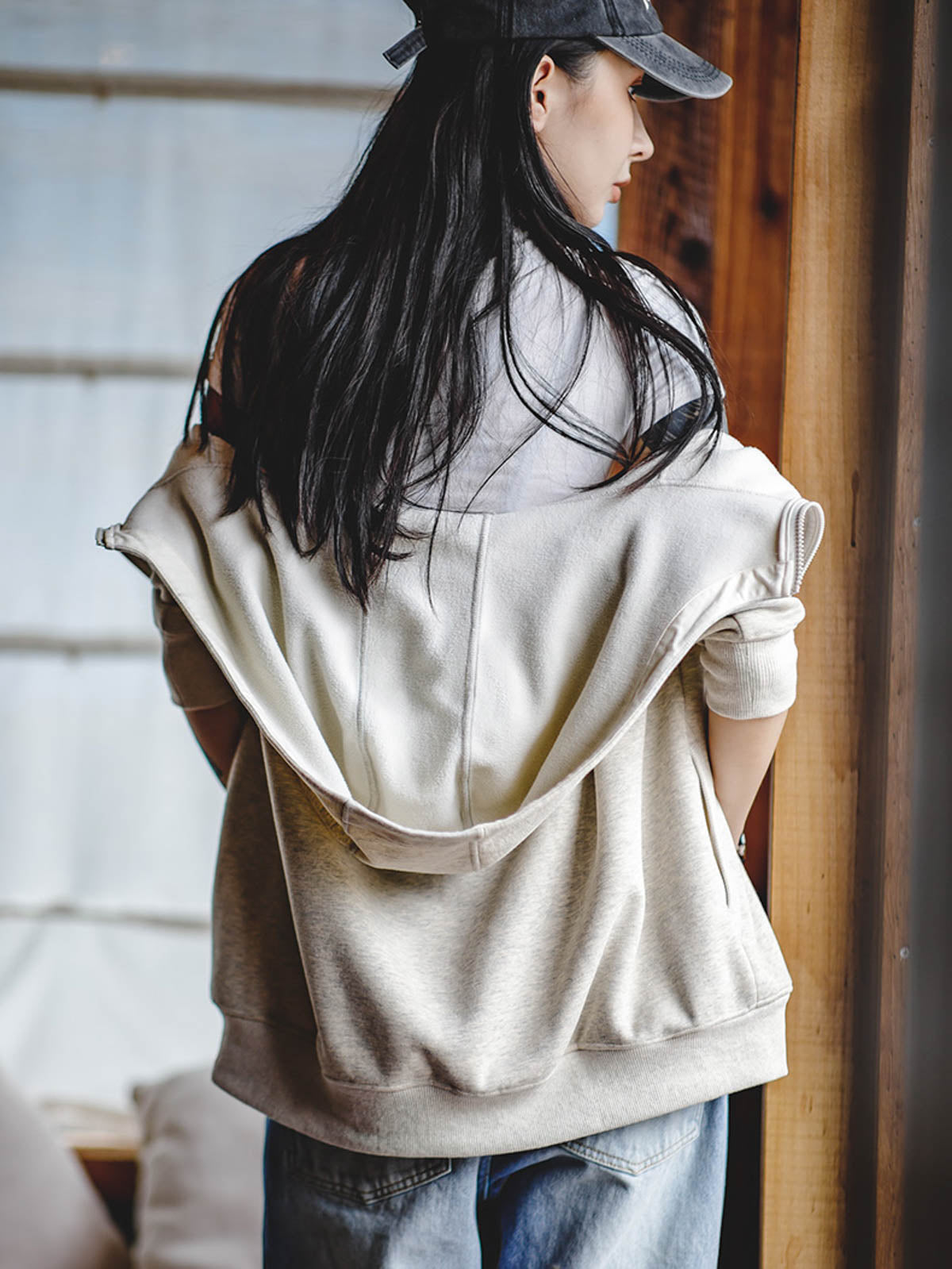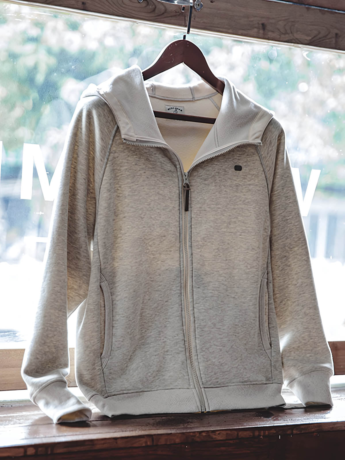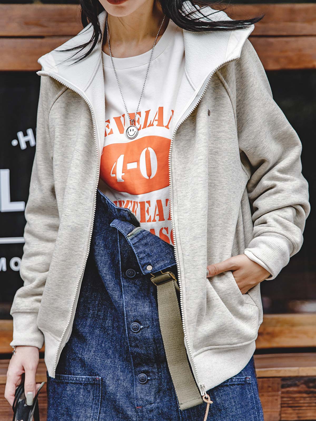 このフード付きスウェットシャツは、330gのヘビーウェイトコットンライクファブリックを使用しており、外側は独特のスノーフレークグレーのパターン、内側には柔らかいフリースを採用しています。これにより、両面から快適さと暖かさを保証します。シンプルなボクシー型と万人向けのデザインで、日常使いにもカジュアルファッションにも対応します。ジップアップは首元まで可能で、スタンドカラーとしても機能し、フードとラグランスリーブがリラックス感を演出します。左胸にはヴィンテージ風のブランドタグ、ジッパーには植物タンニングレザーのプルがあり、レトロなディテールが魅力を加えます。ポリエステル65.5%とコットン34.5%のブレンドは、耐久性と快適さを提供します。