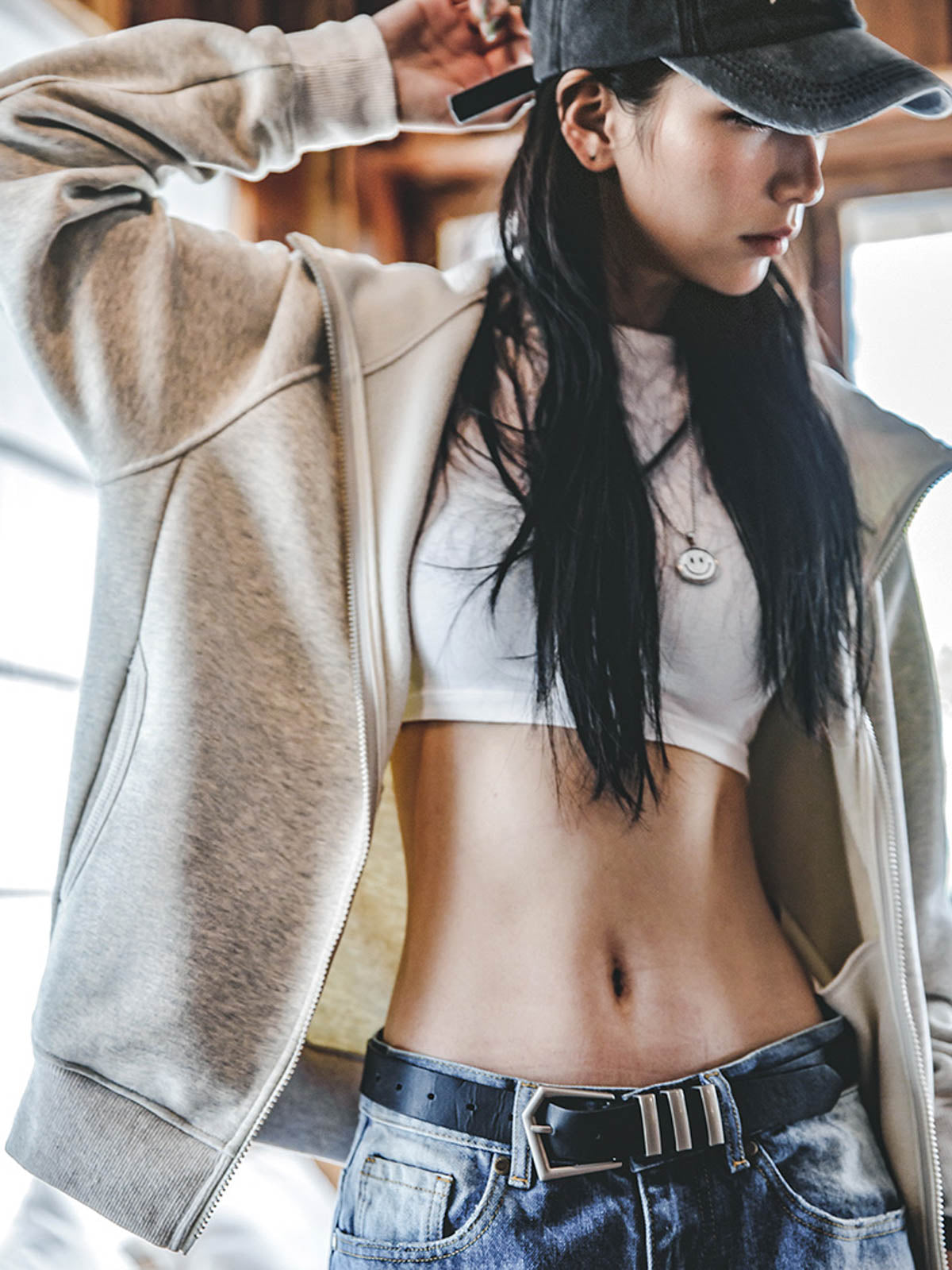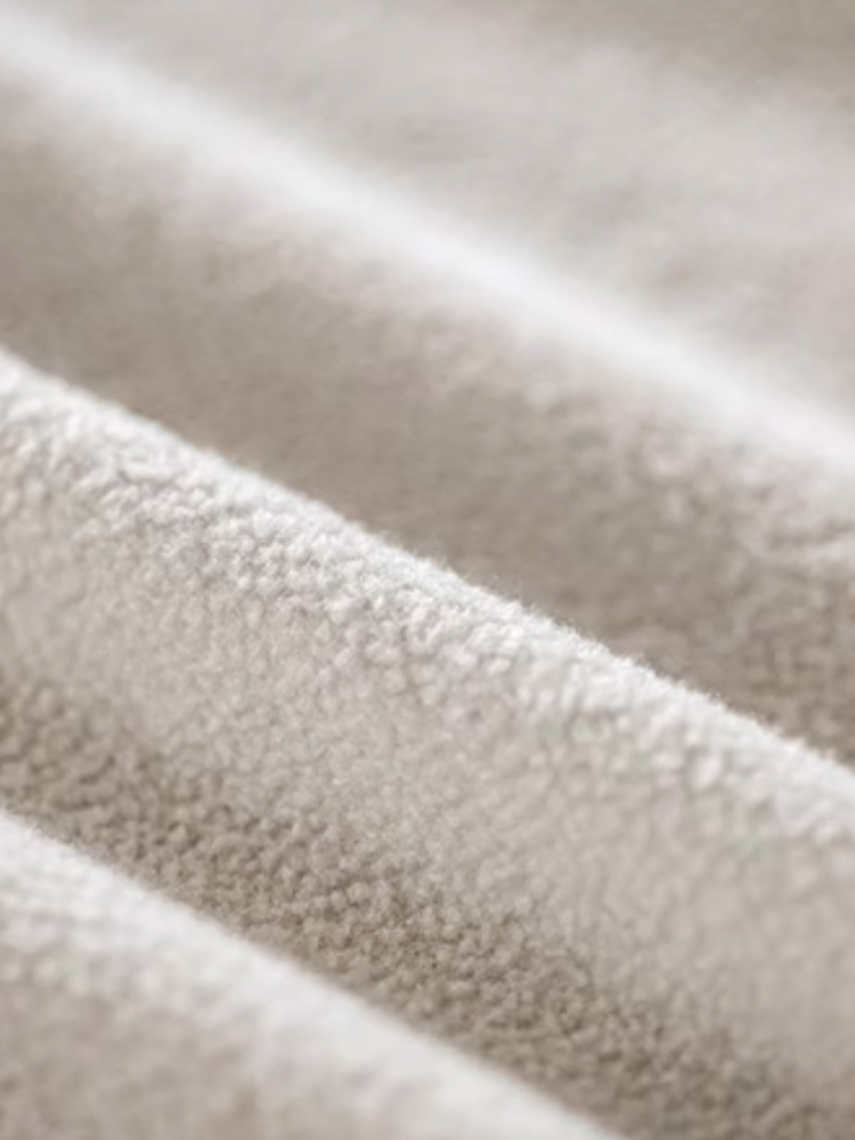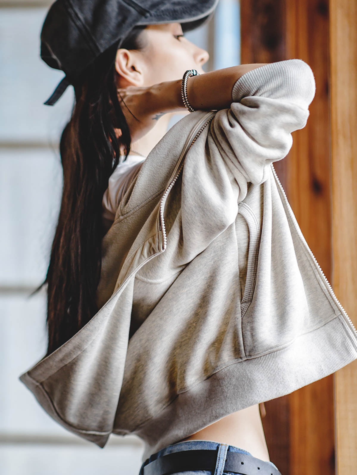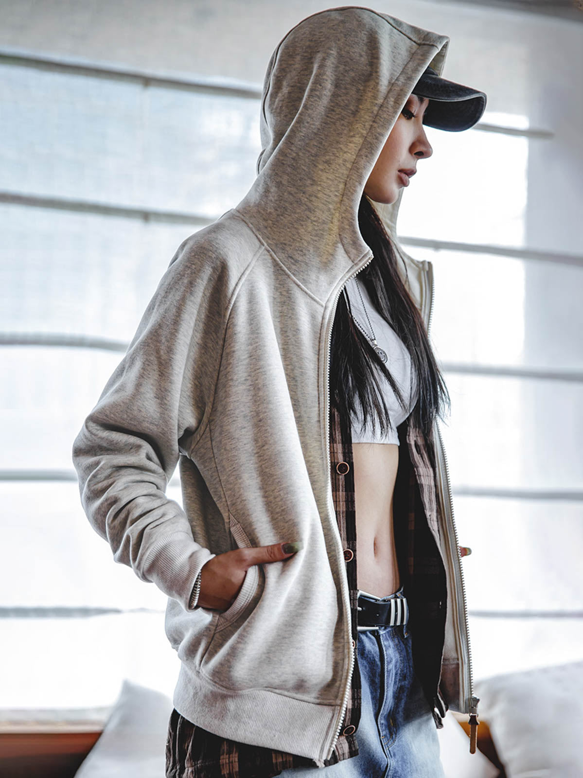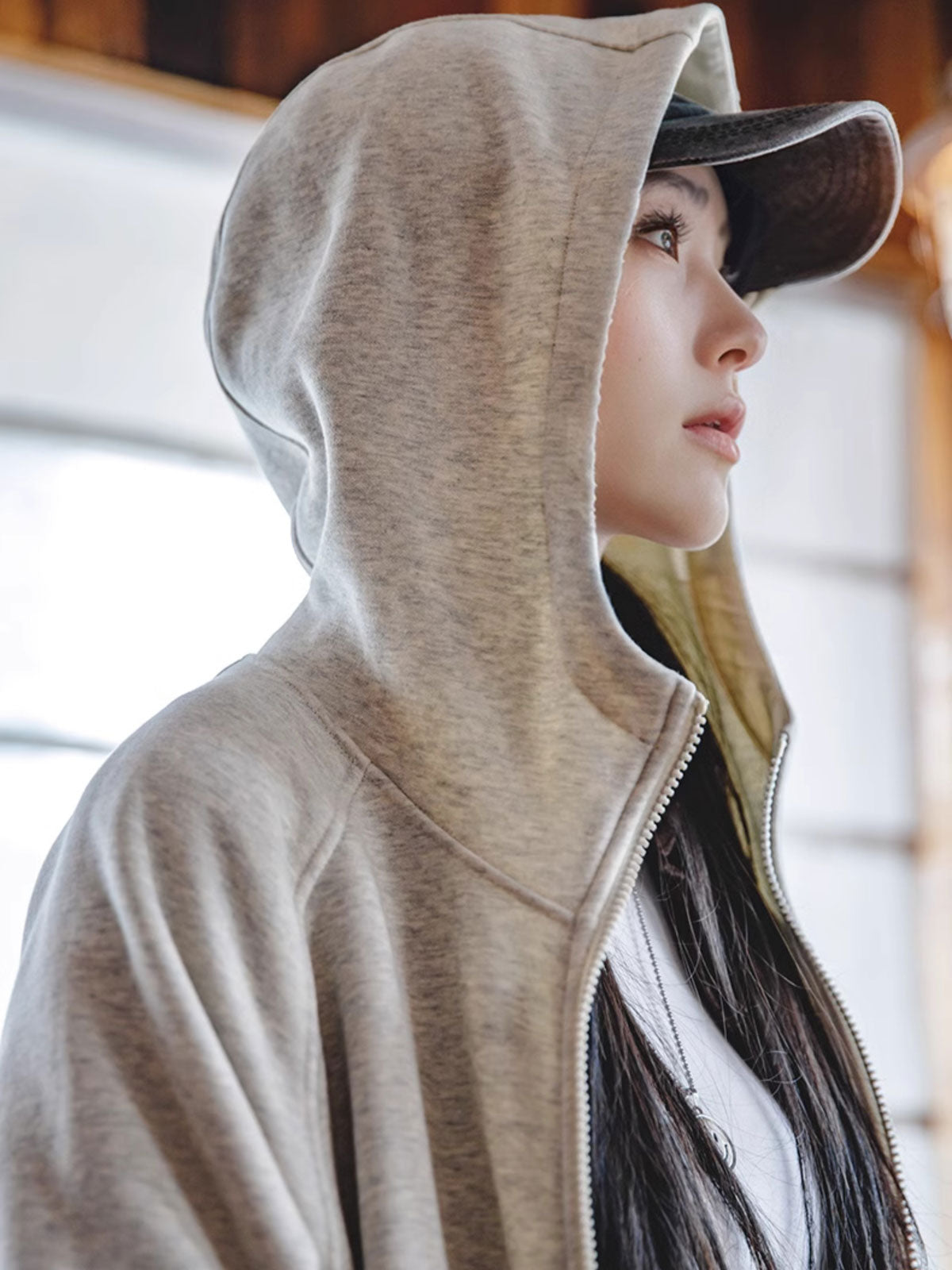 このフード付きスウェットシャツは、330gのヘビーウェイトコットンライクファブリックを使用しており、外側は独特のスノーフレークグレーのパターン、内側には柔らかいフリースを採用しています。これにより、両面から快適さと暖かさを保証します。シンプルなボクシー型と万人向けのデザインで、日常使いにもカジュアルファッションにも対応します。ジップアップは首元まで可能で、スタンドカラーとしても機能し、フードとラグランスリーブがリラックス感を演出します。左胸にはヴィンテージ風のブランドタグ、ジッパーには植物タンニングレザーのプルがあり、レトロなディテールが魅力を加えます。ポリエステル65.5%とコットン34.5%のブレンドは、耐久性と快適さを提供します。