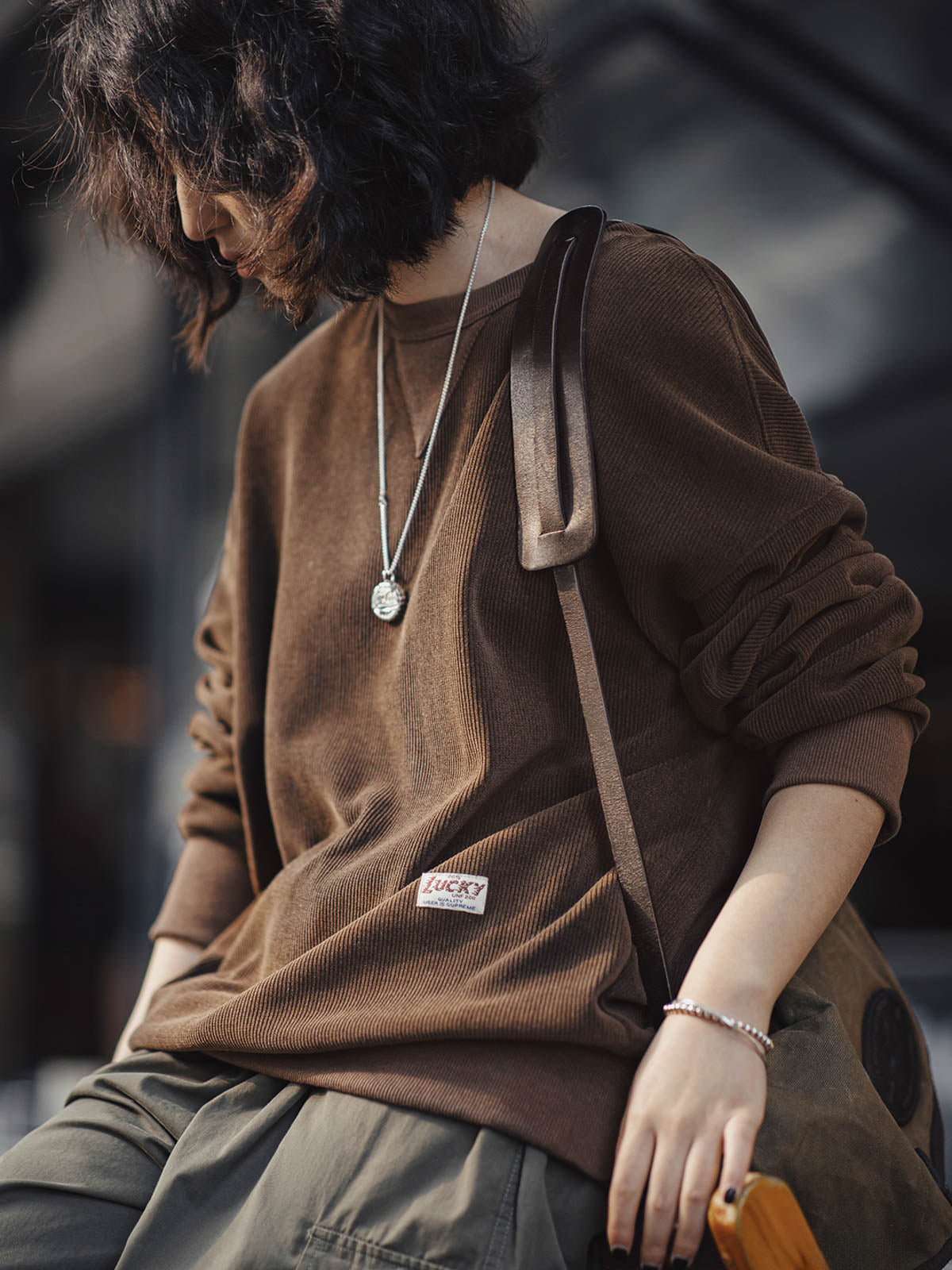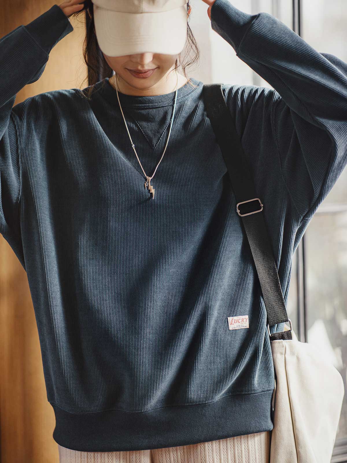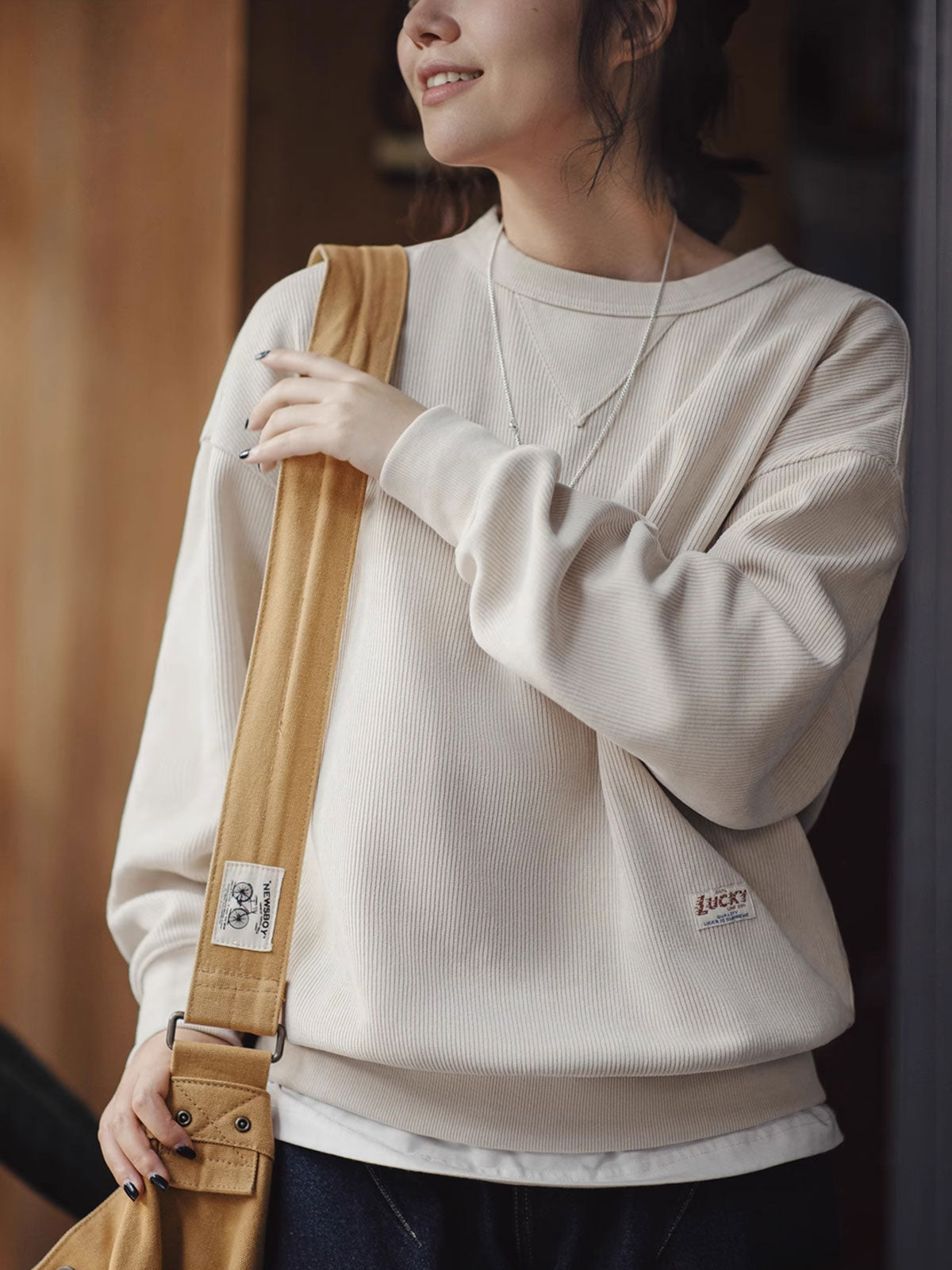 このアメリカンヴィンテージシェニールスウェットは、初級から上級まで幅広く対応するクラシックなベーシックアイテムです。頻繁に着用される特徴を持ち、ワードローブの必需品として重宝されます。象徴的な三角形のステッチデザインとアメリカンスタイルのゆったりとしたシルエットが特徴で、400g/m²の高密度シェニール素材は、豊かなフリース質感を提供し、立体的なリブ構造が視覚的な深みを増します。柔らかくしっかりした質感で、低彩度のダークネイビー、アイボリー、コーヒーカラーの3色展開で、秋冬のさまざまなシーンに自然に溶け込みます。ヴィンテージ感のあるシェニール素材は、ピリングしにくく、しわになりにくい特性を持ち、背面のヴィンテージ風ボタンと「LUCKY」織りネームが独自のヴィンテージ感をさらに引き立てます。