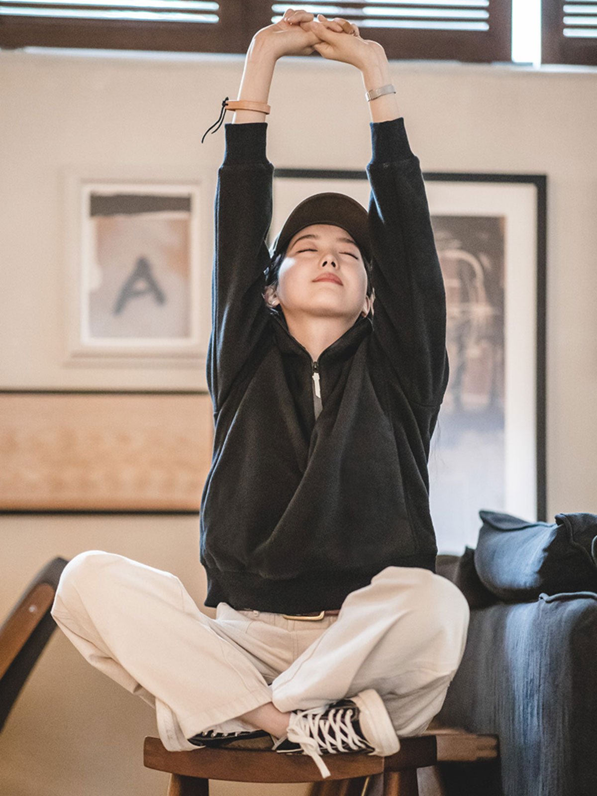 フリース裏地のヘビーフーディーは秋冬シーズンに最適で、どんなスタイルにも合わせやすい。
