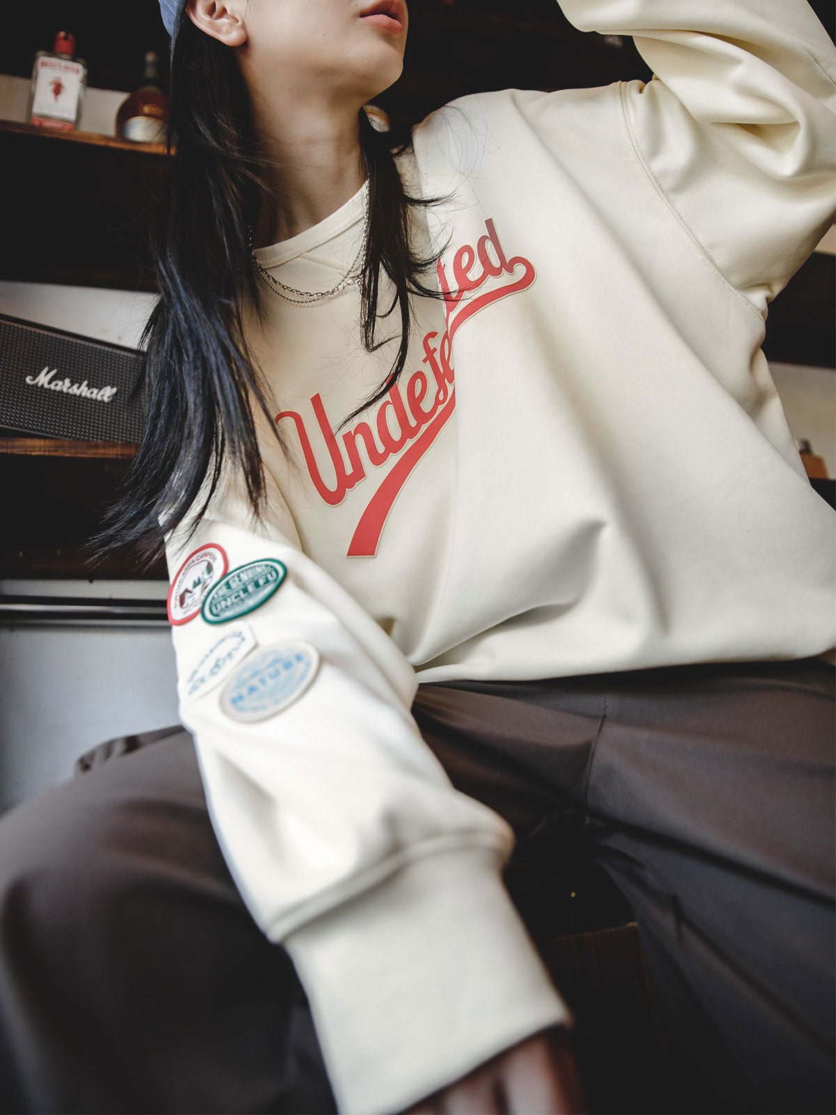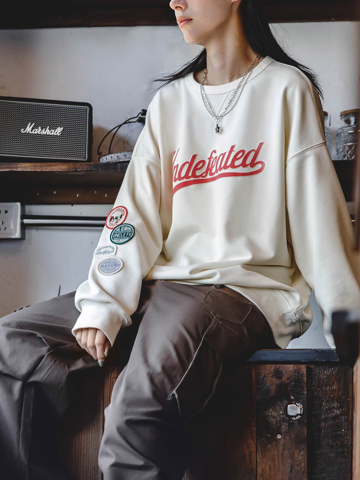 このスウェットシャツは、カレッジ風のレタリングデザインとカラーブロッキングのワッペンが特徴で、ヴィンテージなカレッジ風とアメリカンカジュアルスタイルを完璧に融合しています。少しゆったりとしたシルエットは、快適で自然なフィット感を提供し、簡単にコーディネートできます。クリームベージュの色合いは、誰にでも似合いやすく、忙しい日の外出にぴったりのアイテムです。デニムやカジュアルパンツと合わせて、スタイリッシュな雰囲気を簡単に演出できます。素材はポリエステルとコットンの混紡で、快適さと耐久性を兼ね備えた、日常のコーディネートに理想的な一枚です。