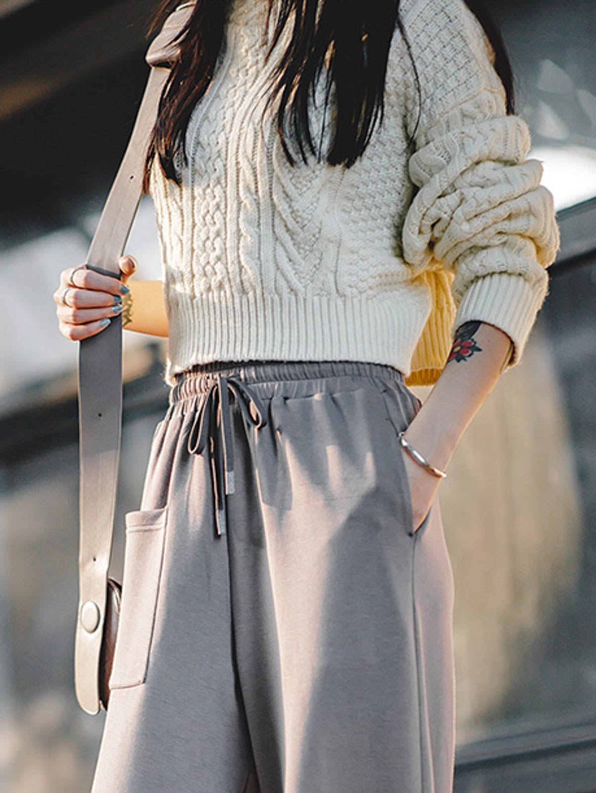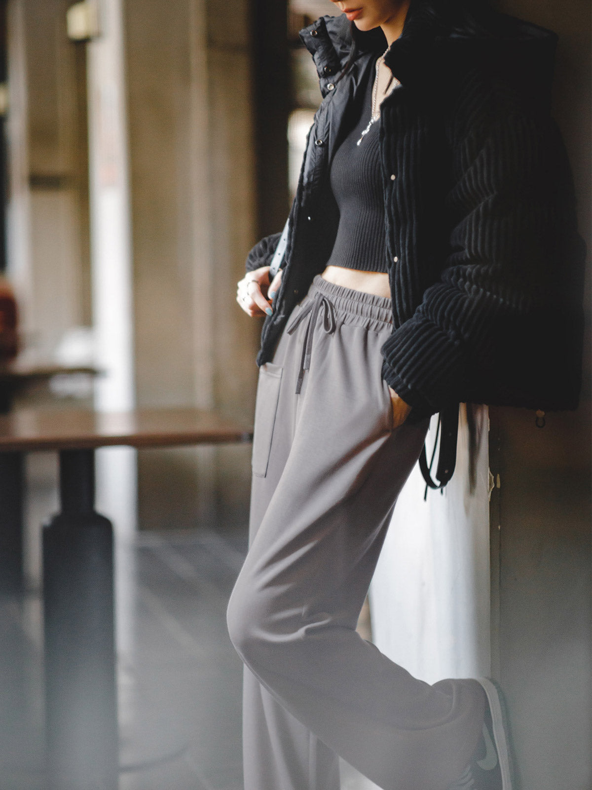 このダークグレーのハイウエストワイドレッグスウェットパンツは、混紡化繊素材を使用しており、シワになりにくく、肌触りも良好です。幅広のハイウエストストレートデザインで、スタイルアップが期待でき、調整可能なドローストリングが付いており、体型の変化にも対応できます。右側の斜めポケットの前端には四角い装飾ポケットがデザインされており、視覚的な立体感を増しています。210g/m²の化繊素材がパンツの形を保ち、ニット、セーター、ダウンジャケットなど、さまざまなトップスと合わせやすく、簡単にヴィンテージ風の雰囲気を演出できます。
