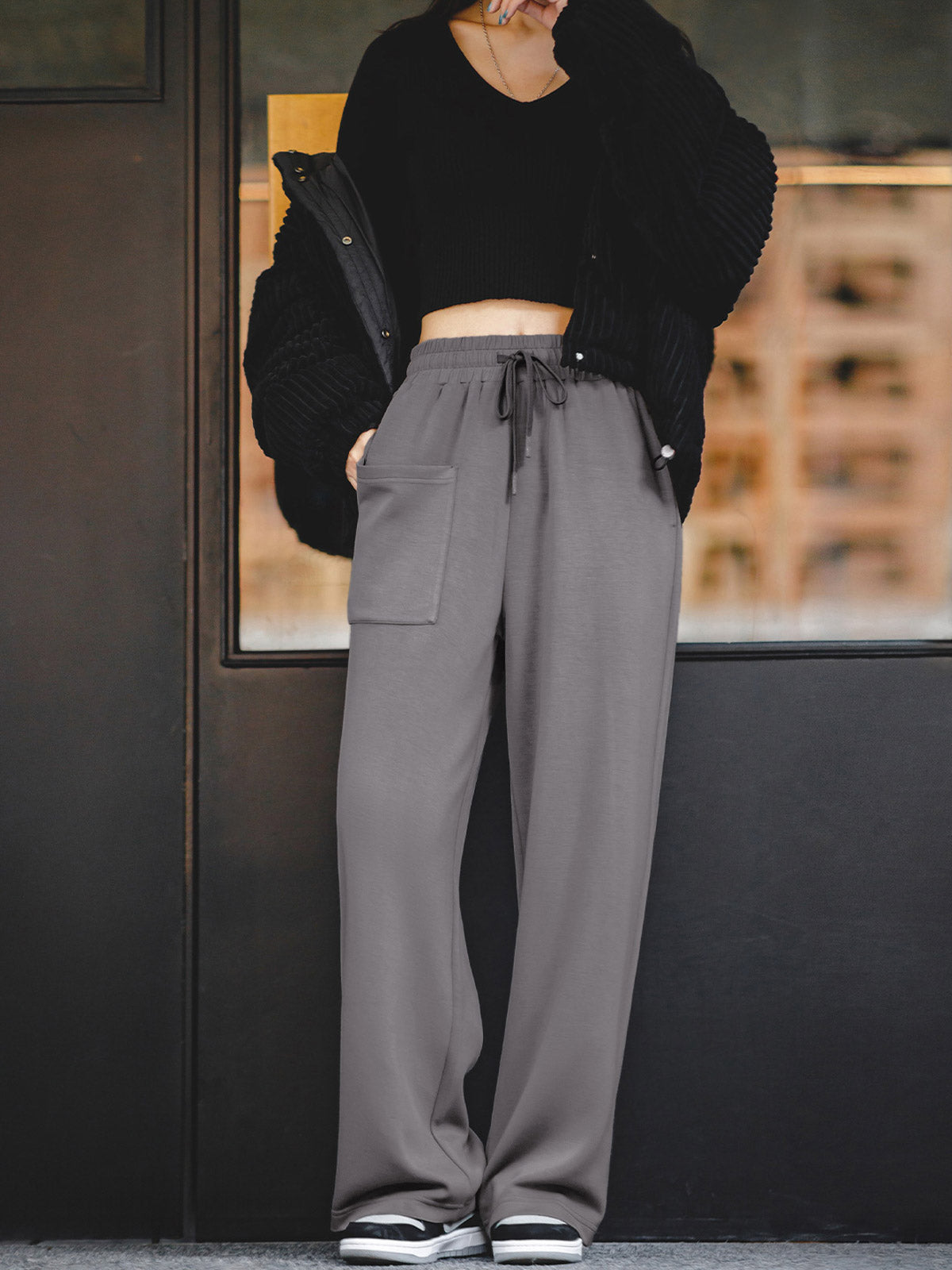 ダークグレーのハイウエストワイドレッグスウェットパンツ、快適でナチュラル、パンツが脚をより長く見せます。