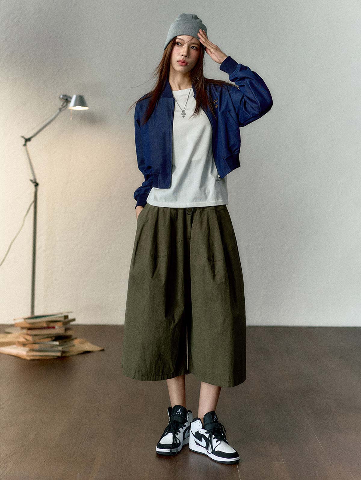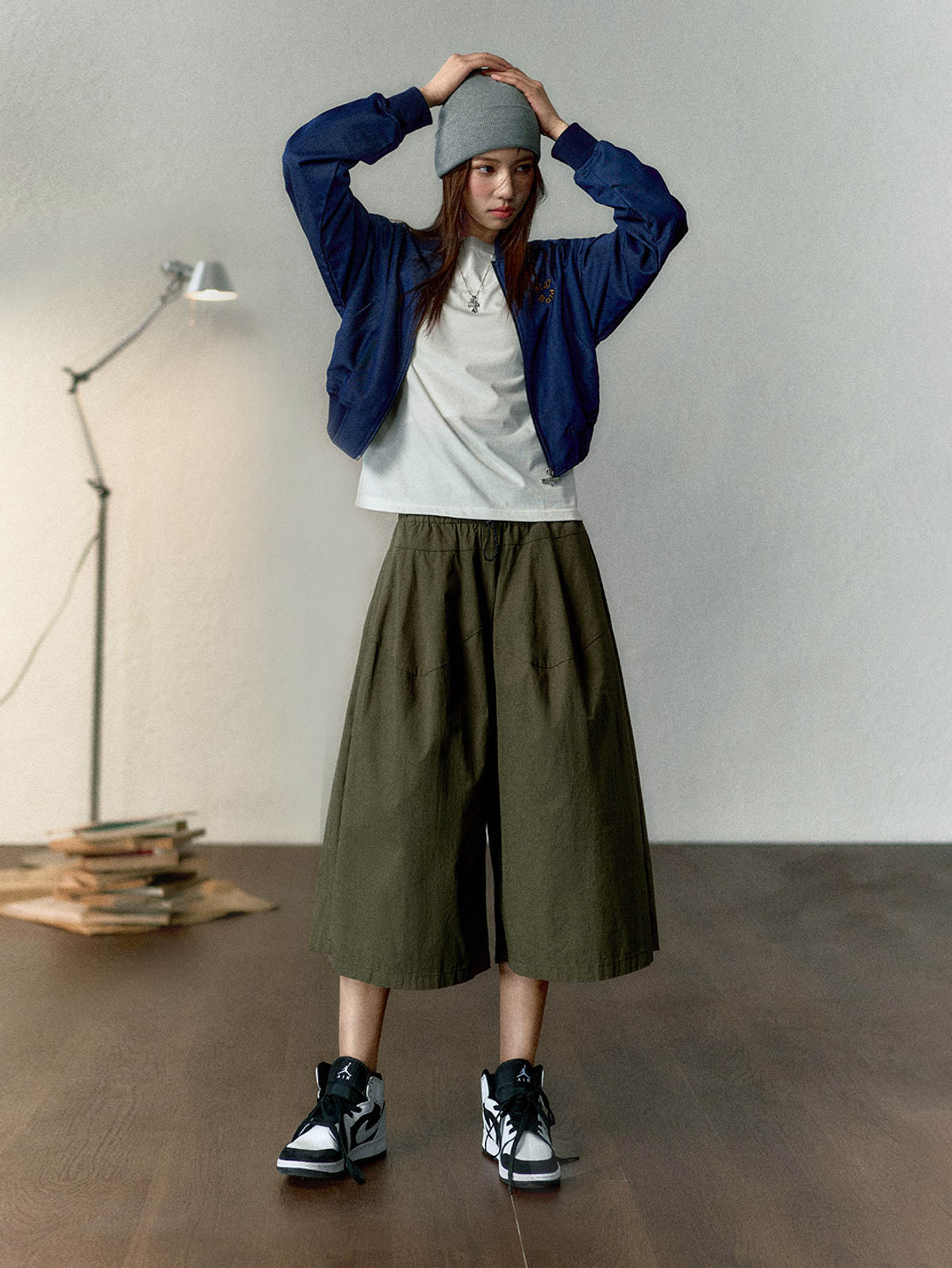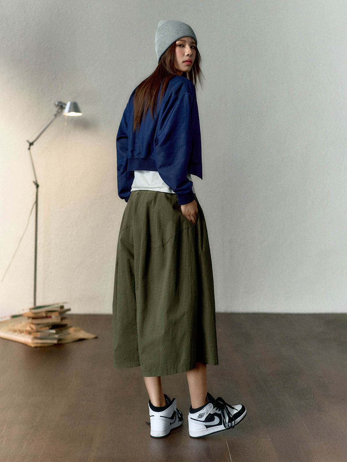 このワークスカートパンツは、100%コットン素材を使用し、快適性と通気性を保証します。遠くから見るとスカートのようで、近くで見るとワイドパンツであるという独特なデザインが、美しさと実用性を兼ね備えています。ミッドウエストのデザインにゴムとドローストリングを組み合わせることで、下半身のラインを美しく整え、あらゆる体型に適しています。軽く広がるAラインシルエットが全体のファッション性を高め、モスグリーンの色合いが自然な癒しの雰囲気を醸し出し、日常のカジュアルや通勤に最適な選択となります。
