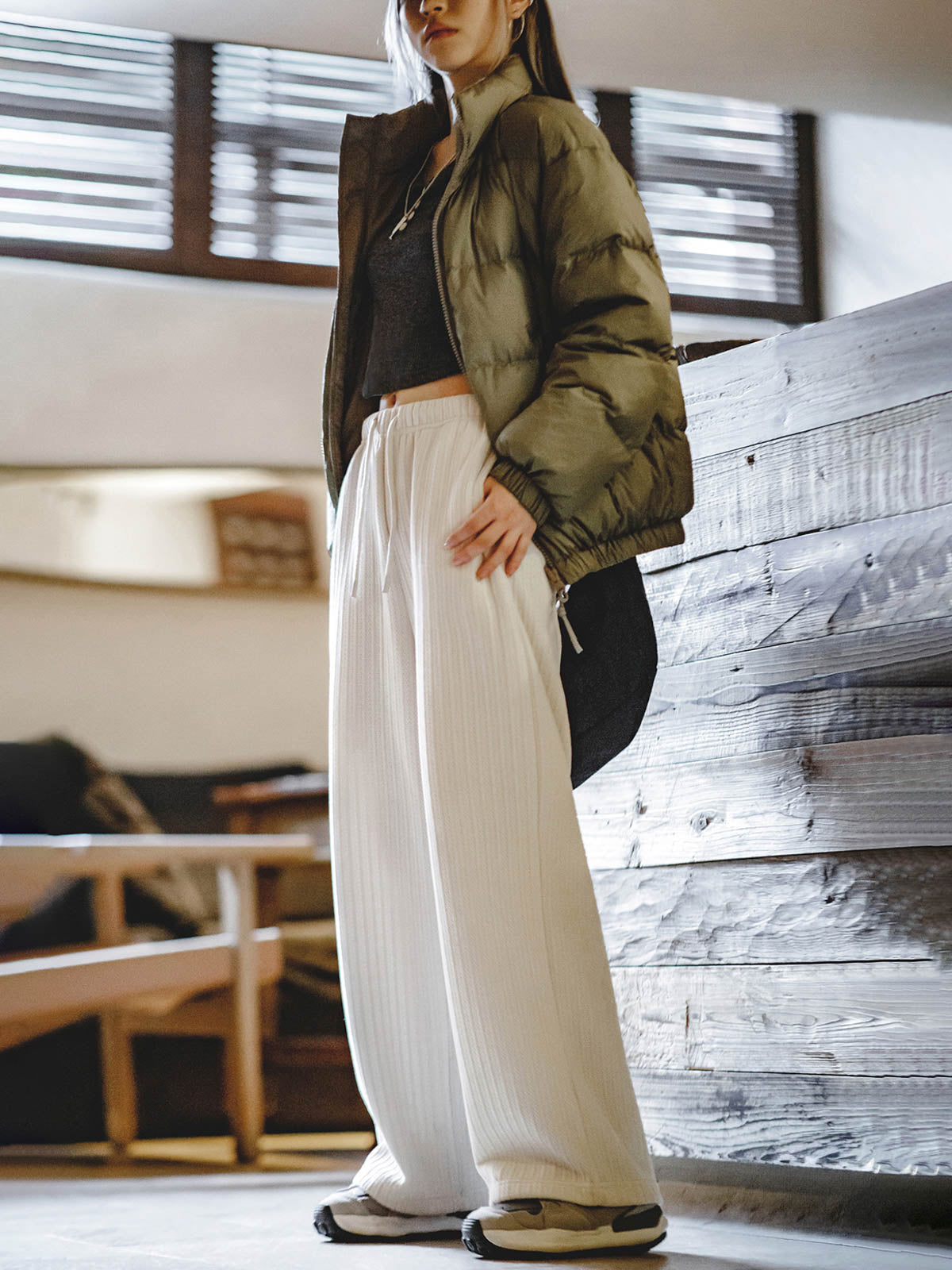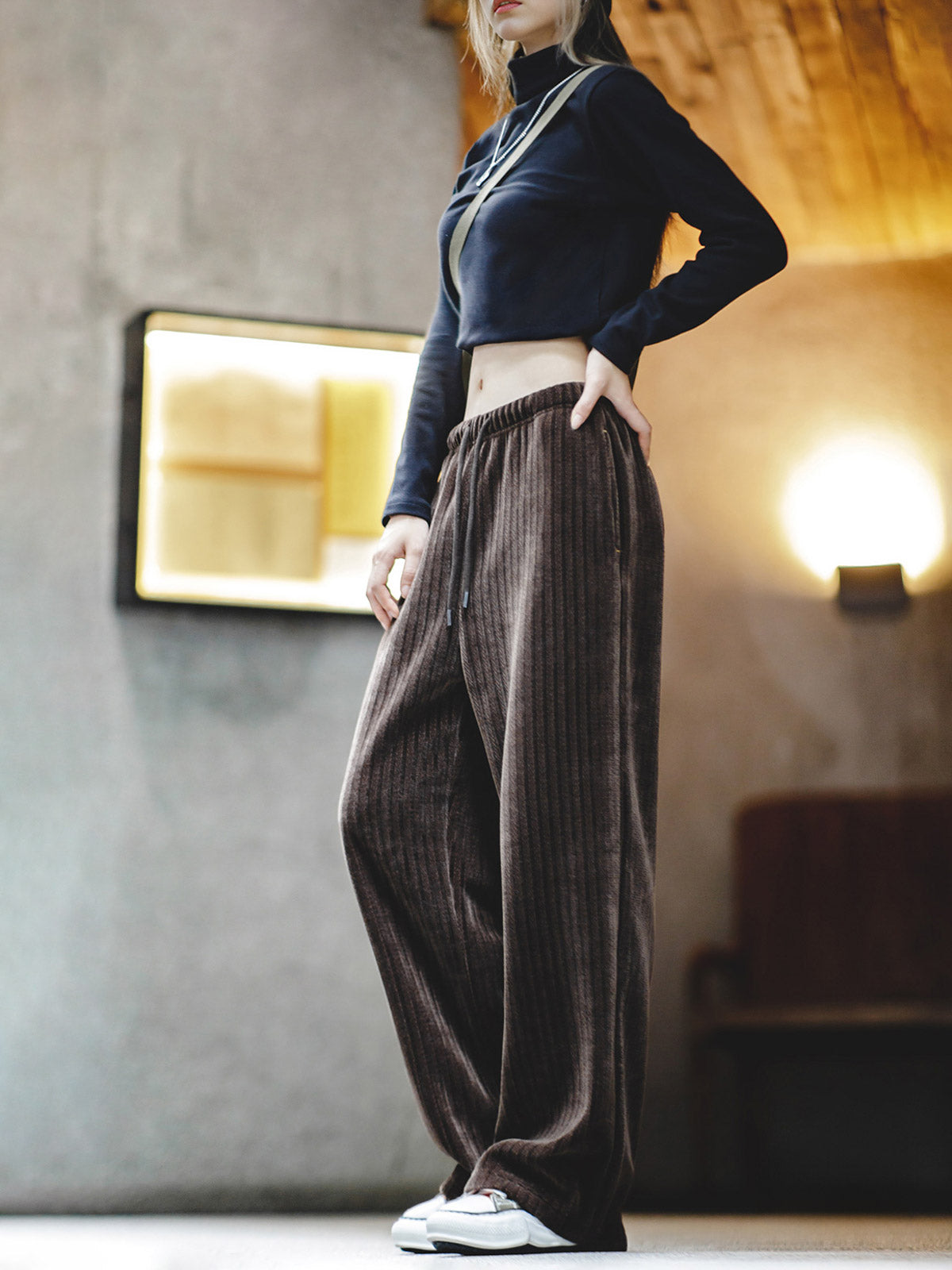 このシェニールワイドパンツは、99.6%ポリエステルと0.4%ポリウレタン製で、質感がアップグレードされており、スリムな効果が際立ちます。ミッドウエストデザインが腰の快適さを増し、ワイドなシルエットが脚のラインを美しく見せます。適切な丈がさらなるスリム効果を引き出します。シェニールのジャカード技術により、表面のコーデュロイ感が鮮明で、視覚的なボリュームを抑え、テクスチャー感を増します。シンプルでクリーンな見た目を提供します。オフホワイトとダークブラウンの2色展開で、ライトカラーは柔らかく、多彩なスタイルに対応し、ダークカラーは秋冬の質感を高めます。ドローストリングとゴムウエストデザインにより、多様なコーディネートに対応し、ワードローブの定番アイテムになります。