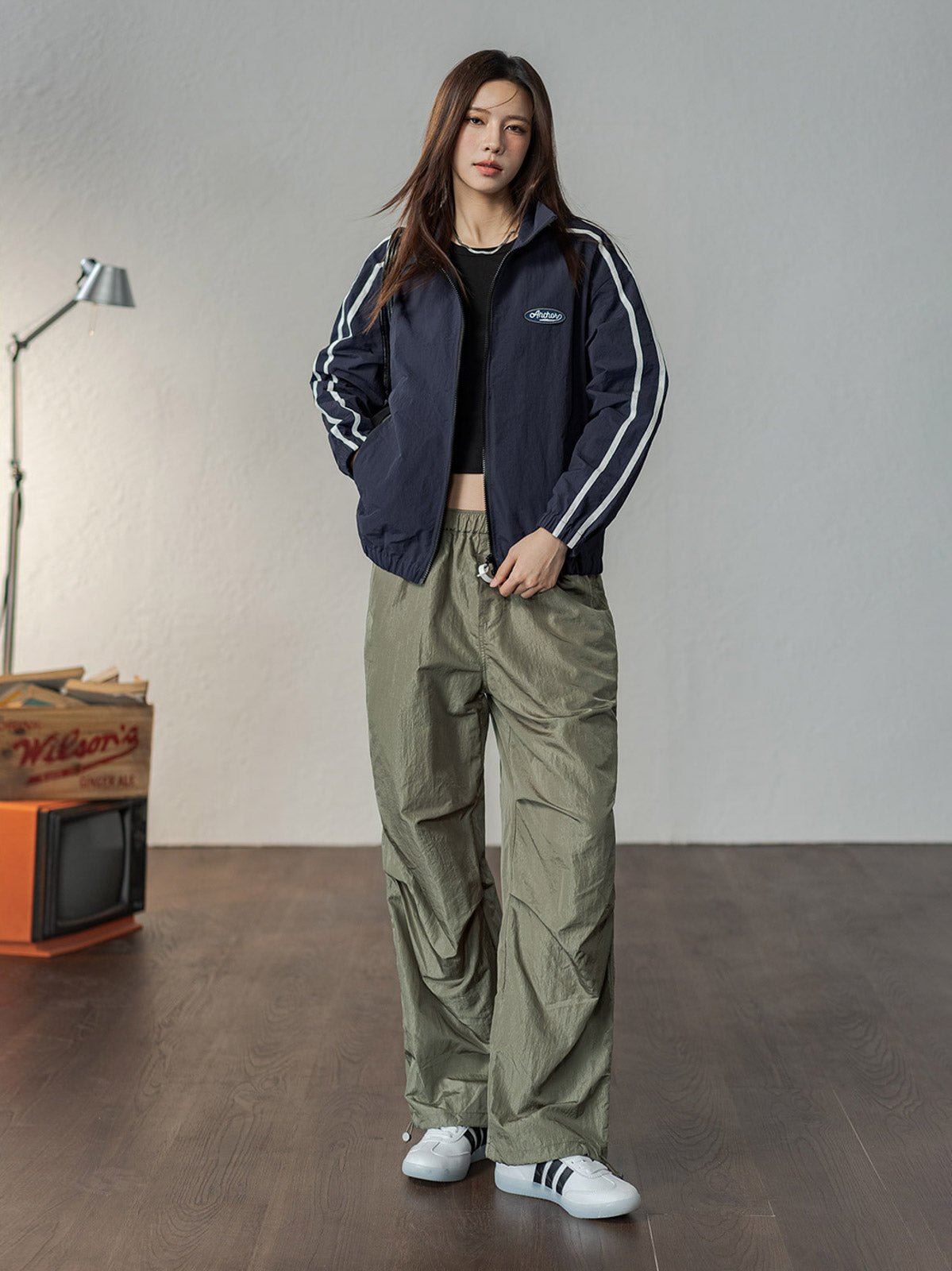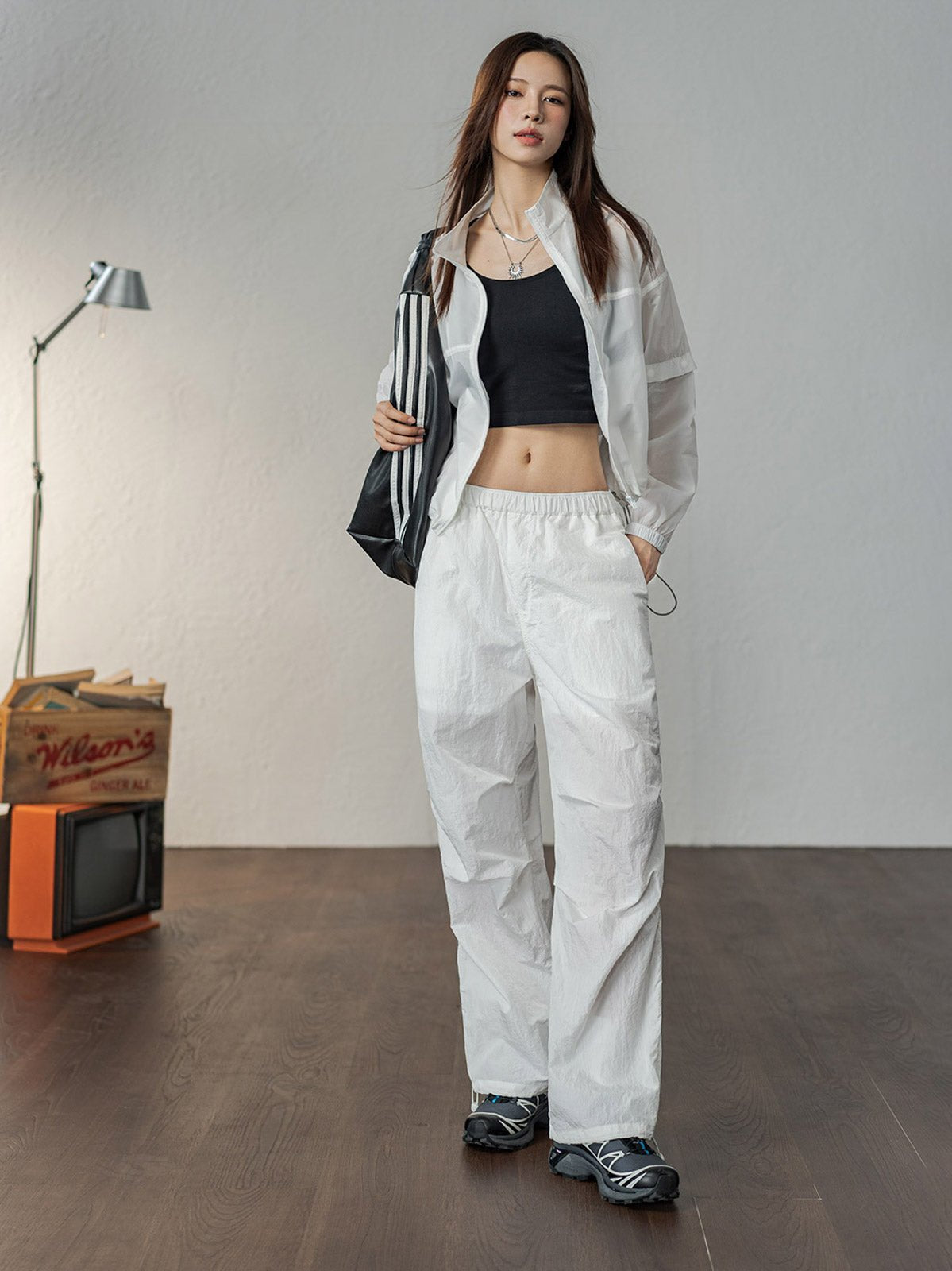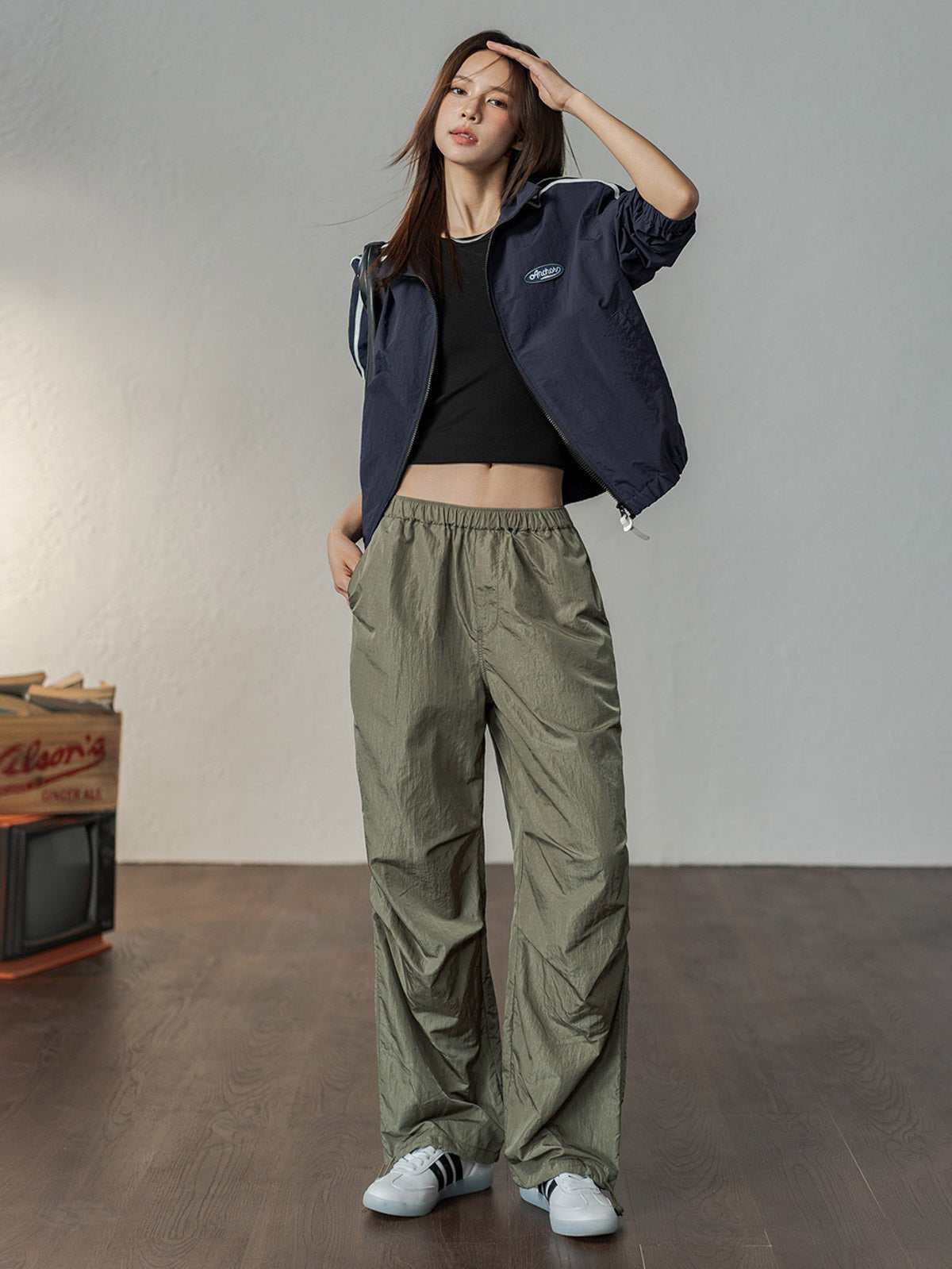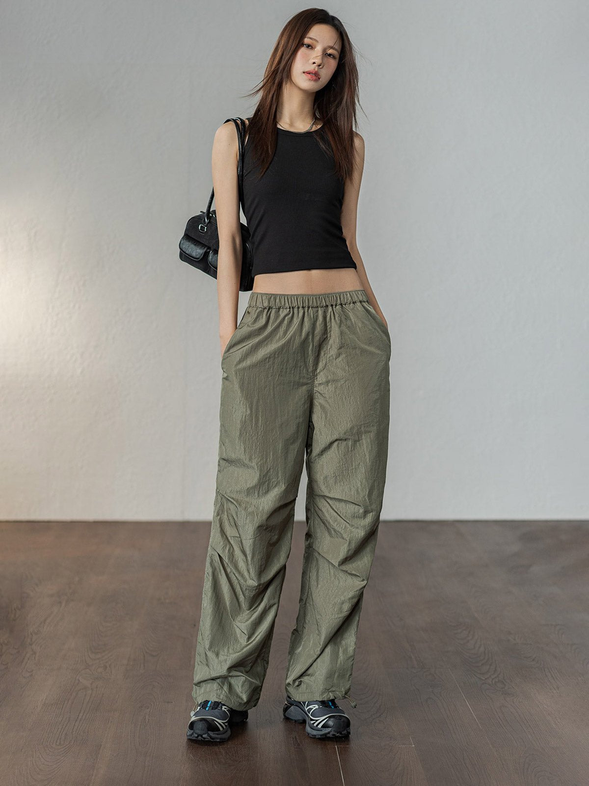 このパラシュートパンツは90g/m²の織物素材を使用し、軽量で通気性が良く、穿いた瞬間に風を感じる爽やかな着心地が特徴です。上半分は二重構造で透けにくく、下半分は半透明のドレープデザインで、脚のラインをほのかに見せつつ視覚的に縦長効果を演出します。裾にはドローコードが付いており、ストレートからジョガーシルエットに簡単に切り替え可能です。清涼感のあるホワイトとクラシックなグリーングレーの2色展開で、Y2K、ヴィンテージストリート、グラプロコアスタイルなど様々なファッションにマッチします。タイトなトップスやその他のアイテムと組み合わせることで、独自のスタイルを引き立てます。